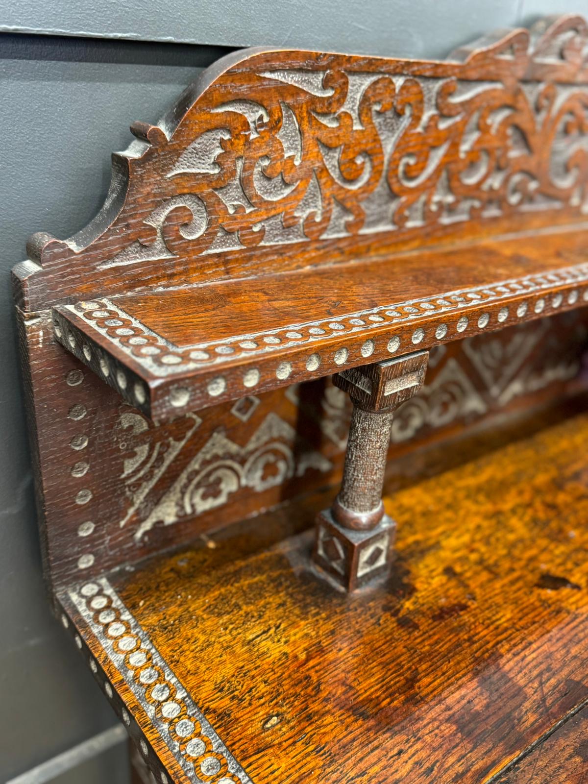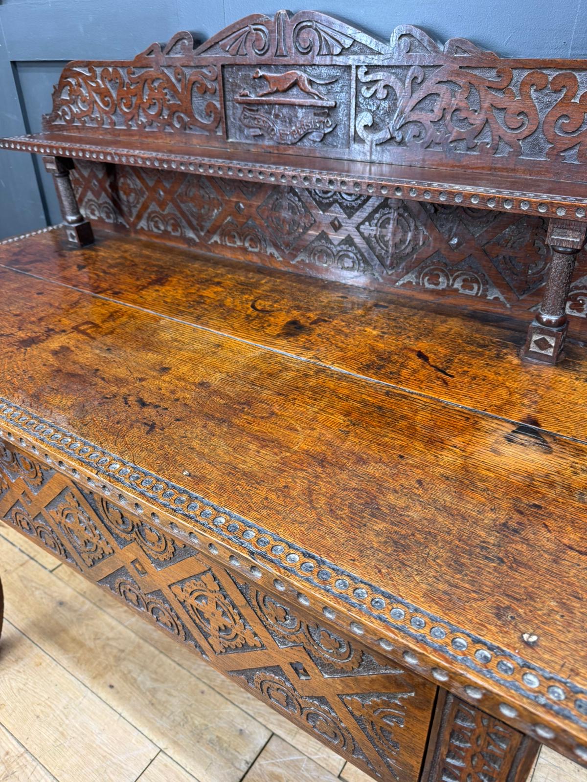 A striking antique Anglo-Indian carved oak hall table, dating to around 1900 and decorated throughout with deep relief carving, geometric chip-cut borders and a beautifully pierced cresting rail. The raised superstructure shelf is typical of British-India furniture made for export, and the front features a single drawer with carved facade. The top back crest rail features the moto “PRAESTO ET PERSISTO”