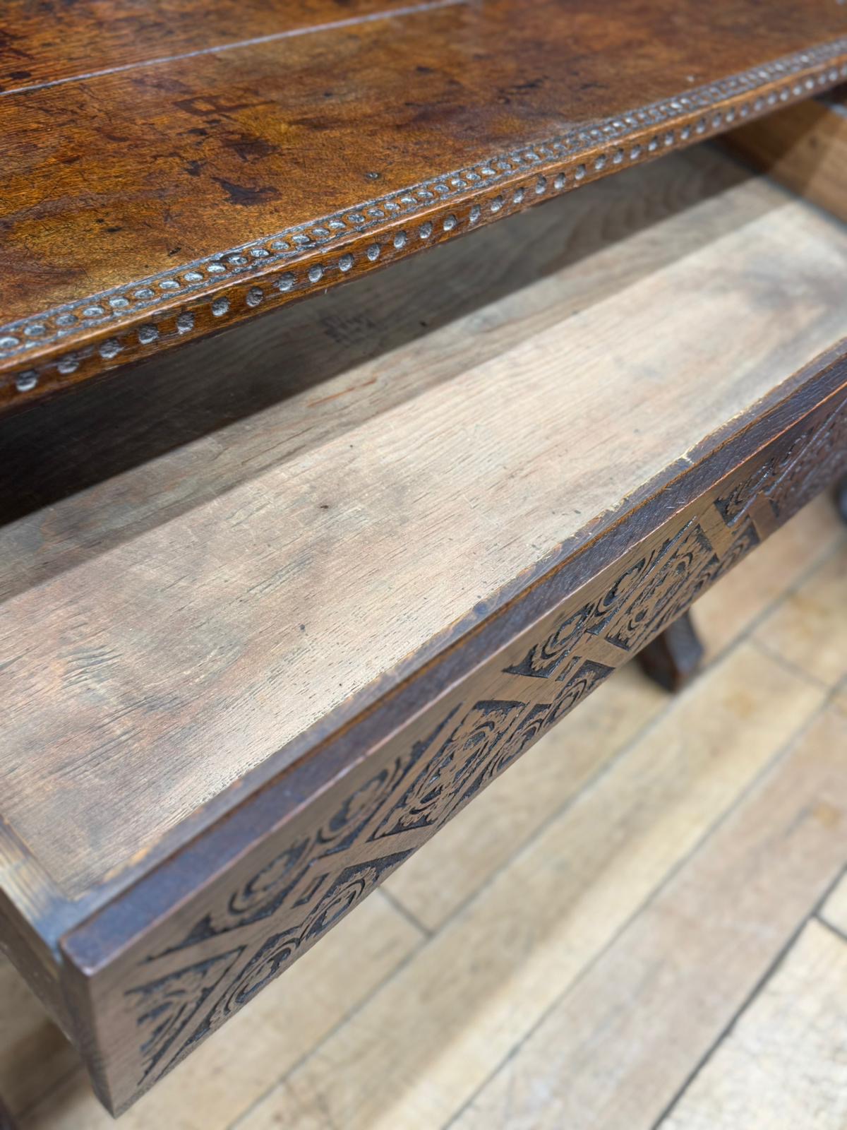 Solid and sturdy. Age-related wear, surface marks, polish variations and old imperfections to the top, all in keeping with age and the hand-carved nature. Drawer runs well. Overall presents beautifully.