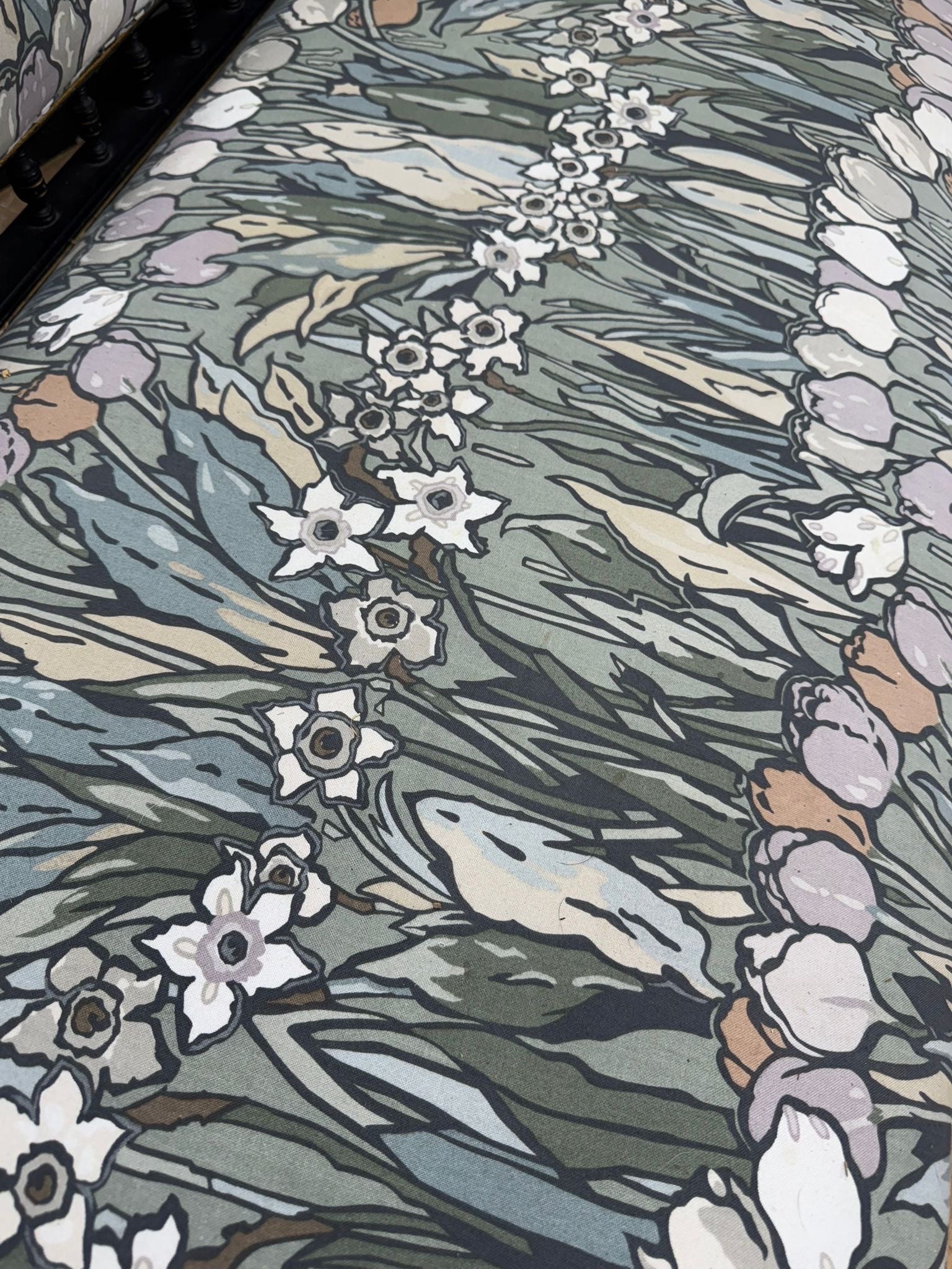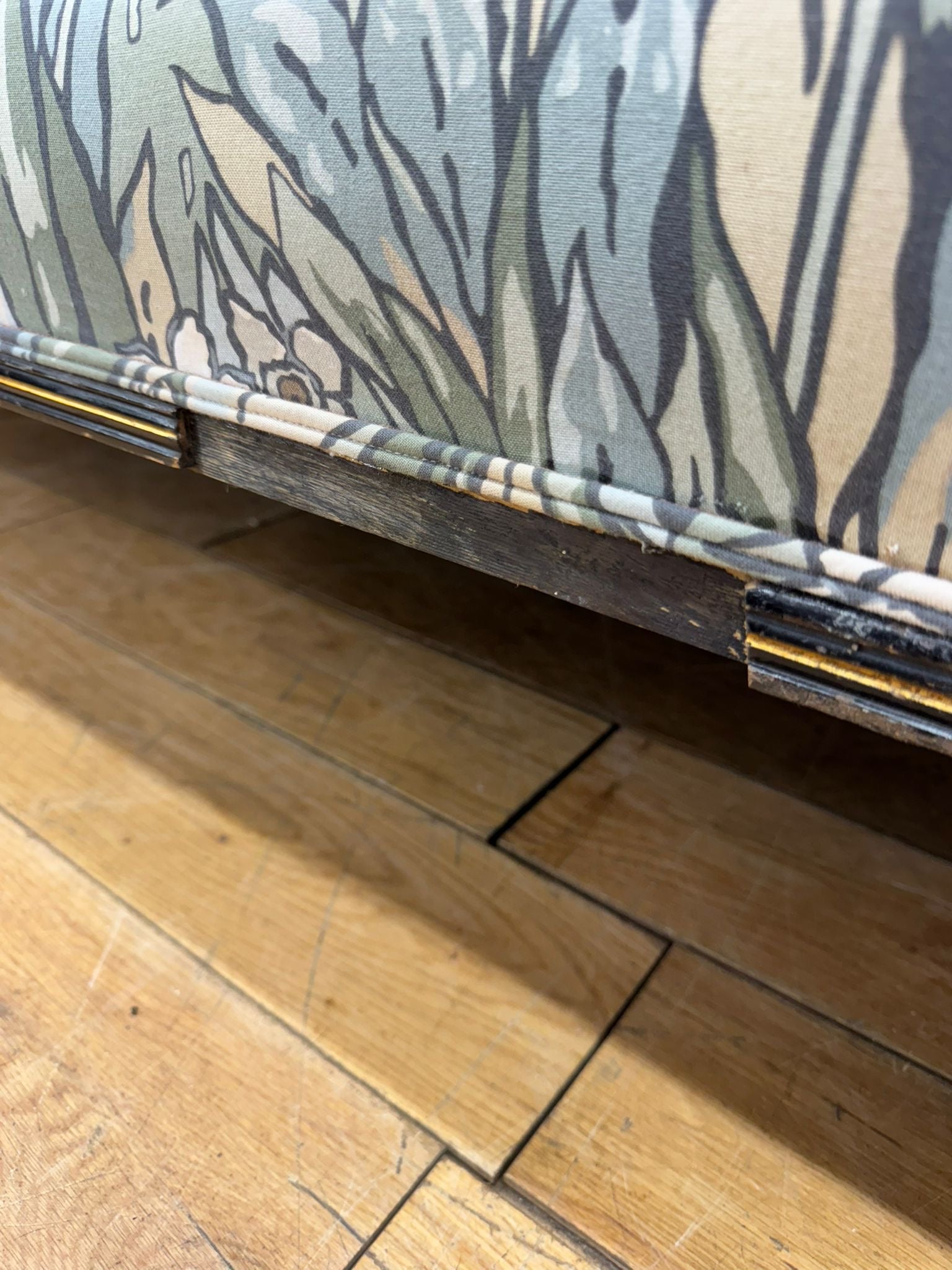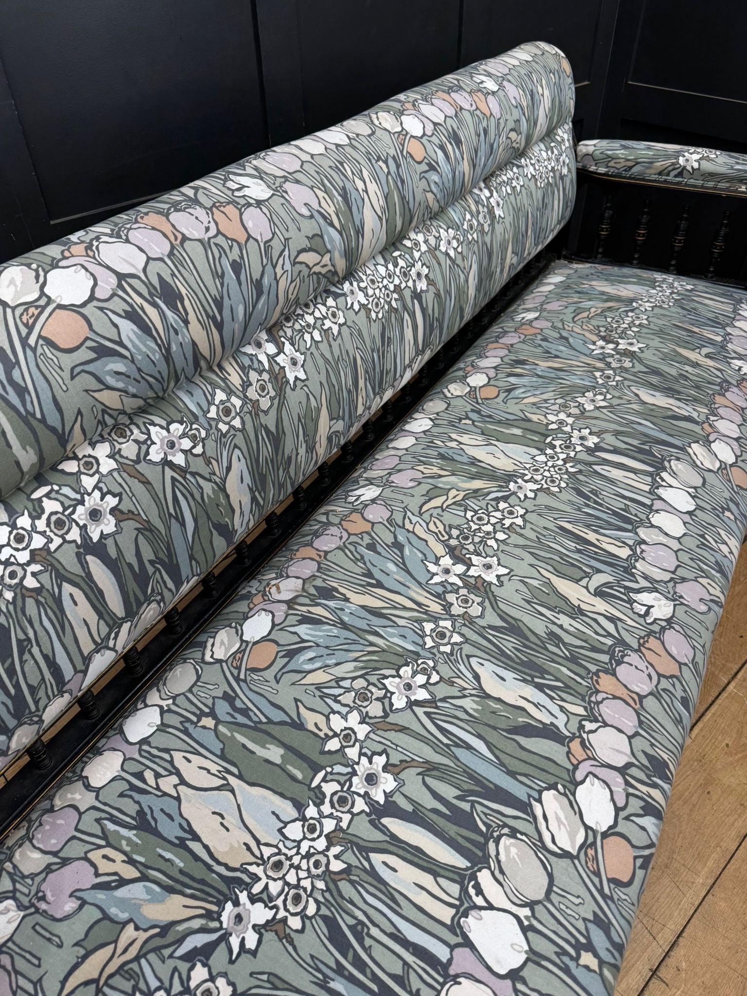 Upholstered in Sanderson fabric, which complements the Arts & Crafts aesthetic perfectly. A striking statement piece that bridges antique craftsmanship with timeless pattern design.