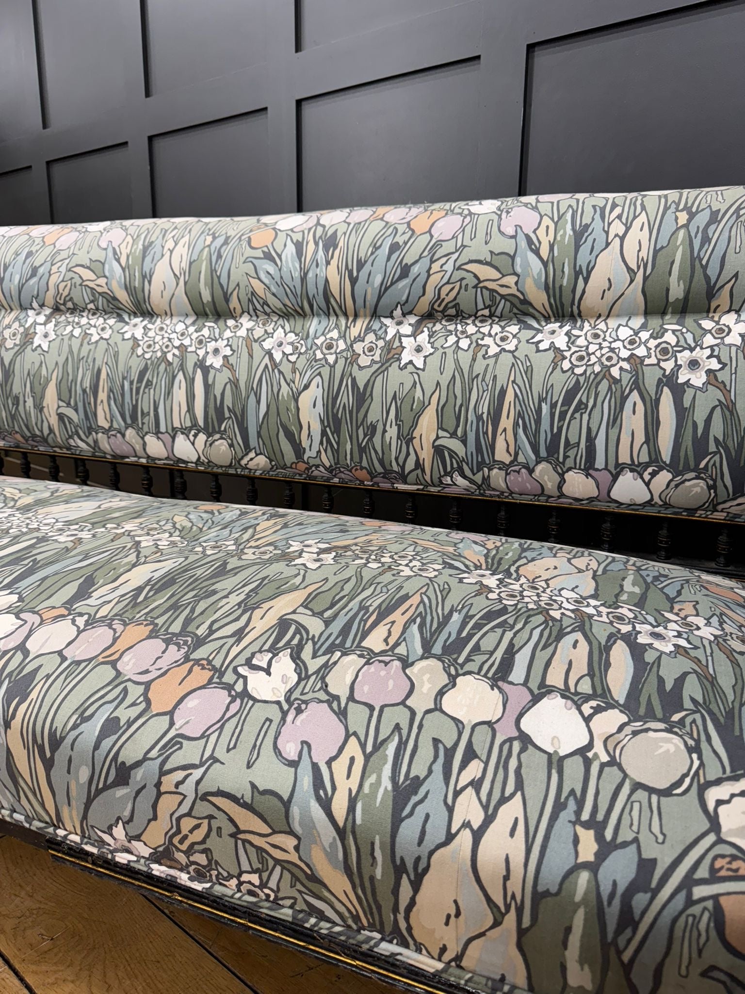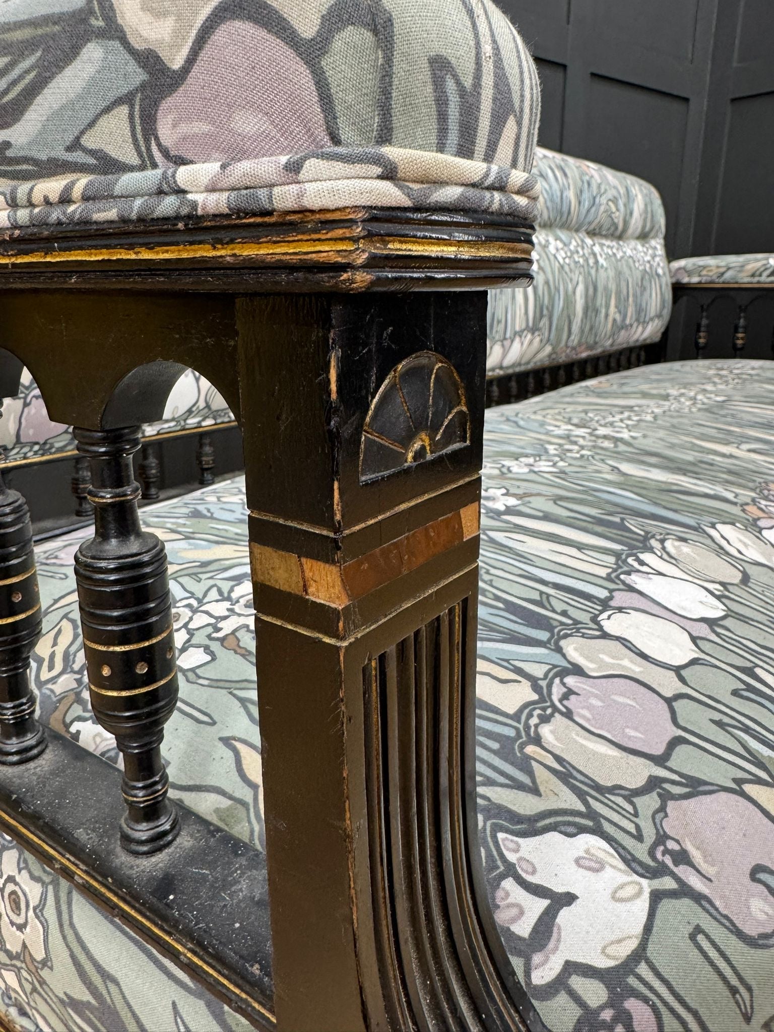 Beautiful late 19th to early 20th century Aesthetic Movement sofa with an ebonised and inlaid frame. The design features turned spindle supports, gilt line detailing, and decorative fan motifs typical of the period.