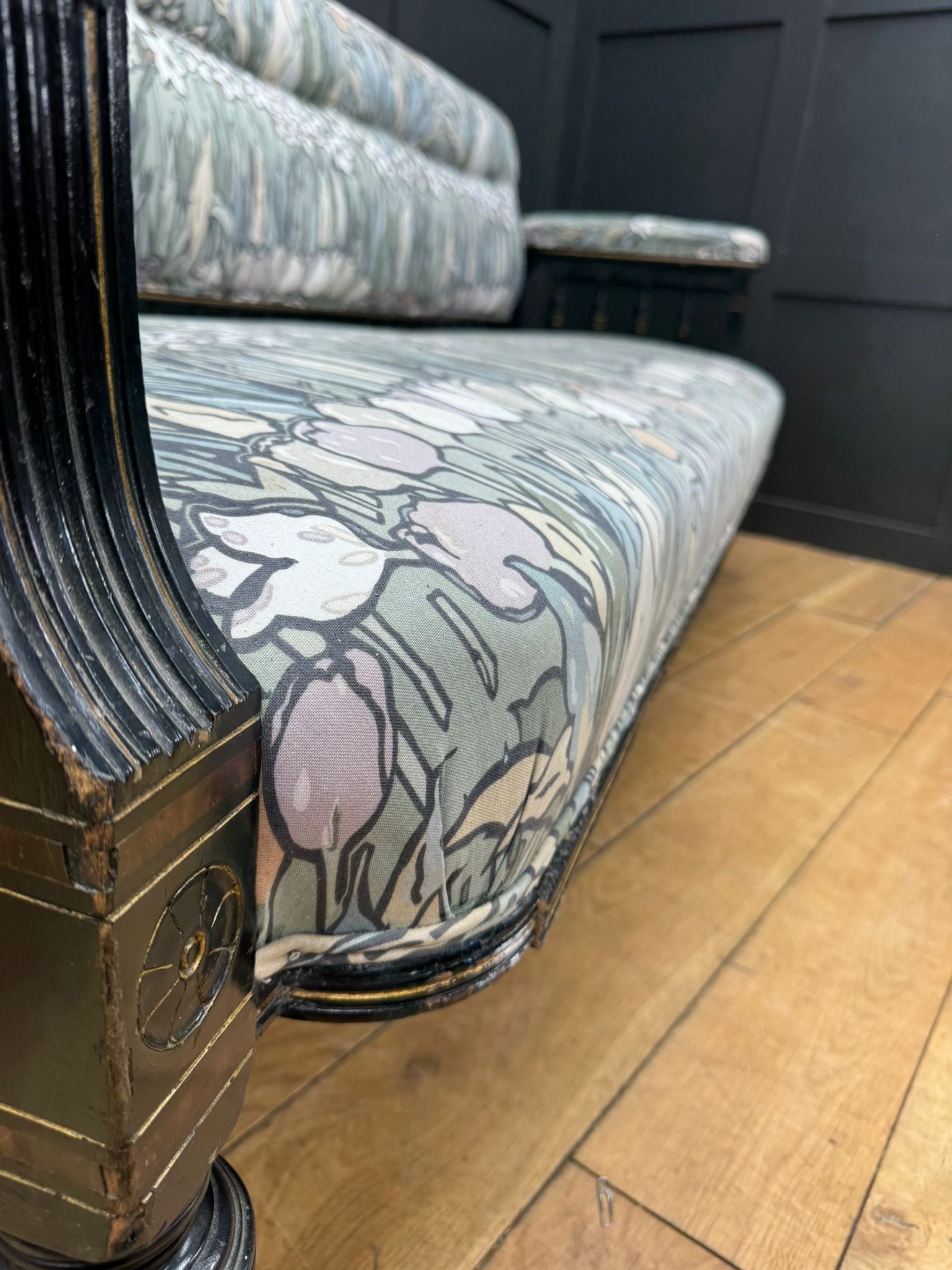 Antique Ebonised Arts & Crafts Settee – Inlaid Frame Vintage Sofa Couch