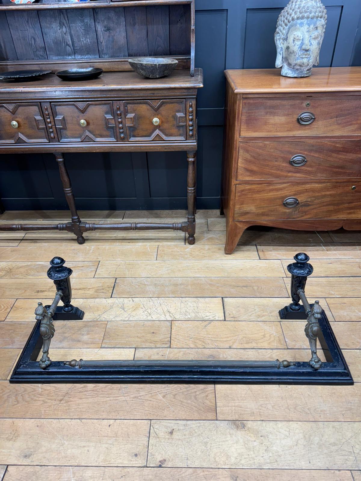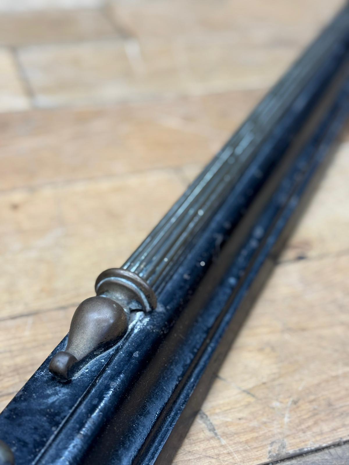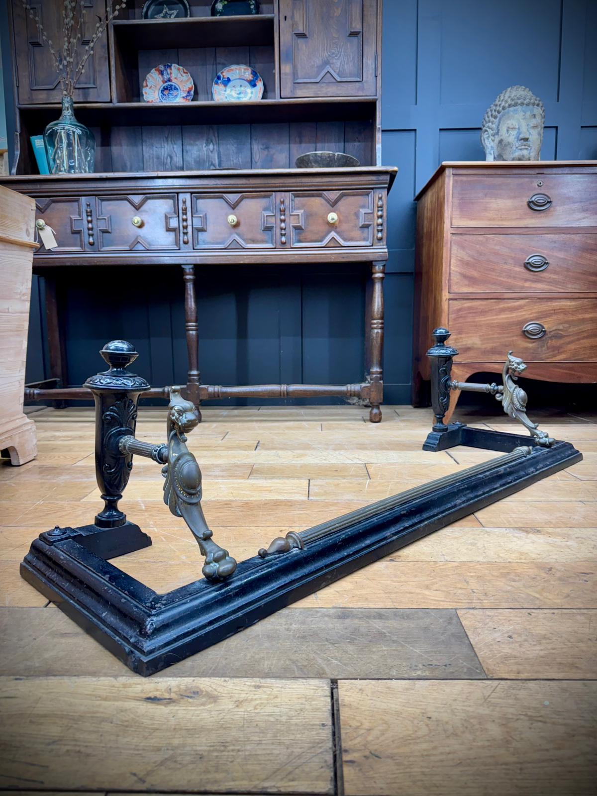A striking late 19th to early 20th century cast iron fireplace fender with detailed brass griffin terminals and reeded centre bar. Heavy and beautifully made, perfect for adding a touch of grandeur to any hearth or period interior.
