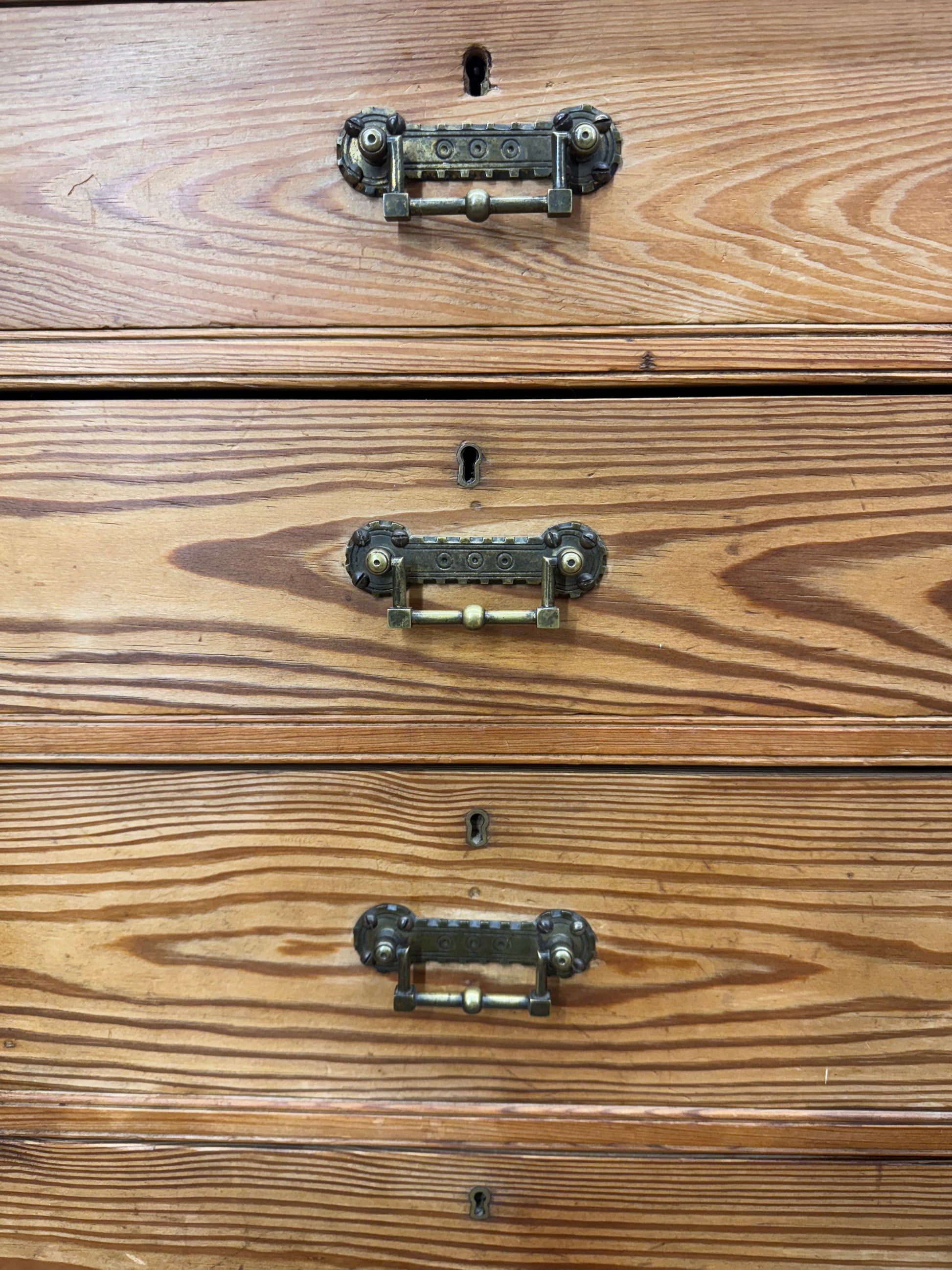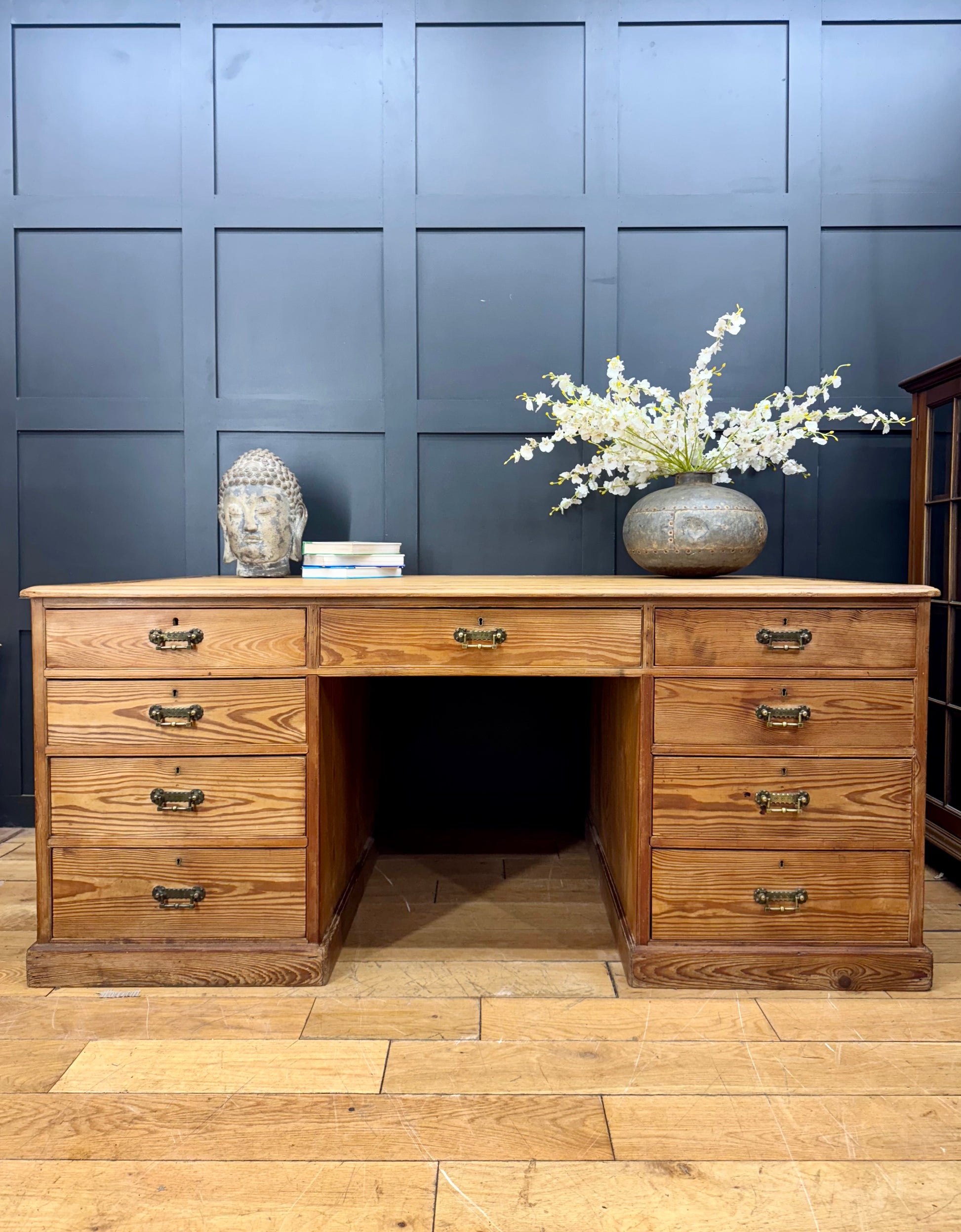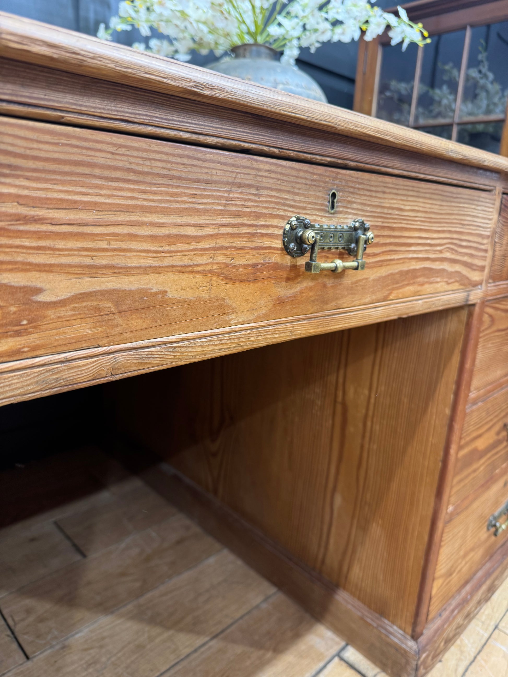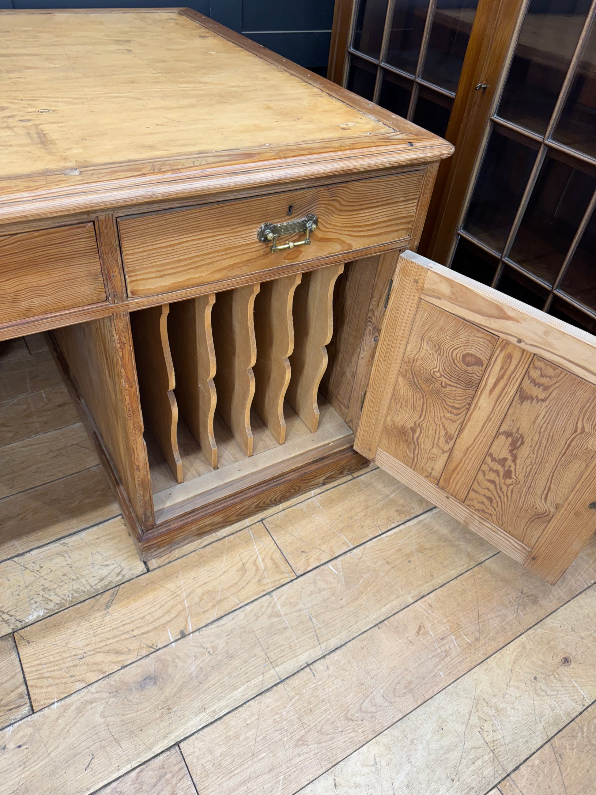 A large antique 19th.C pitch pine pedestal desk with wooden top.