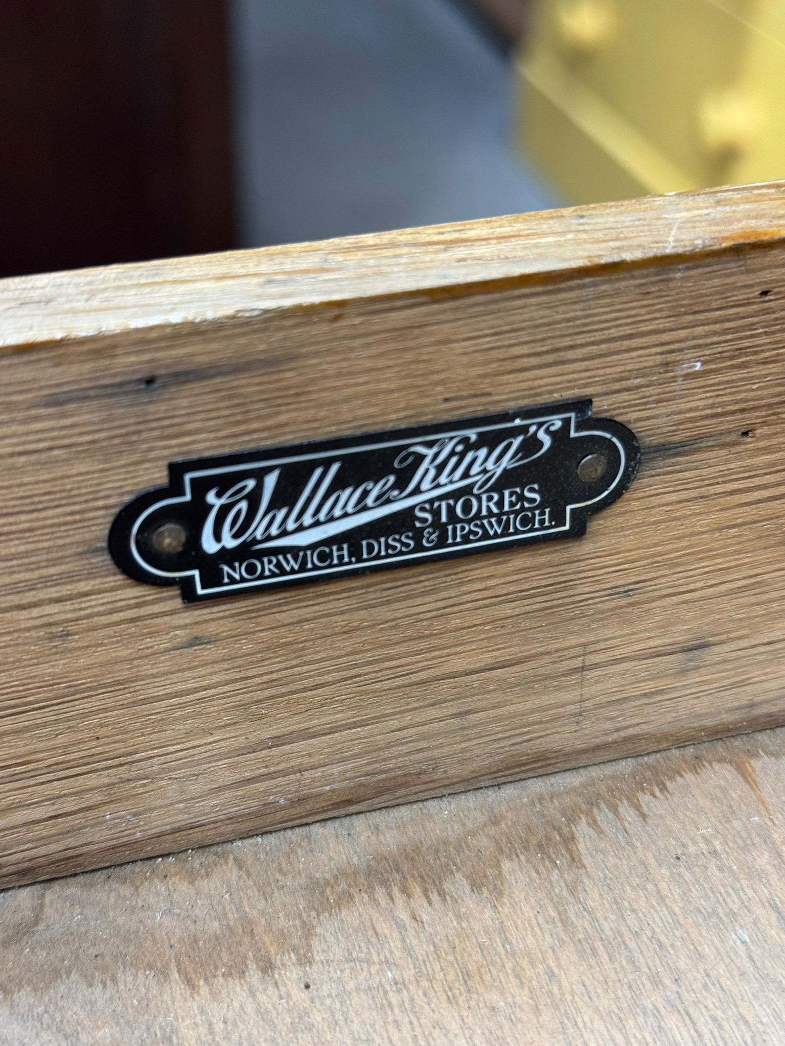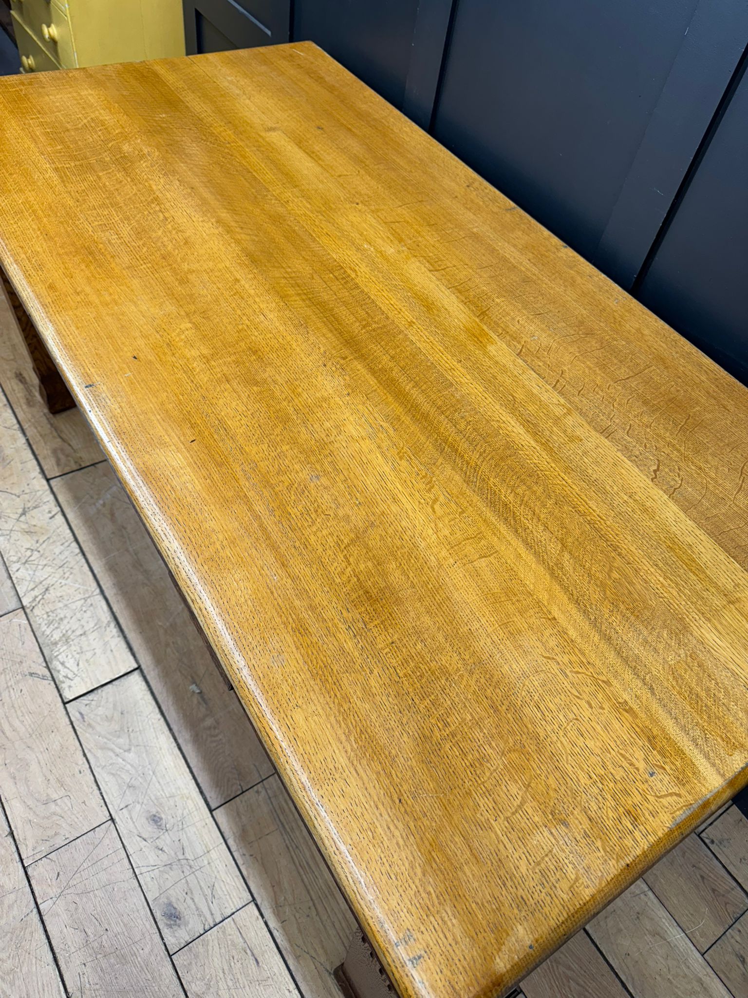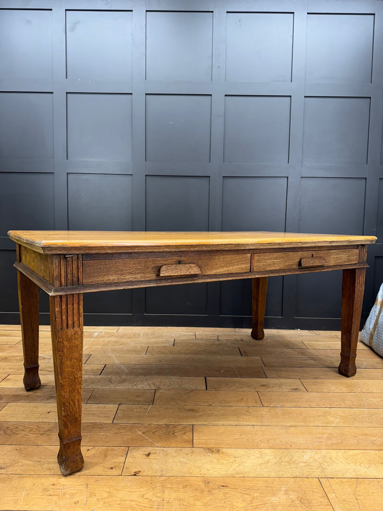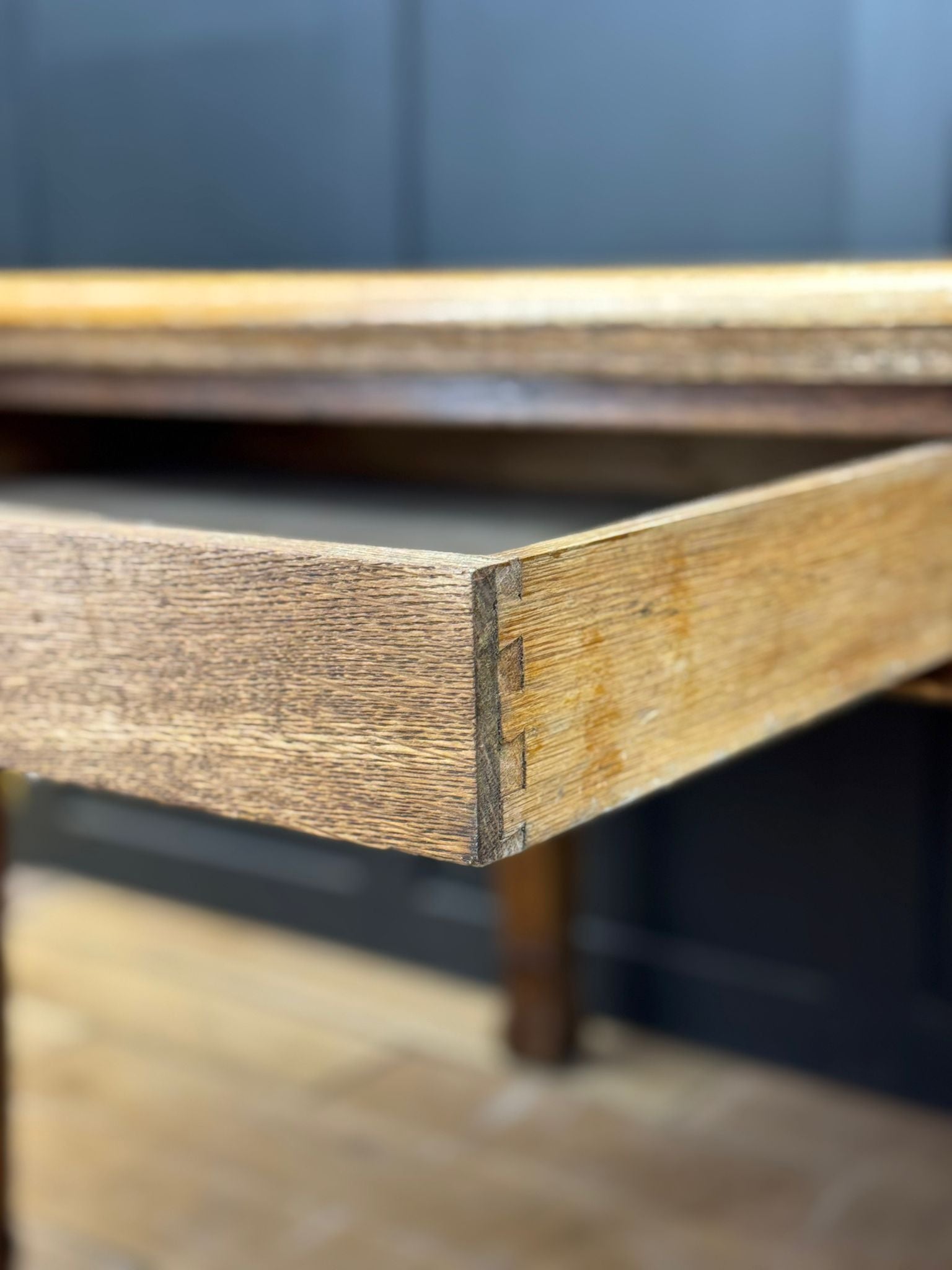 A very heavy and well-made solid oak writing table / library table, retailed by Wallace King’s Stores (Norwich, Diss & Ipswich), early 20th century. This piece features: • Two full-length drawers with original shaped oak pulls. • Sturdy reeded legs with block feet. • Golden oak top with plenty of character and age-related wear. • Dovetail drawer construction and solid craftsmanship throughout. • Wallace King’s Stores retailer’s label inside the drawer. A handsome, practical desk or centre table, offering plenty of knee height and generous proportions. Perfect for use as a writing desk, study table or even as a stylish work-from-home piece. Condition In good, solid order. Age-related marks, wear and surface character as shown — consistent with many decades of use. One drawer interior has a large ink stain, a reminder of its long practical use. Structurally sound, drawers run smoothly. Dimensions • Length: 168 cm • Width: 85 cm • Height: 77 cm • Knee height: 61 cm Please be aware that this item does show signs of use, which is to be expected considering its age. These signs of wear add authenticity to the item. We recommend carefully studying the pictures as they form a significant part of the description. Thank you. Feel free to explore our other available items. Our collection includes a variety of pieces ranging from rustic, antique, vintage to industrial. OUR DELIVERY SERVICE We utilize a reliable and experienced courier service for all deliveries. If you have any questions or concerns regarding delivery, please do not hesitate to contact us. Our goal is to deliver most large items within 14 days. Delivery Scheduling: The customer will be contacted by the Courier a few days before delivery to confirm the day and approximate time. Please note that all delivery prices quoted in listings are for England only. Deliveries to other areas such as Scotland, Wales and certain parts of Cornwall are subject to negotiation. Thank you. |