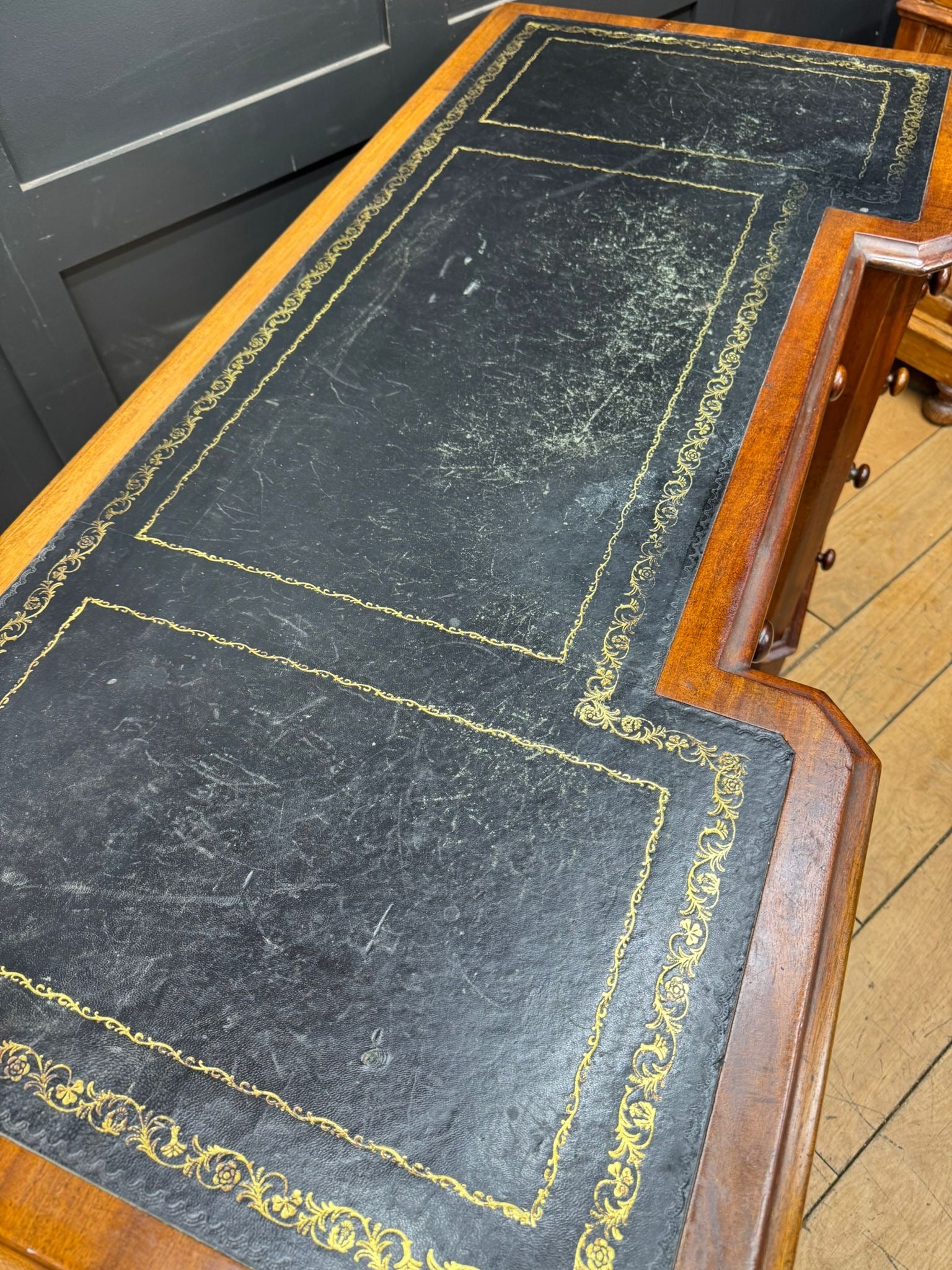 The top is fitted with a black leather writing surface with gilt tooling, showing attractive age-related wear and patina. The mahogany has a warm, rich tone with good grain and honest signs of use, giving it real period character.