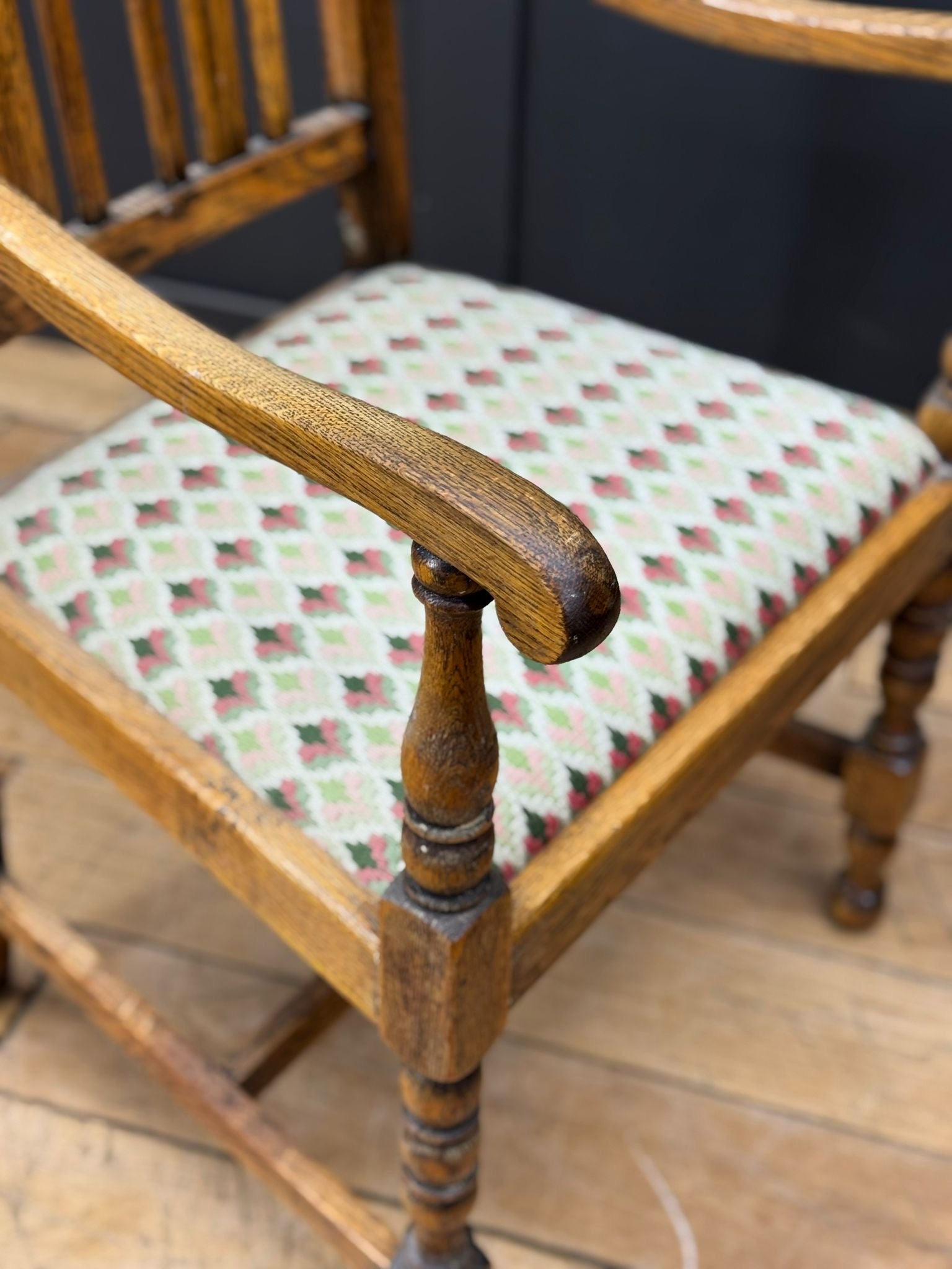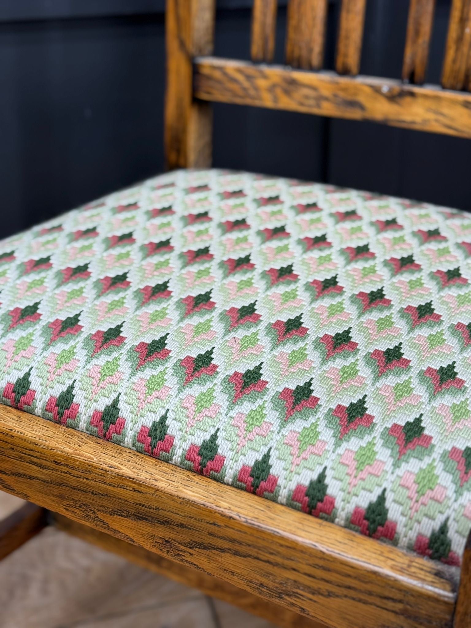This piece has lovely proportions and retains its original character with a warm aged patina. The seat has been reupholstered in a needlepoint-style fabric in soft greens, pinks and reds which complements the oak perfectly. Ideal as a dining chair, desk chair or occasional statement piece.