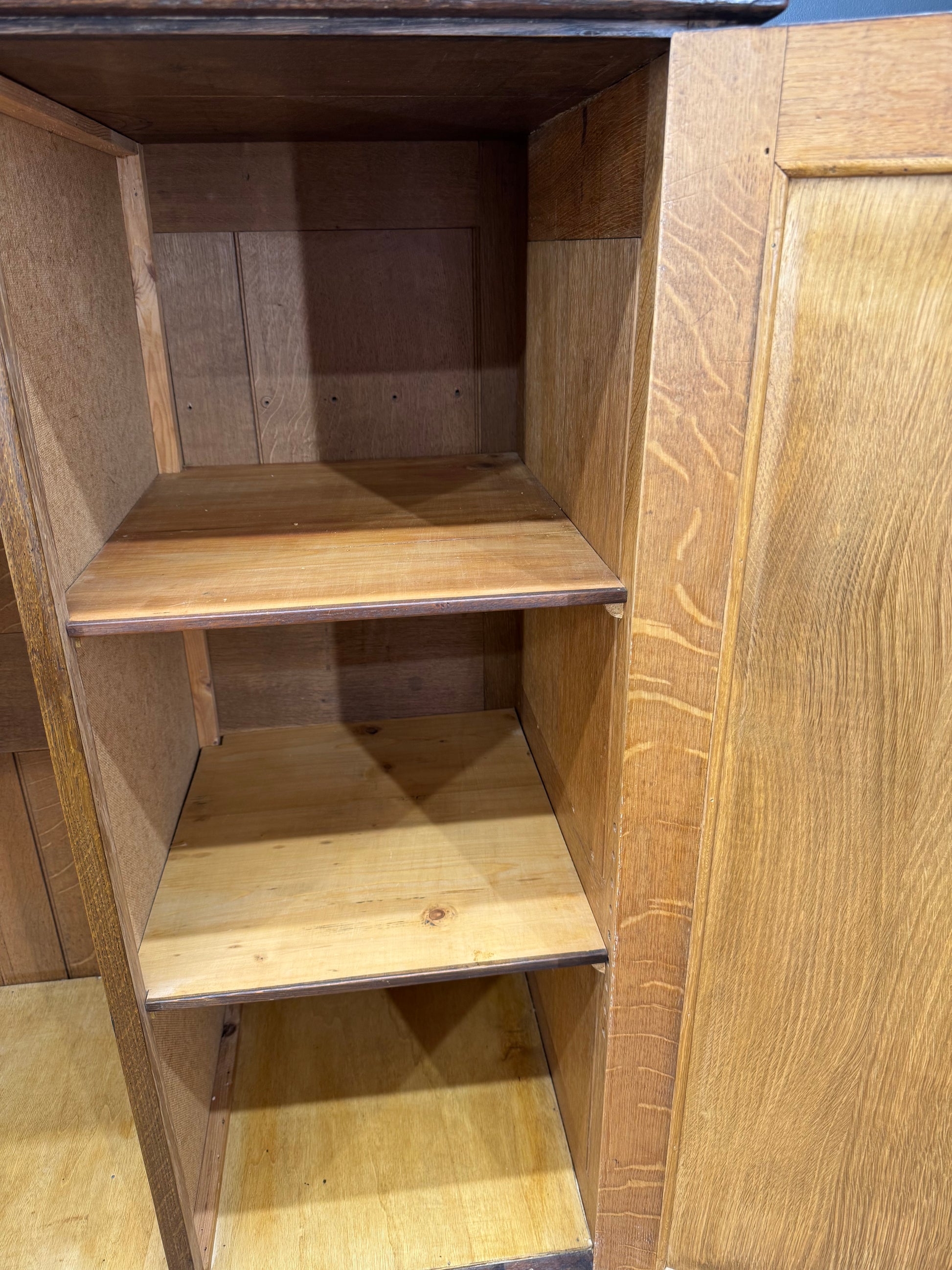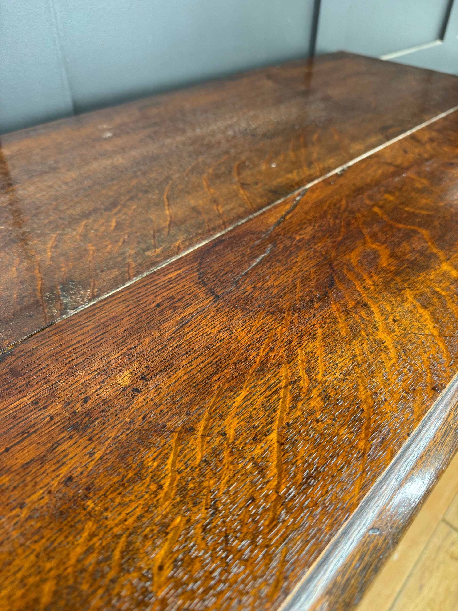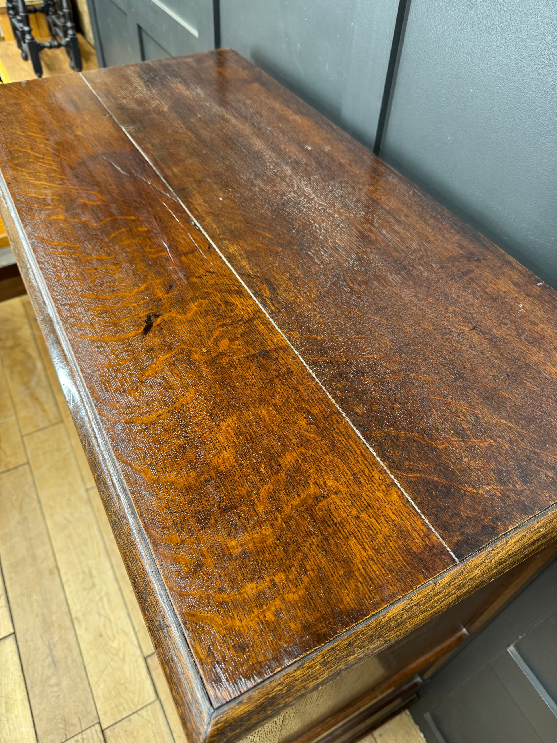 Good antique condition with age-related wear and marks consistent with use. The top shows some characterful grain movement and light surface wear, adding to its authentic charm. Clean and solid throughout, drawers run smoothly and doors close well.