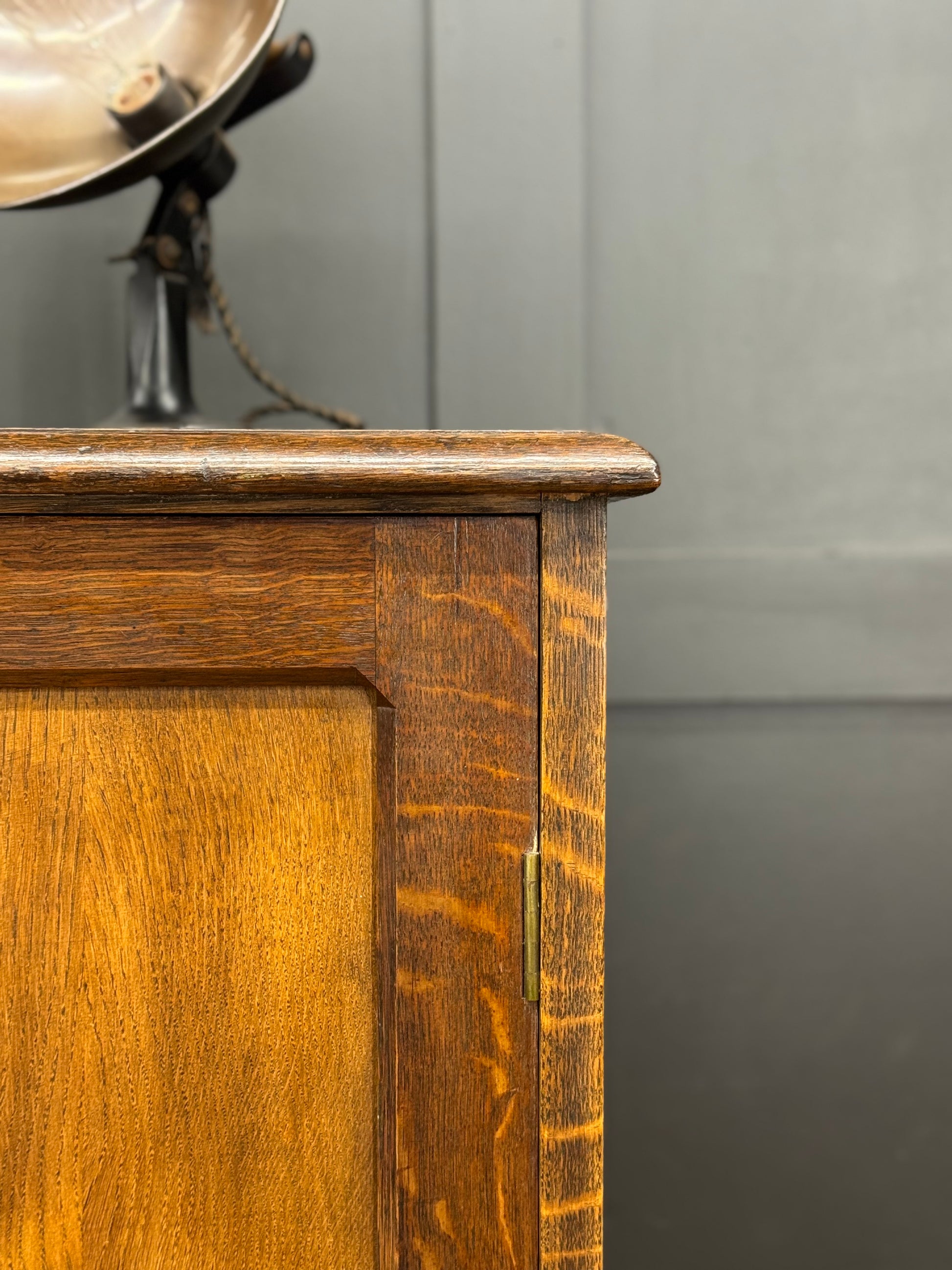 A charming early 20th-century solid oak wardrobe, beautifully crafted in classic English style. This compact piece features twin panelled doors, original brass hardware, and two lower drawers for added storage. Inside, you’ll find a practical layout with a hanging rail on one side and shelving on the other — ideal for modern use while retaining its period character.