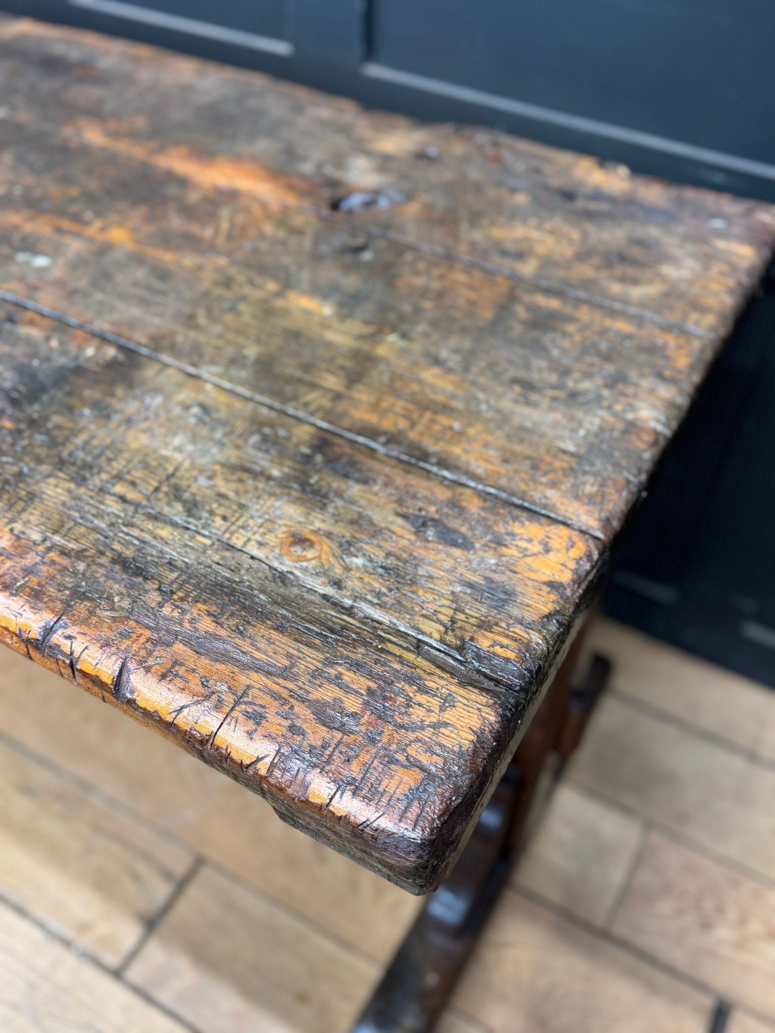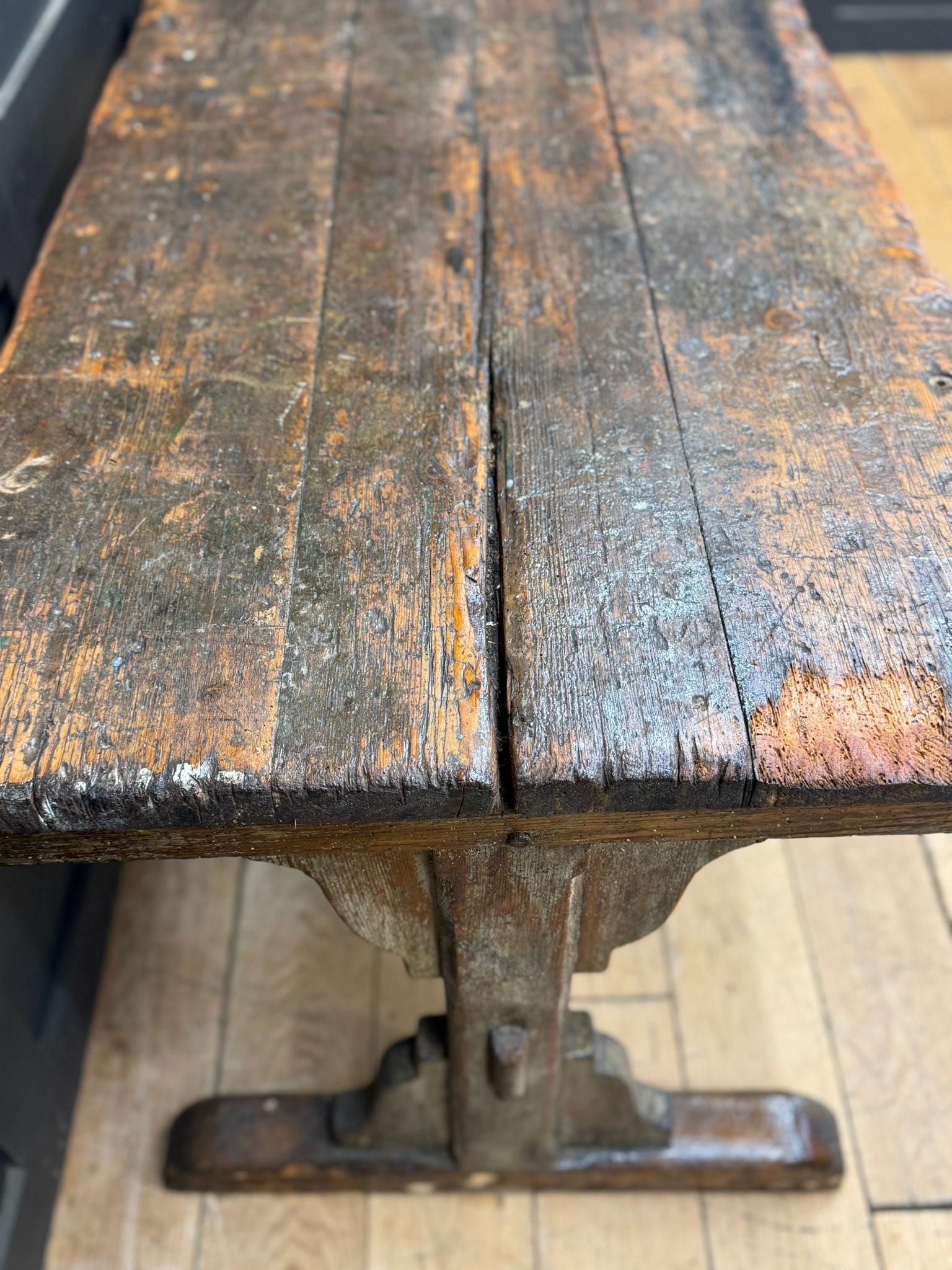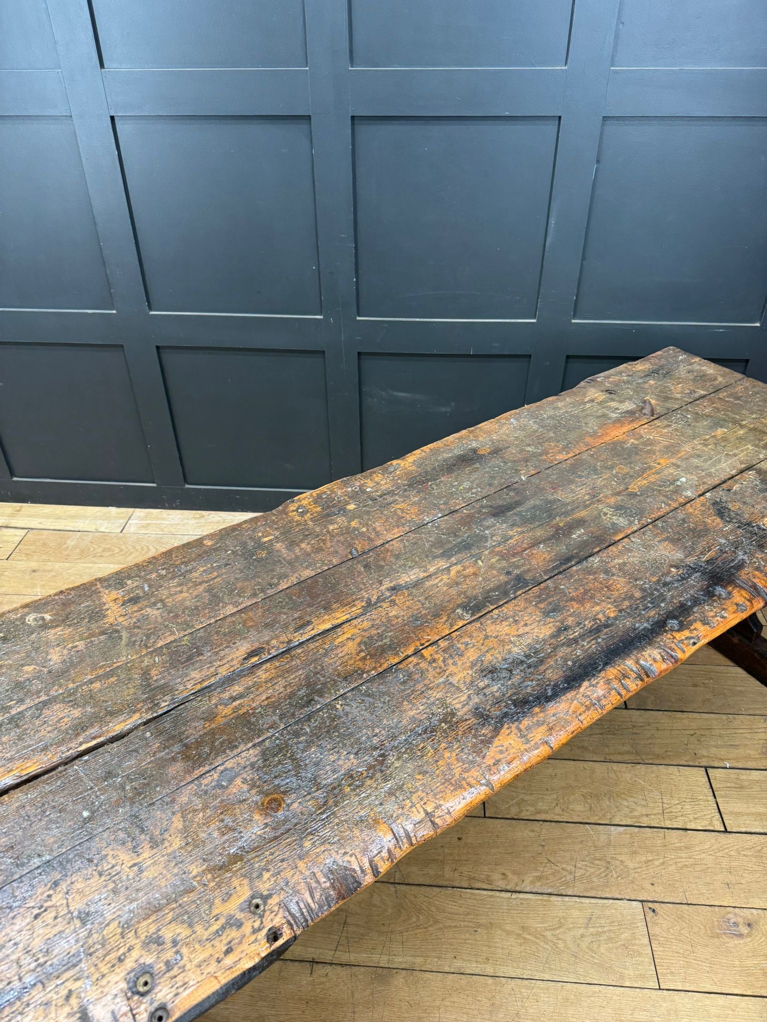 Constructed from thick, solid timber planks with a sturdy trestle-style base, it was originally made to survive daily punishment from kids, tools, and time. Ideal as a rustic kitchen prep table, potting bench, studio work table, or statement console.