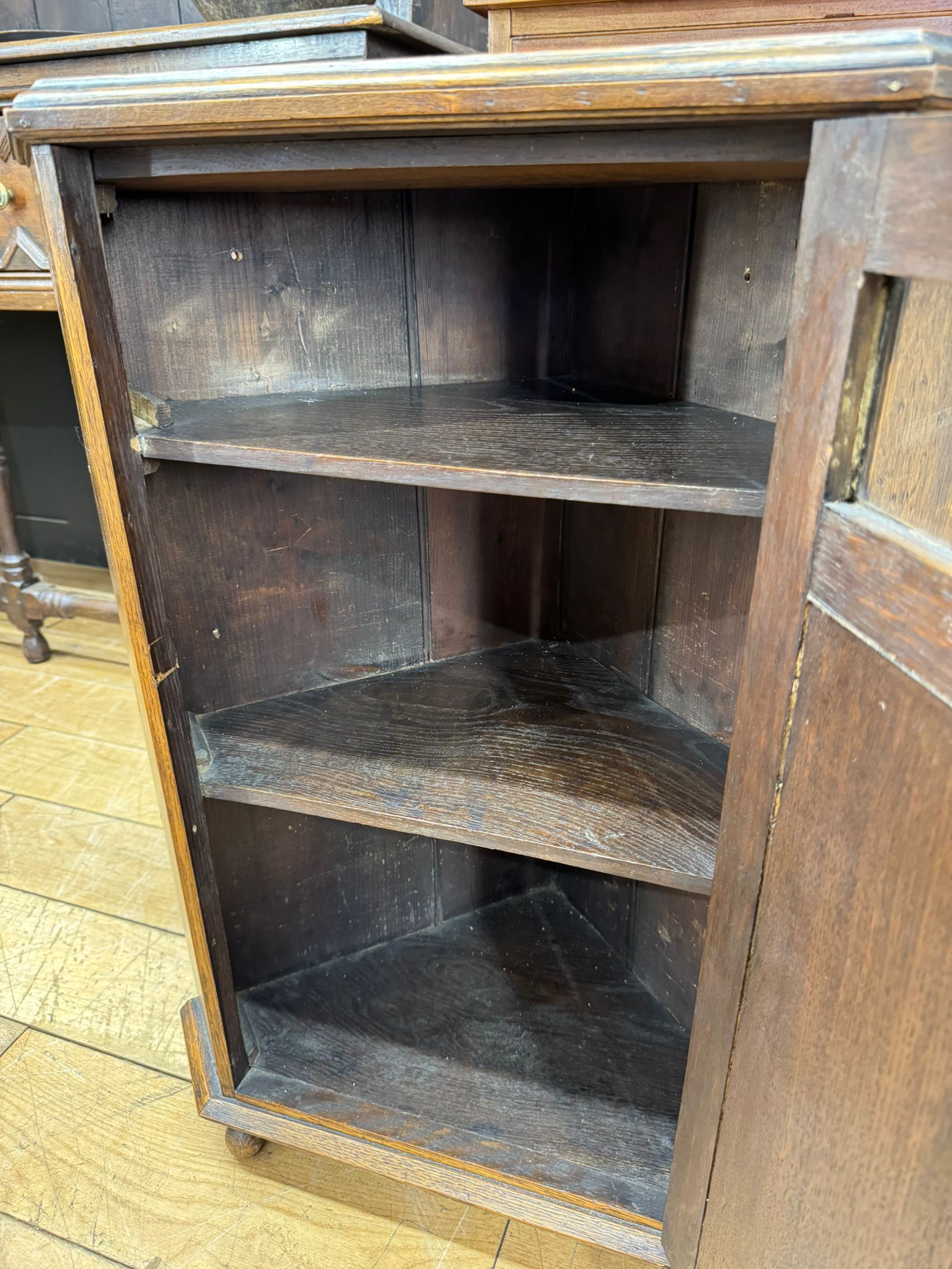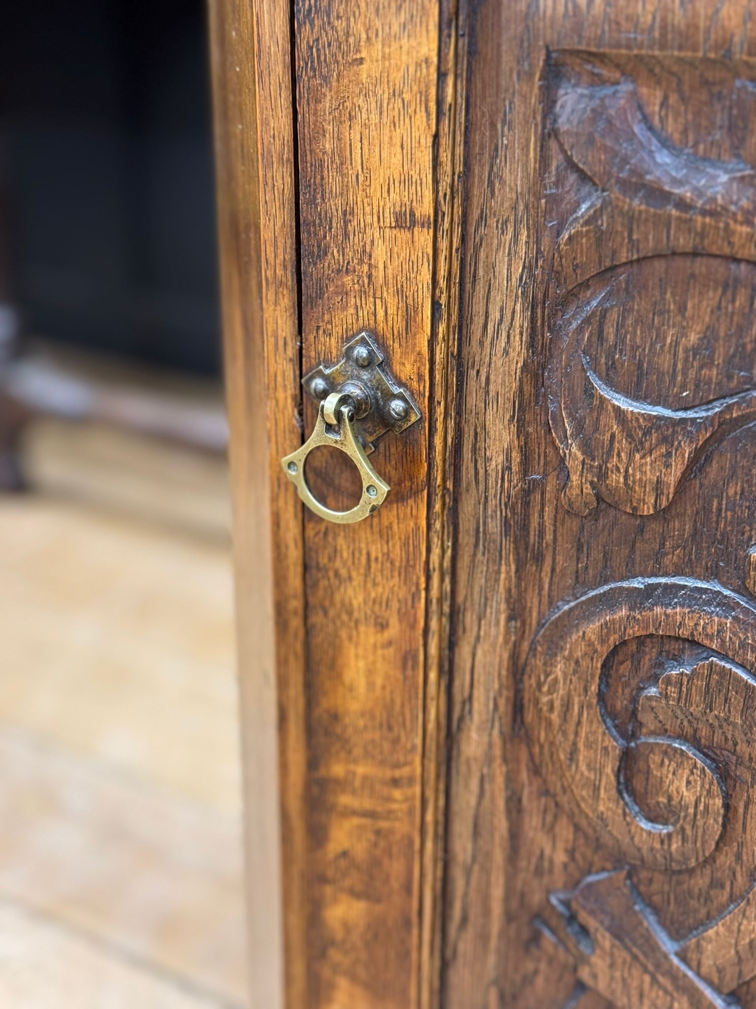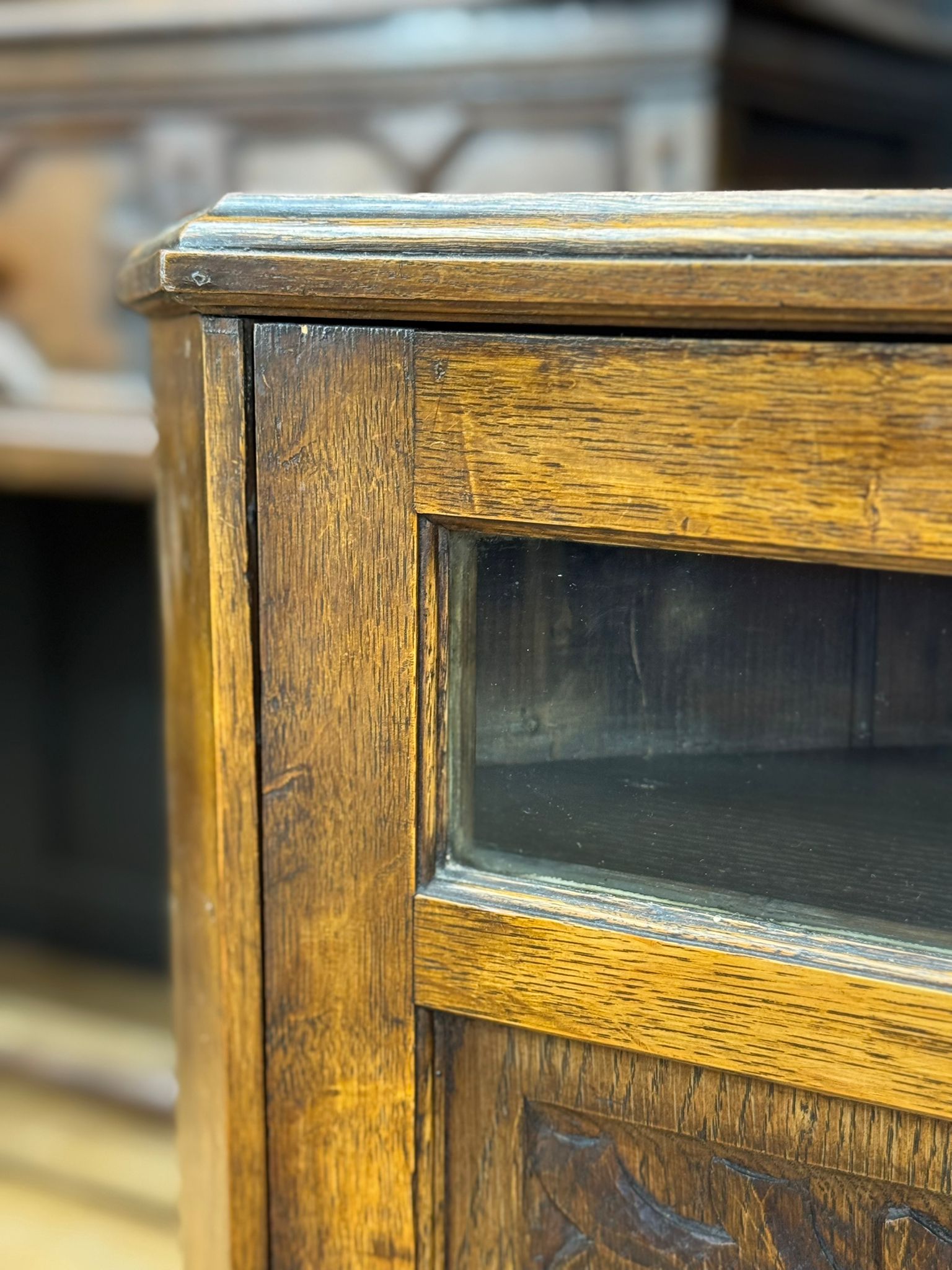A beautifully crafted solid oak corner cupboard featuring a deeply carved scrollwork panel, glass panel, brass drop handle, and rich patina throughout. The triangular form allows it to fit snugly into any corner, ideal for smaller rooms or as a statement display piece.