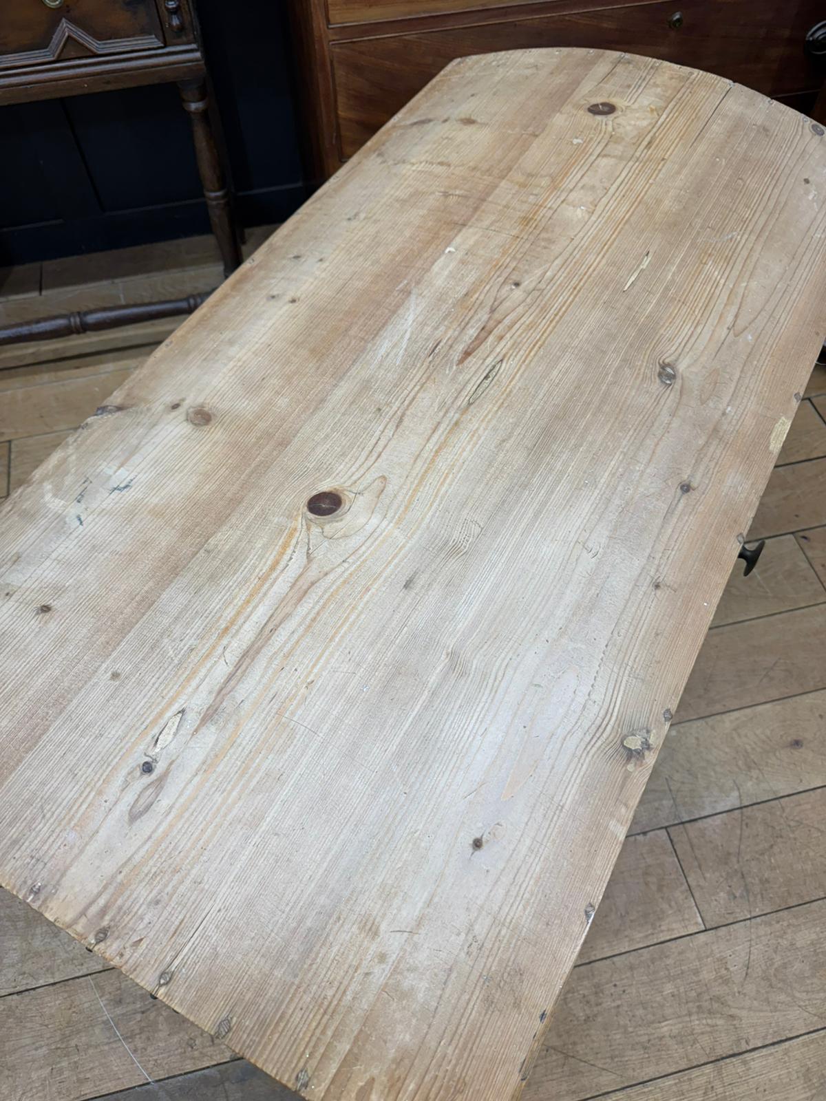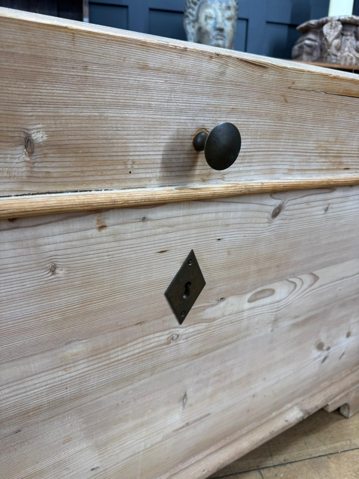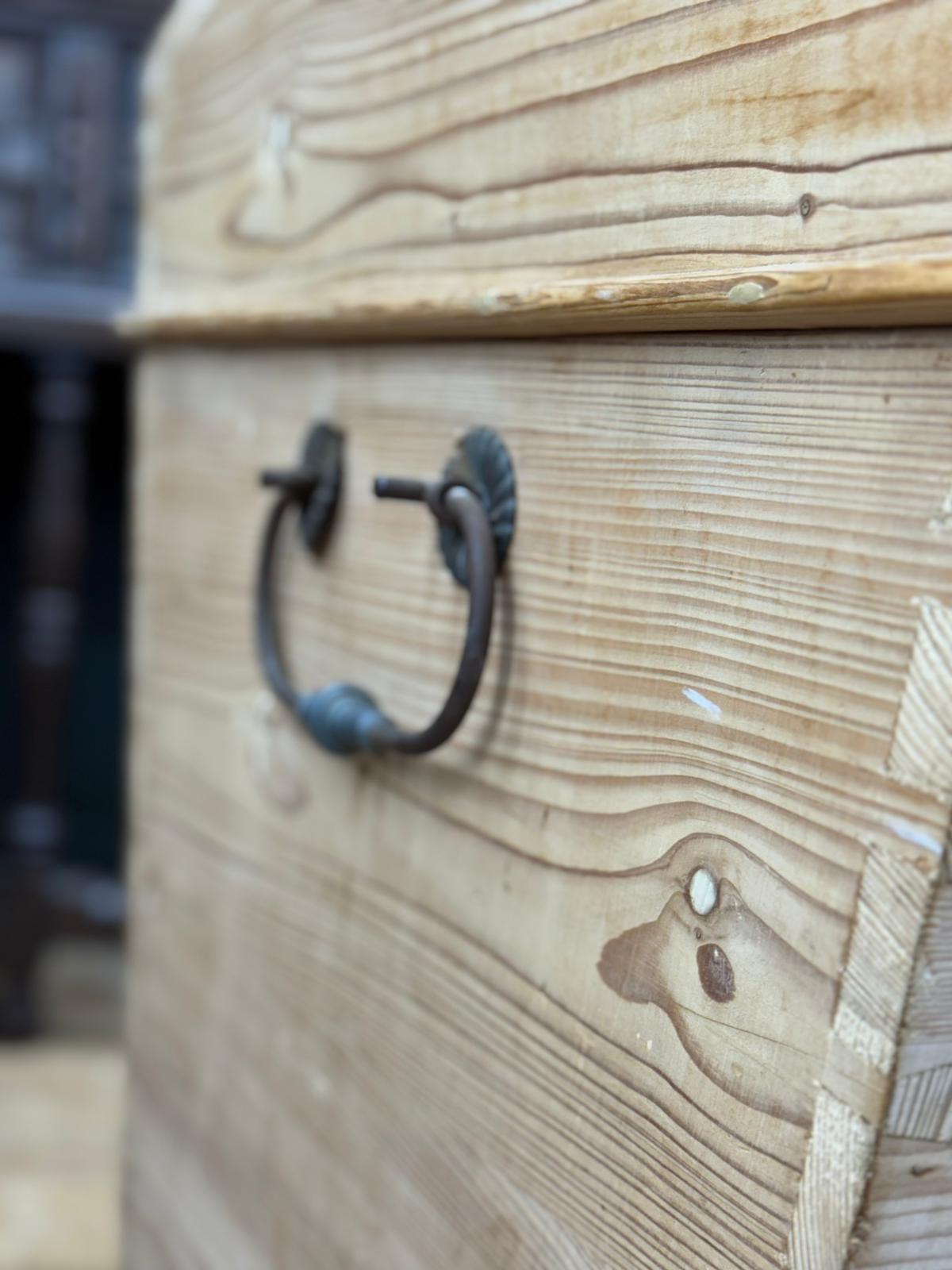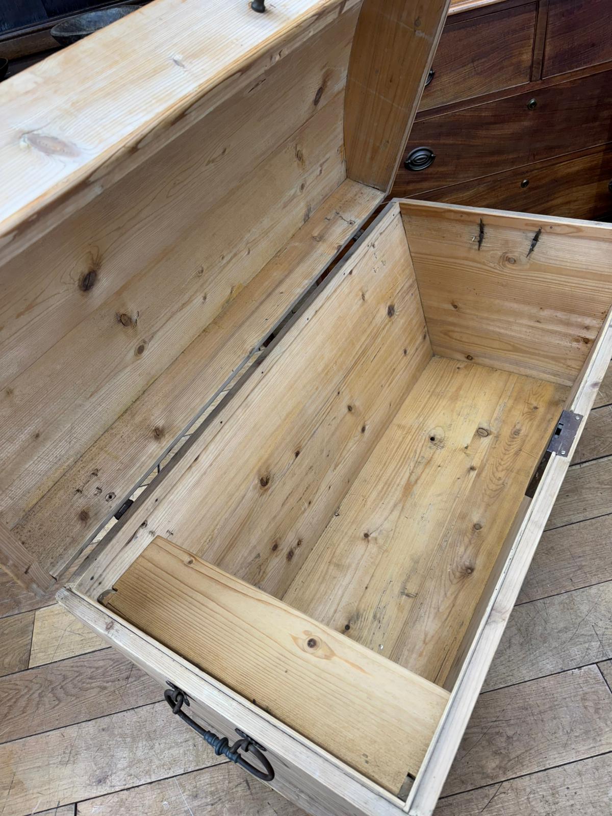 Crafted in solid pine with dovetail joints, shaped bracket feet, and original iron side handles. The dome-shaped lid opens to reveal a clean, spacious interior with a small candle compartment. Retains its original brass escutcheon and working lock plate (key not present).