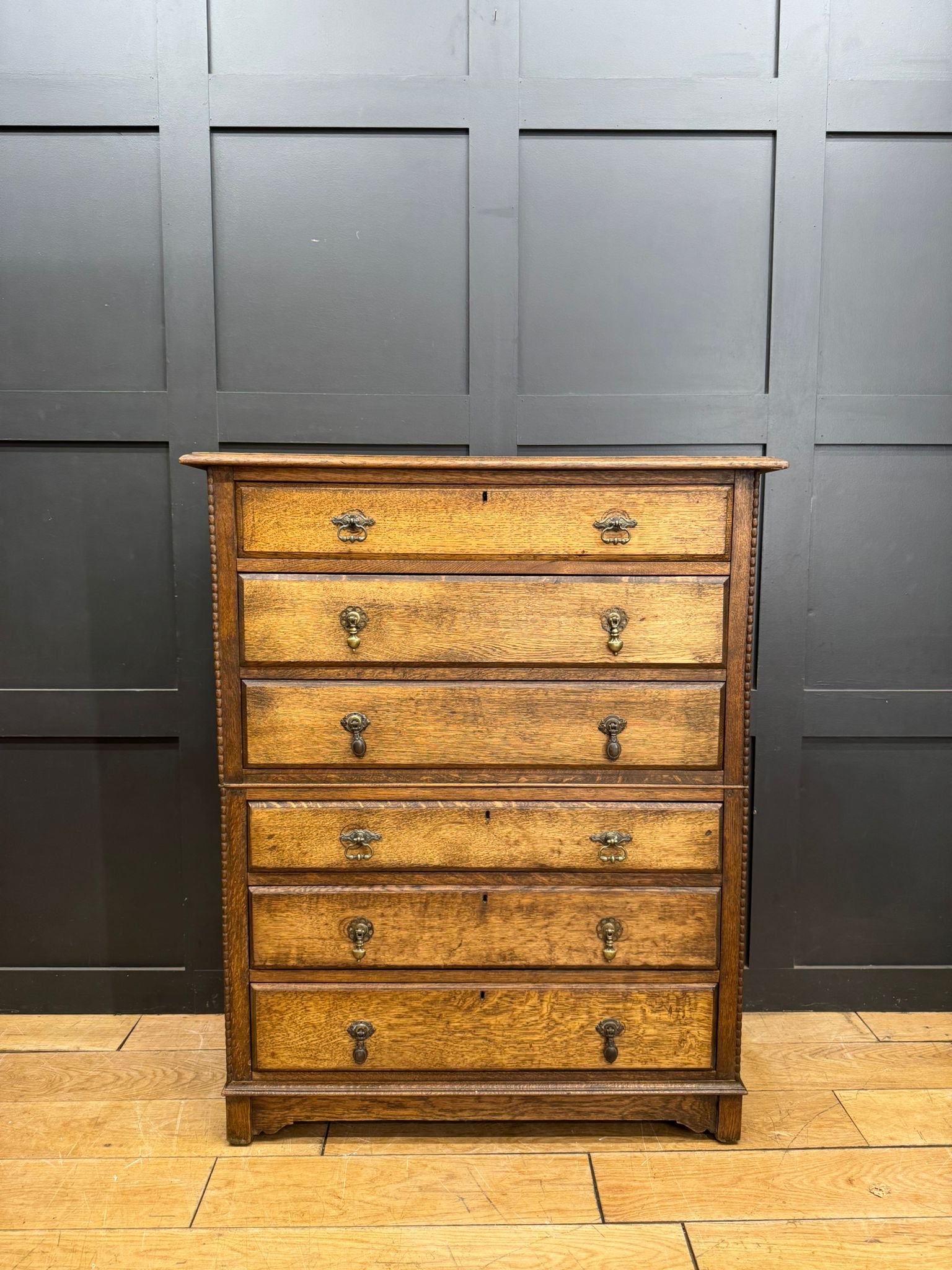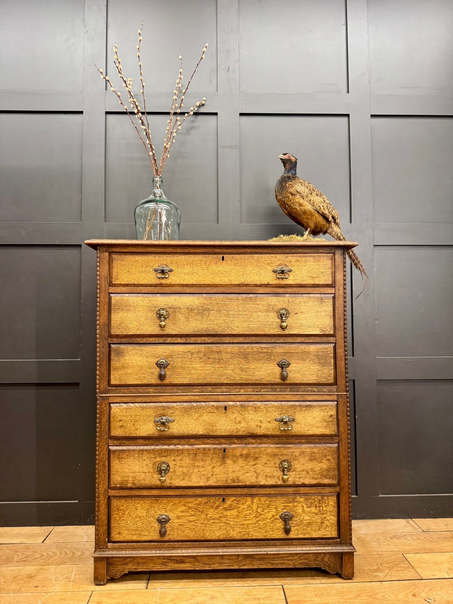 A striking antique tiger oak chest of drawers with beautiful quarter-sawn grain and warm, honey-toned patina. The five full-width drawers offer generous storage, each with original decorative drop handles, giving the piece plenty of charm and character. Stripped and waxed. 3 pairs of slightly mismatched handles, which add to the rustic charm.