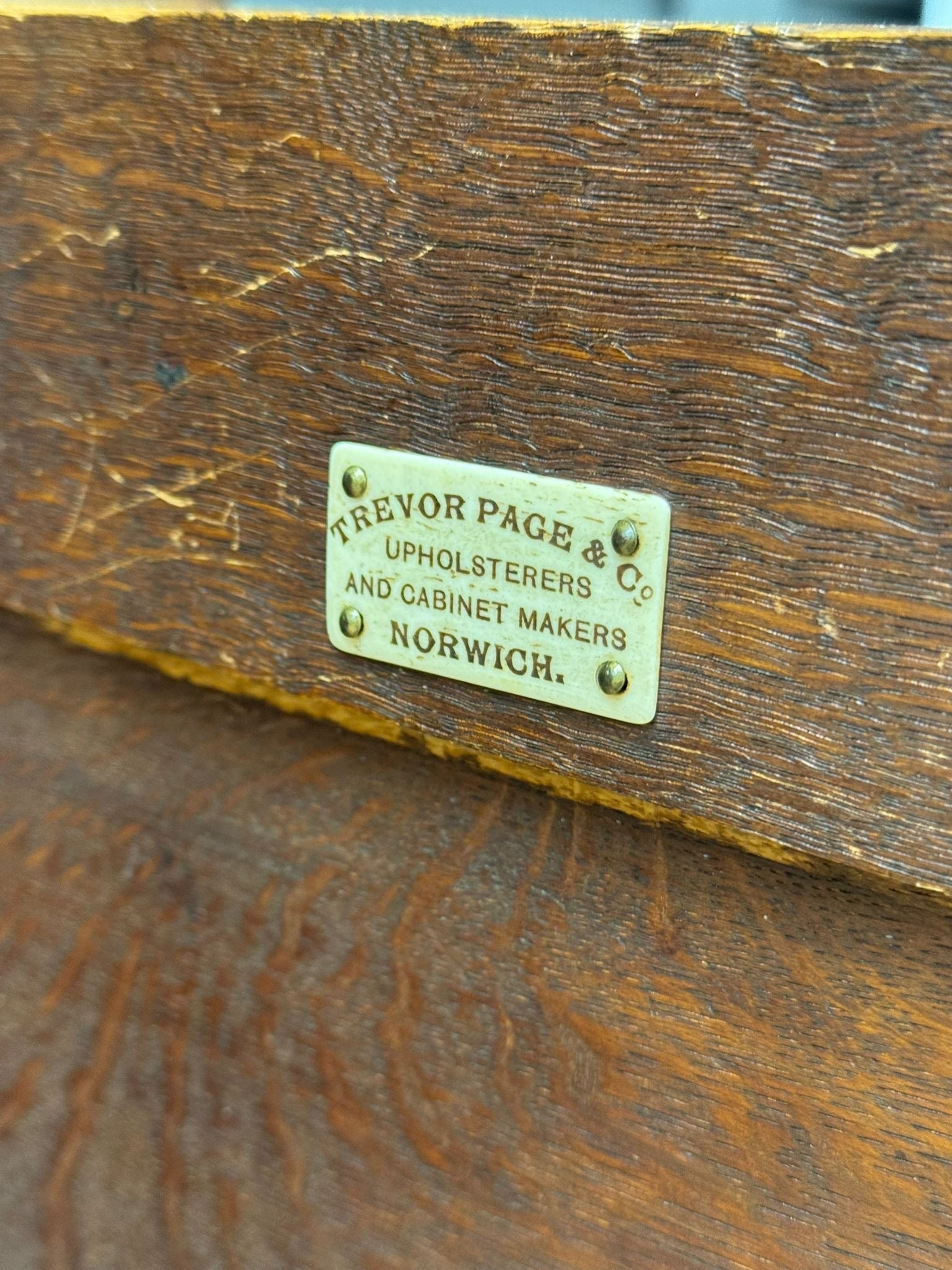 A superb late Victorian carved oak sideboard by Trevor Page & Co., Upholsterers and Cabinet Makers, Norwich. This beautifully detailed piece features deep hand-carved foliate and Green Man motifs, barley twist supports, and a shaped backboard with decorative scrollwork — showcasing the exceptional craftsmanship typical of late-19th-century English furniture. Condition: Good antique condition with lovely colour and patina. Some age-related marks and small areas of wear as expected from a genuine period piece. A historic split to the top adds character but is solid and stable. Clean and ready for use. Dimensions: • Length: 125 cm • Depth: 52 cm • Height: 123 cm Please be aware that this item does show signs of use, which is to be expected considering its age. These signs of wear add authenticity to the item. We recommend carefully studying the pictures as they form a significant part of the description. Thank you. Feel free to explore our other available items. Our collection includes a variety of pieces ranging from rustic, antique, vintage to industrial. OUR DELIVERY SERVICE We utilize a reliable and experienced courier service for all deliveries. If you have any questions or concerns regarding delivery, please do not hesitate to contact us. Our goal is to deliver most large items within 14 days. Delivery Scheduling: The customer will be contacted by the Courier a few days before delivery to confirm the day and approximate time. Please note that all delivery prices quoted in listings are for England only. Deliveries to other areas such as Scotland, Wales and certain parts of Cornwall are subject to negotiation. Thank you. |