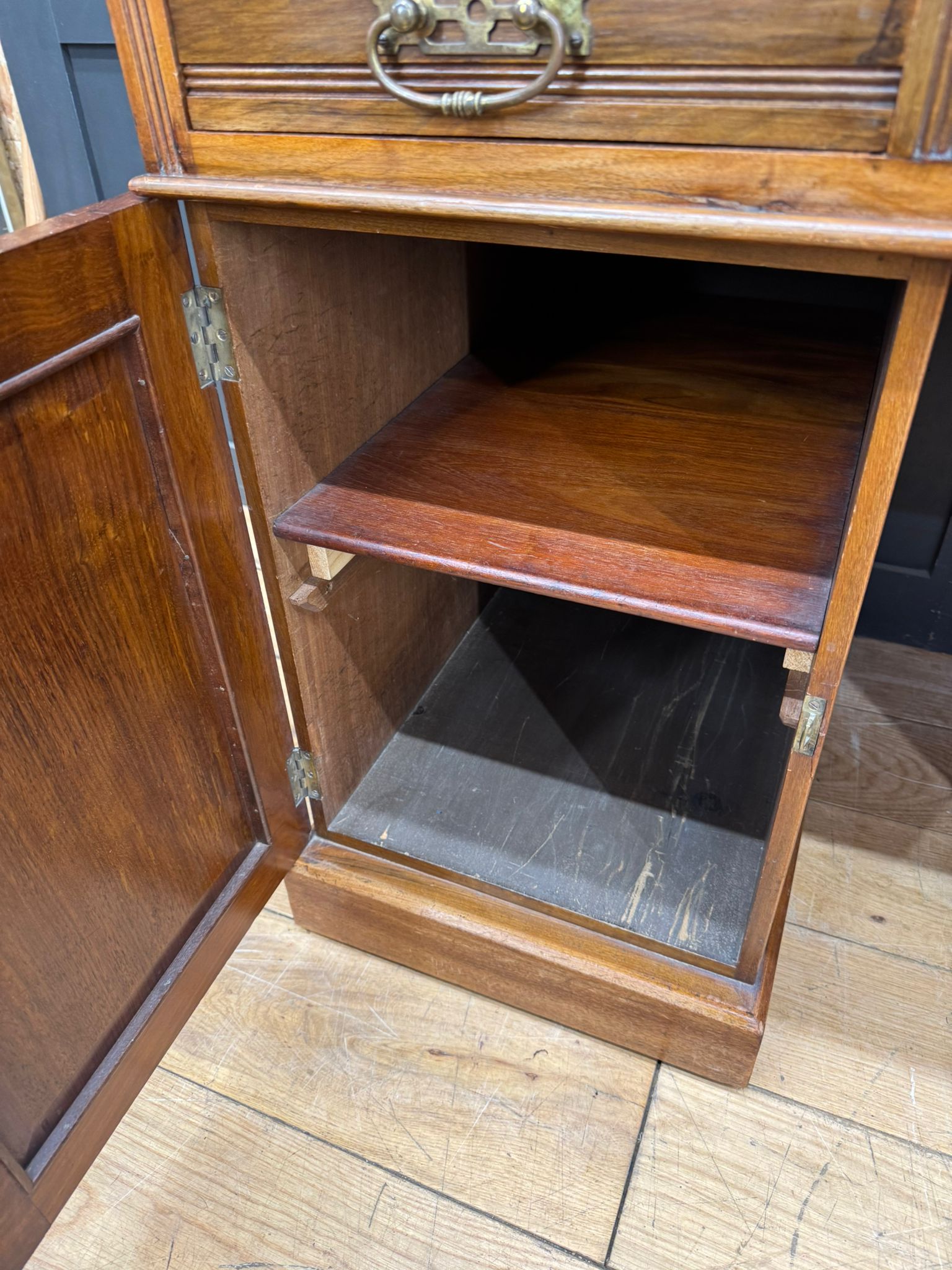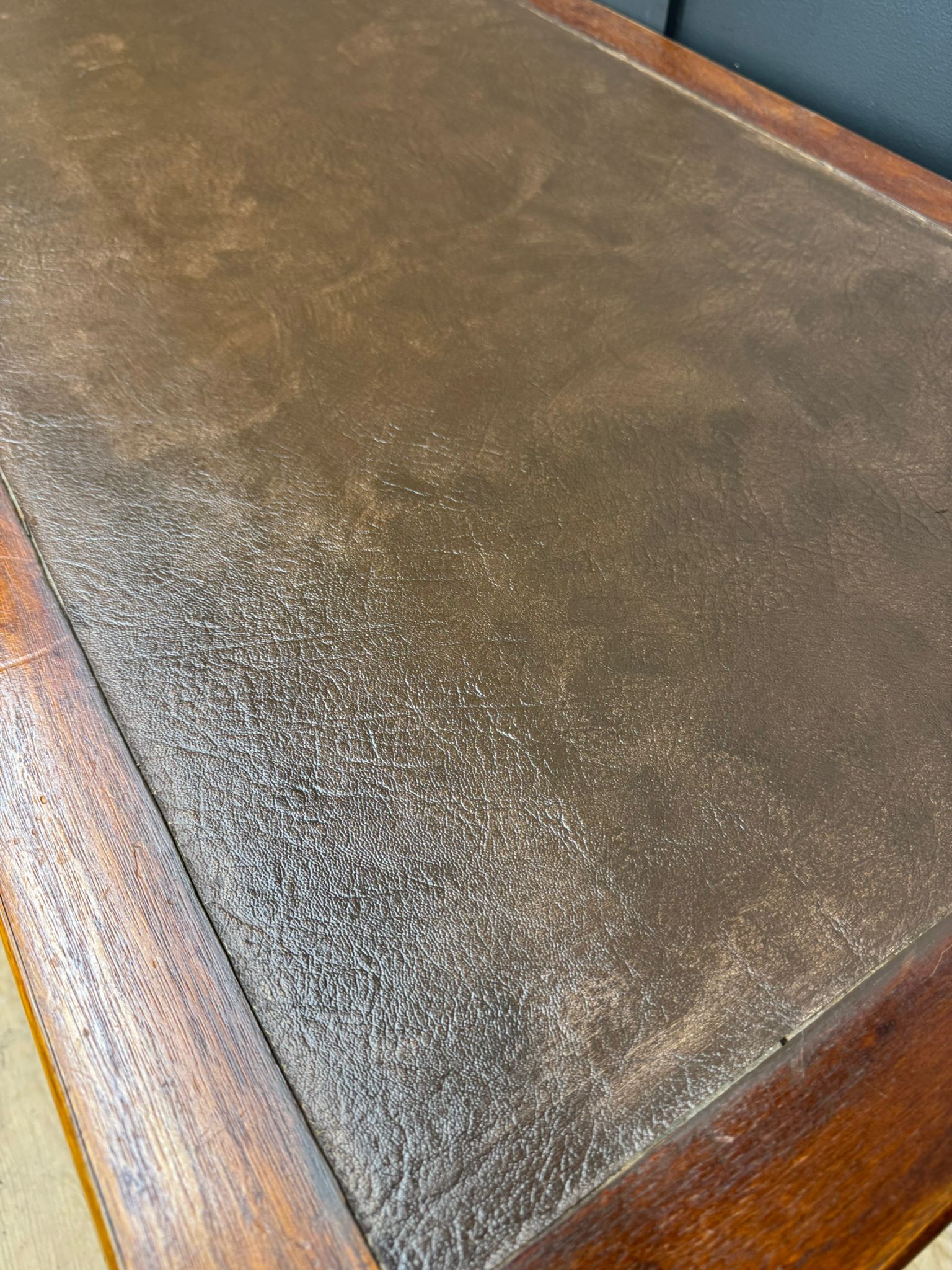 Structurally solid and stable throughout. Leather writing surface shows age-related wear, marks and patina consistent with use. General surface wear, minor knocks and colour variation commensurate with age. Drawers and cupboard doors open and close well. Original castors present.