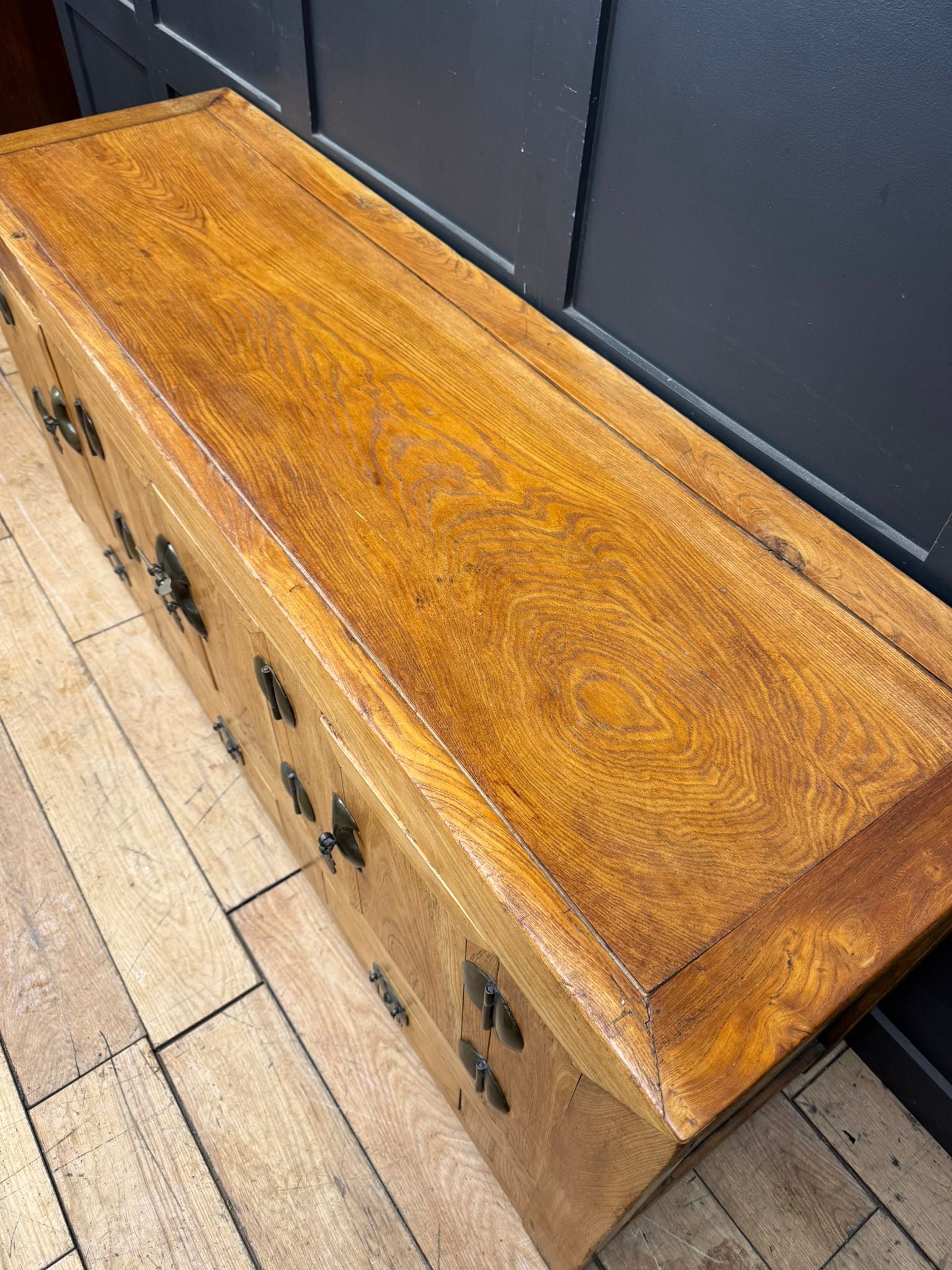 A large solid Chinese elm sideboard / cupboard unit offering generous storage and strong visual presence. Designed with clean, balanced proportions, this piece works equally well as a TV stand, media unit, console table or low storage cabinet.