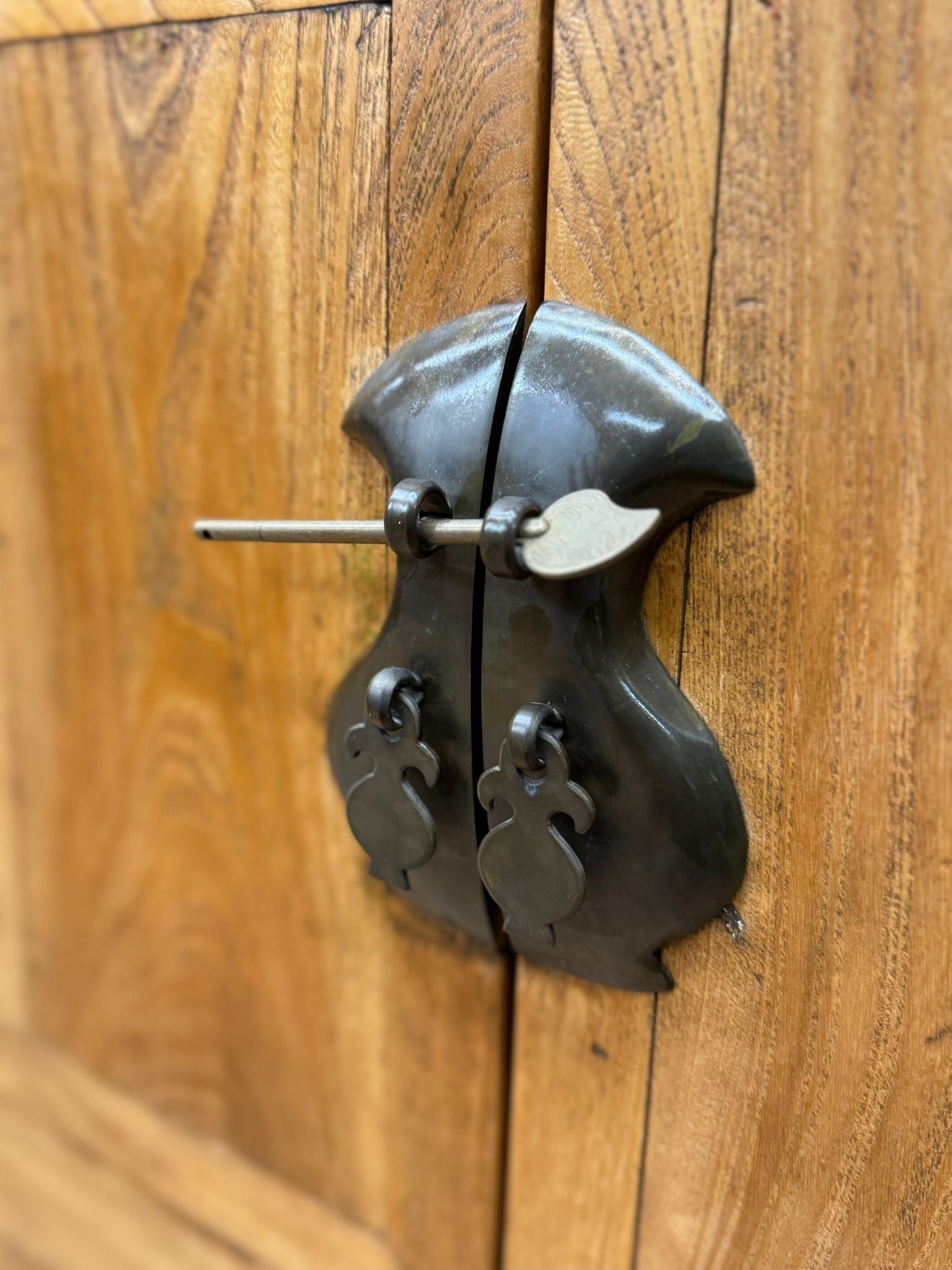 The layout includes four cupboard doors and three drawers, providing practical storage for media equipment, books, games, tableware or general household use. The low height makes it particularly suitable as a TV cabinet or console, while the solid construction and natural timber grain give it lasting appeal. The cupboard doors secure using traditional internal wooden drop-bar locks, a simple and original feature typical of Chinese cabinetry