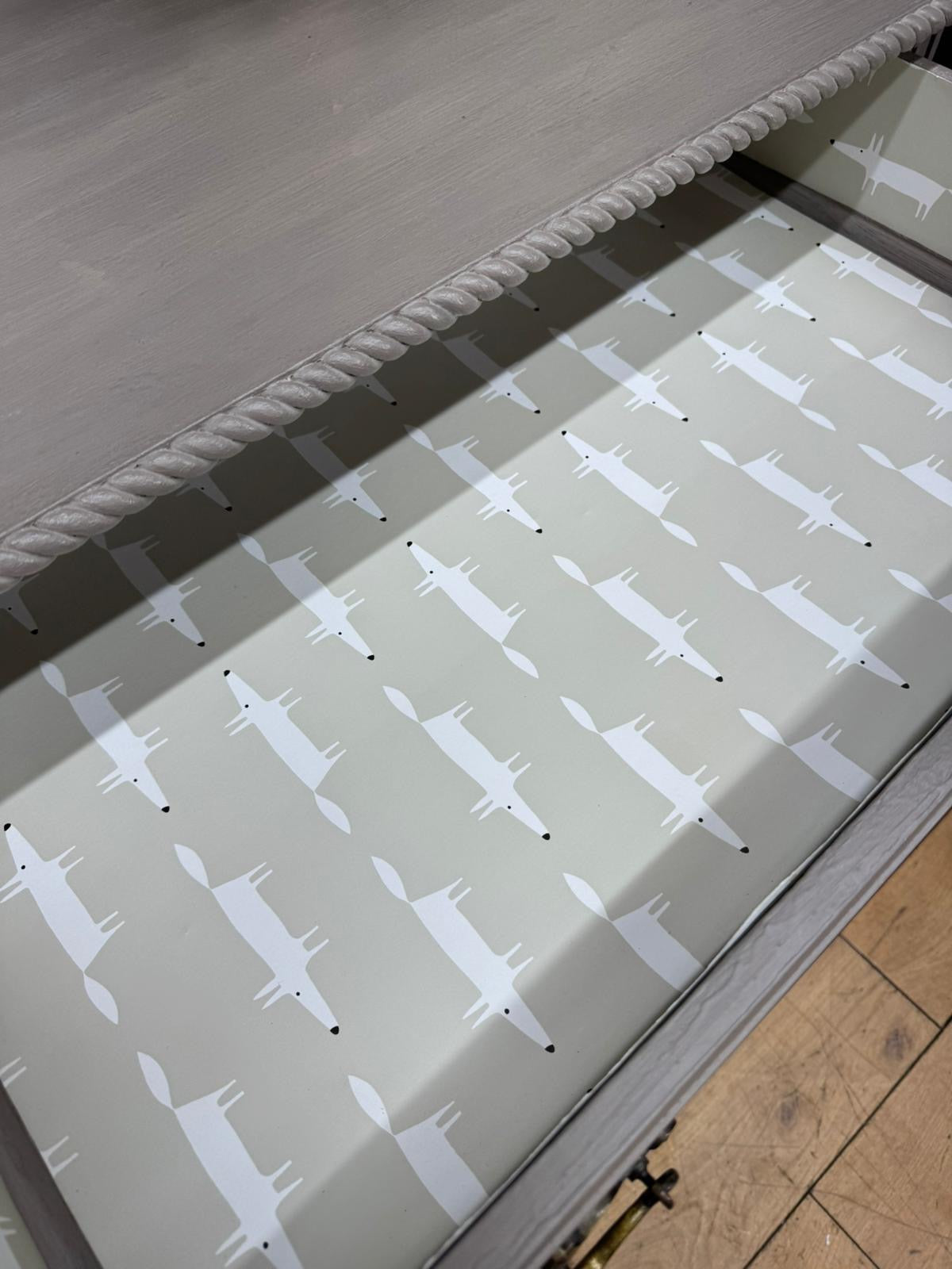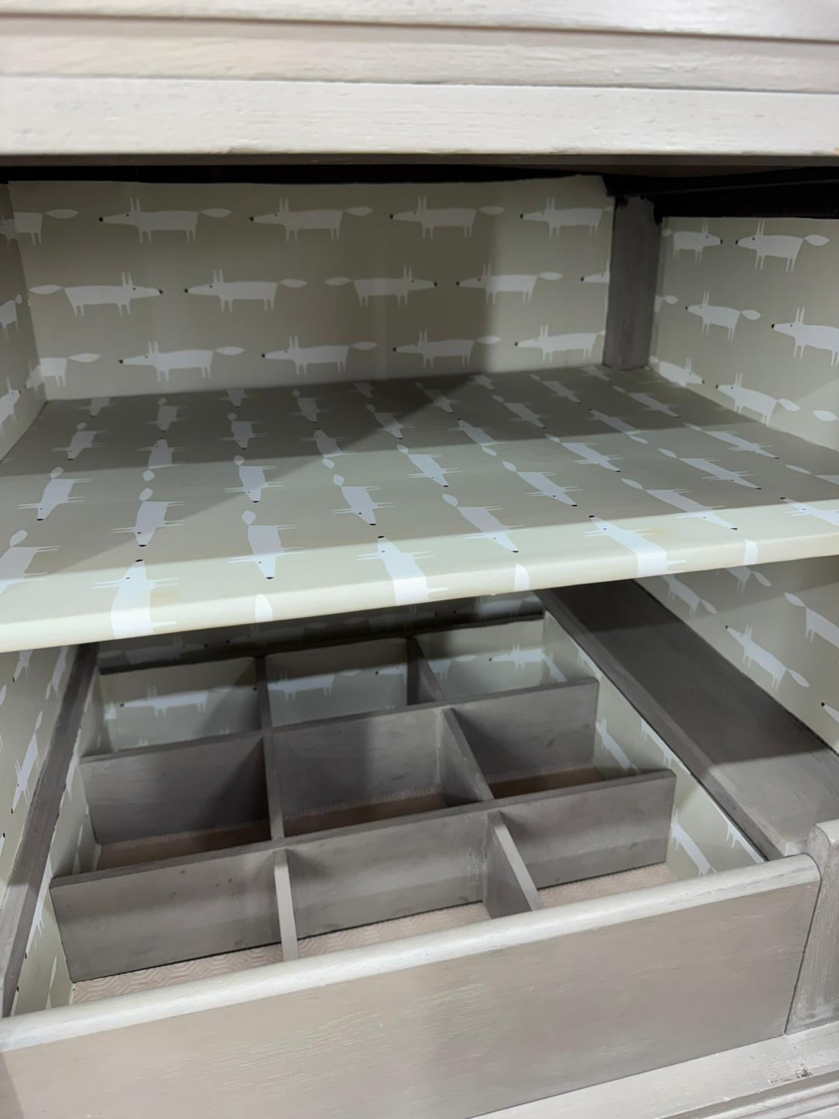 Two drawers sit above three cupboards with internal shelving and a fitted organiser drawer—perfect for cutlery, bottles or accessories. The interior has been fully lined with a charming fox-print paper for a clean, modern touch.