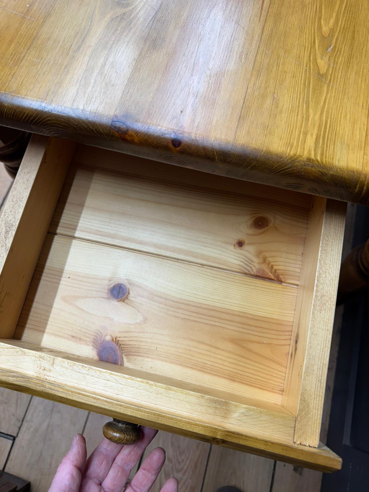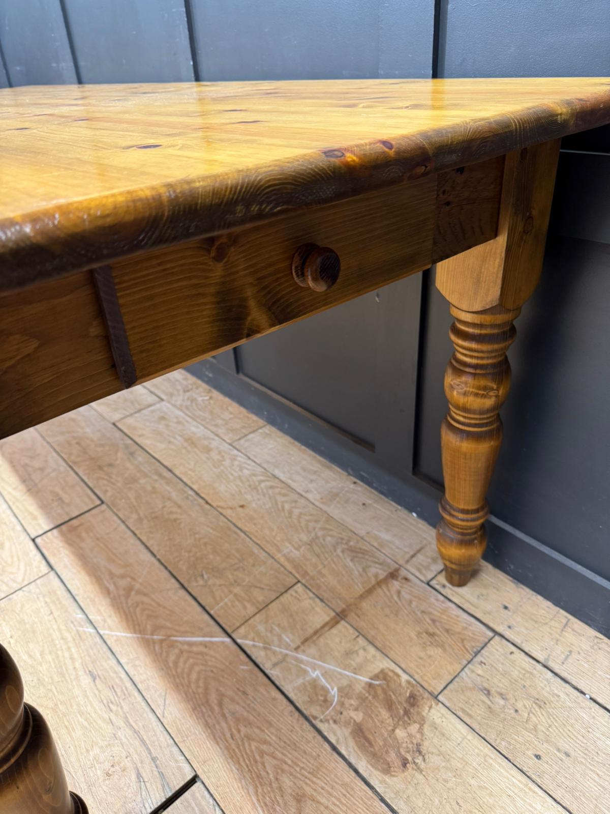 A solid, no-nonsense vintage pine farmhouse dining table. The plank top shows natural knots, grain and gentle wear, giving it that warm, lived-in look. Cutlery drawer one end.