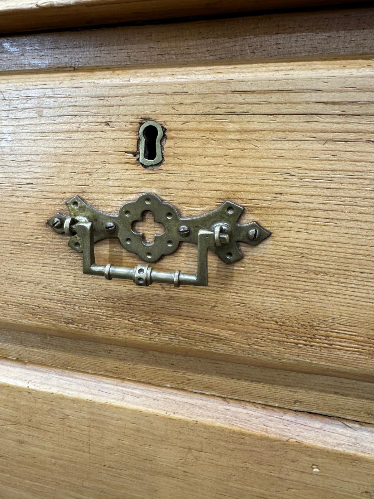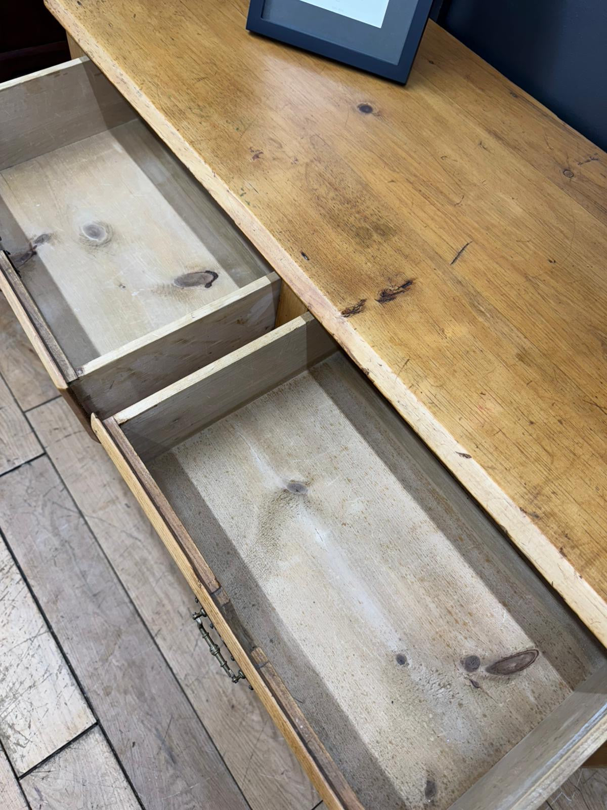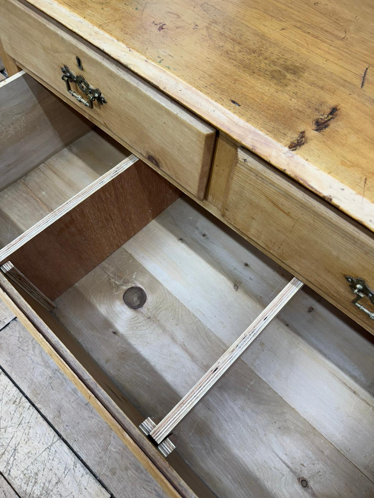 Shows good honest age-related wear throughout: light knocks, marks and shrinkage lines. Later plywood dividers added inside the bottom drawer. Strong and sturdy.