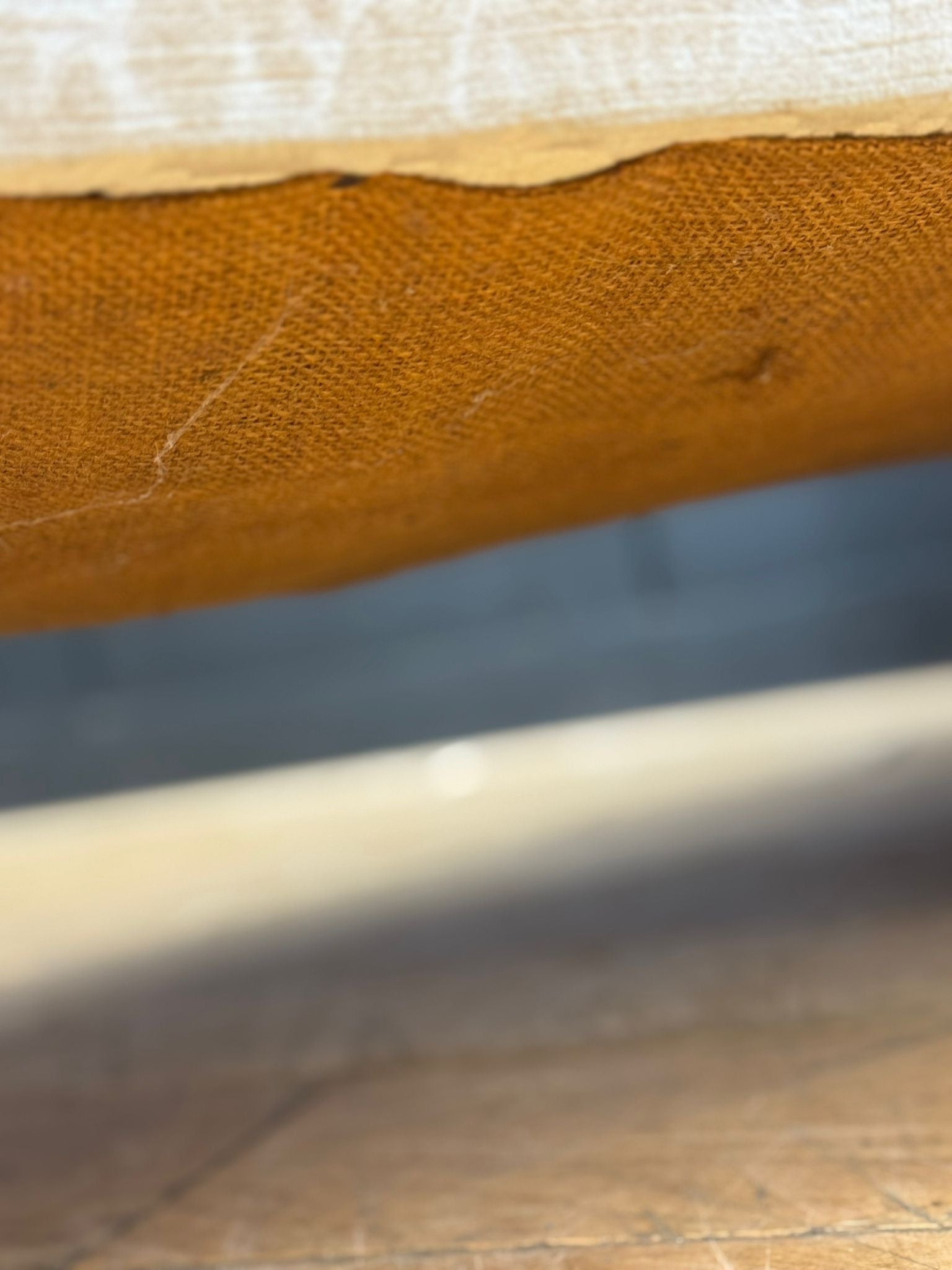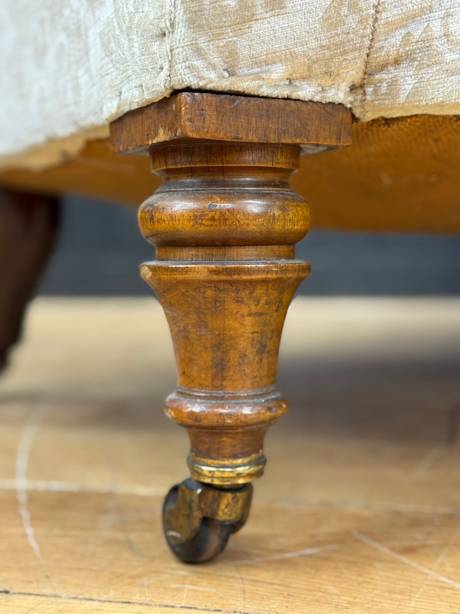 Structurally sound and sturdy. The original upholstery shows expected fading and wear consistent with age. Fabric remains usable but would also make a fine candidate for re-covering. Legs and castors all in good working order.