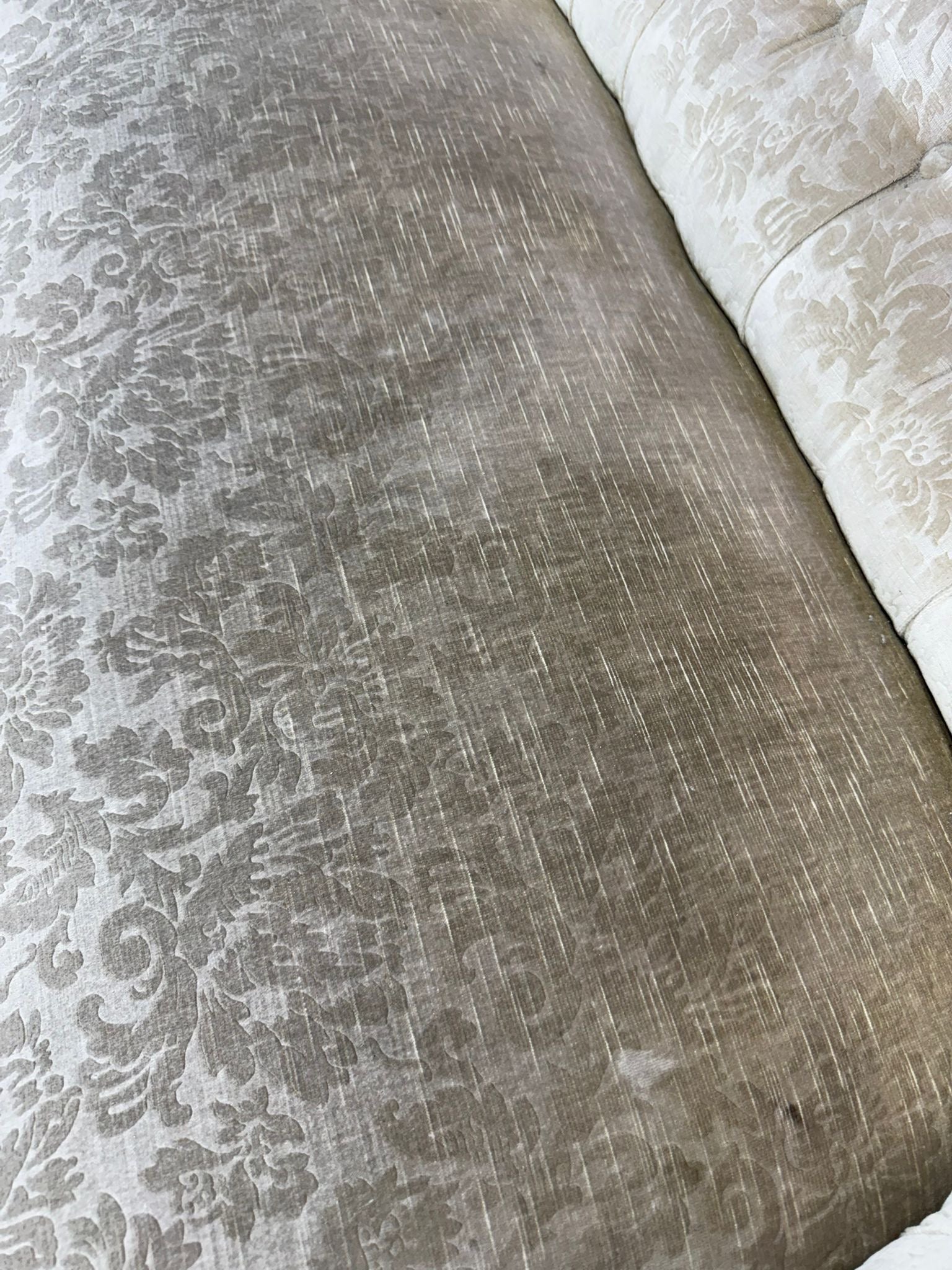 A late Victorian walnut button-back sofa with elegant scrolled arms and beautifully turned front legs on black ceramic castors. Retains its original damask upholstery, softly faded and gently worn with age, giving the piece a wonderful, time-softened character.