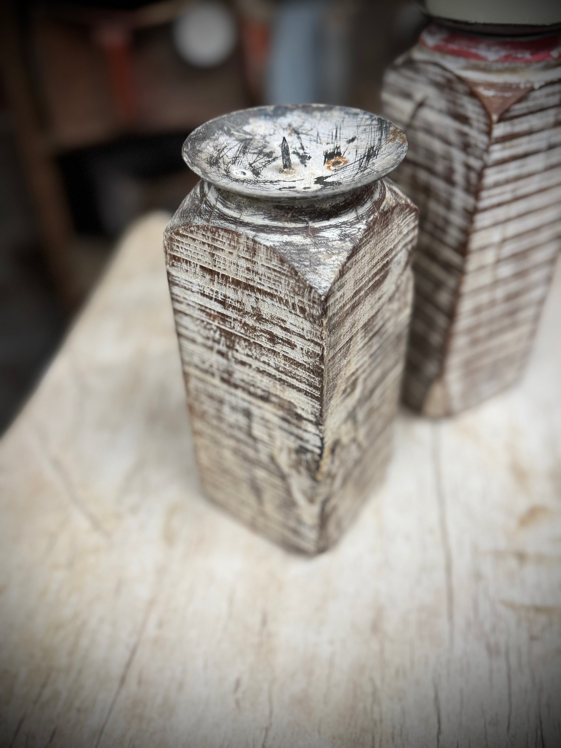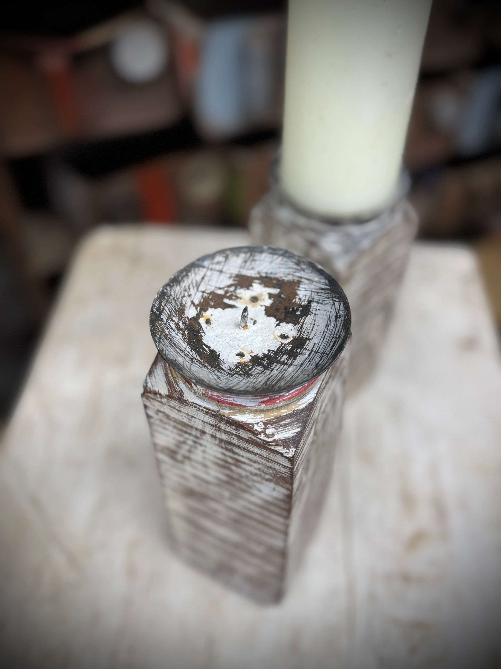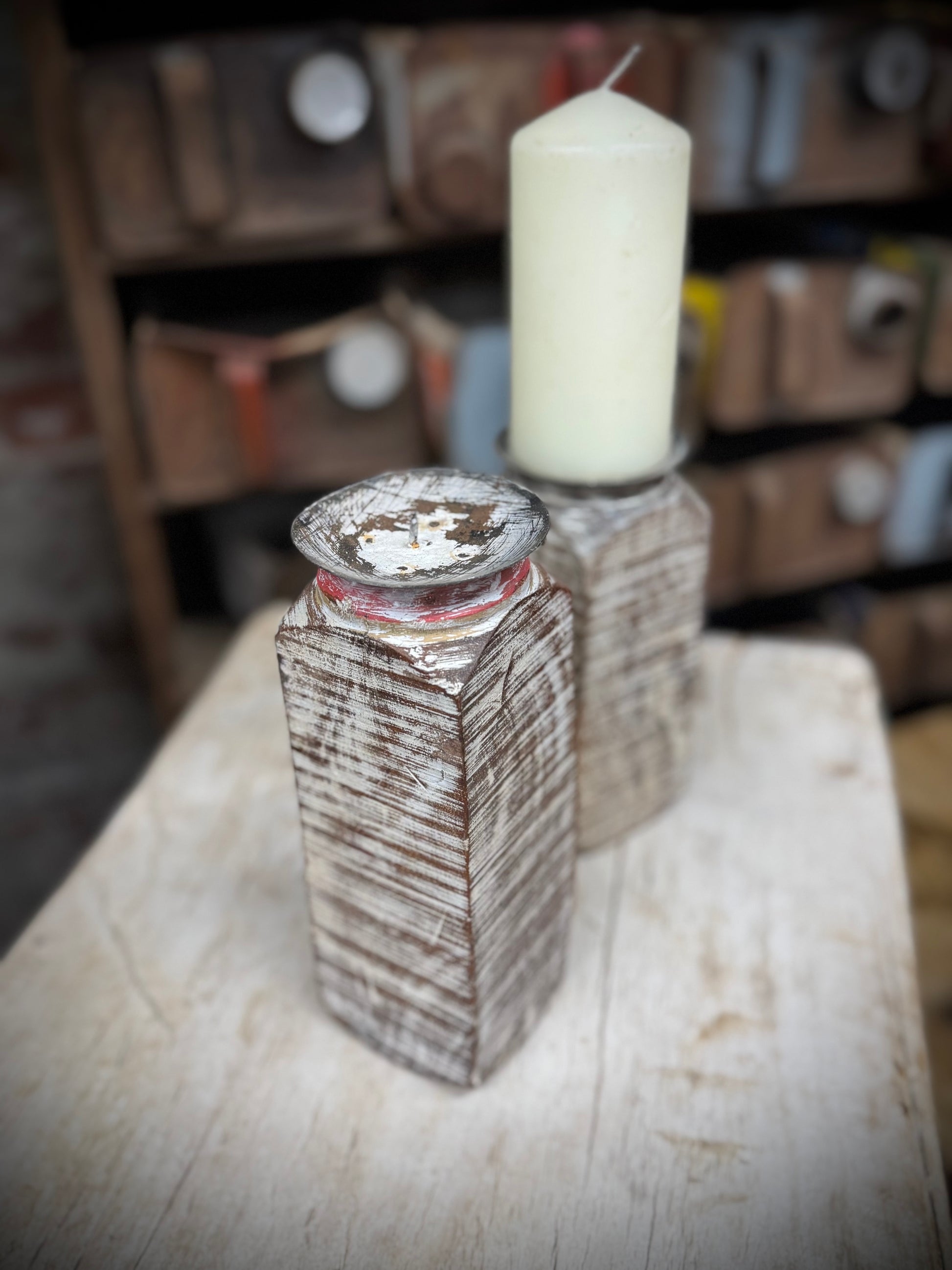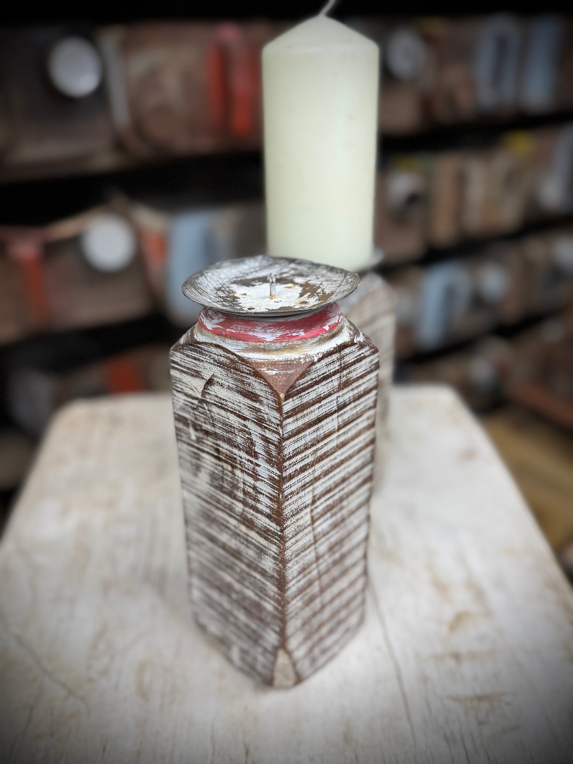 Add a touch of vintage charm to your home with this unique vintage style candle holder. Crafted from solid reclaimed wood in a rustic whitewashed finish, this piece is solid and heavy. Originating from India, these candle holders are not just functional but also a statement piece that will enhance the ambiance of your home.