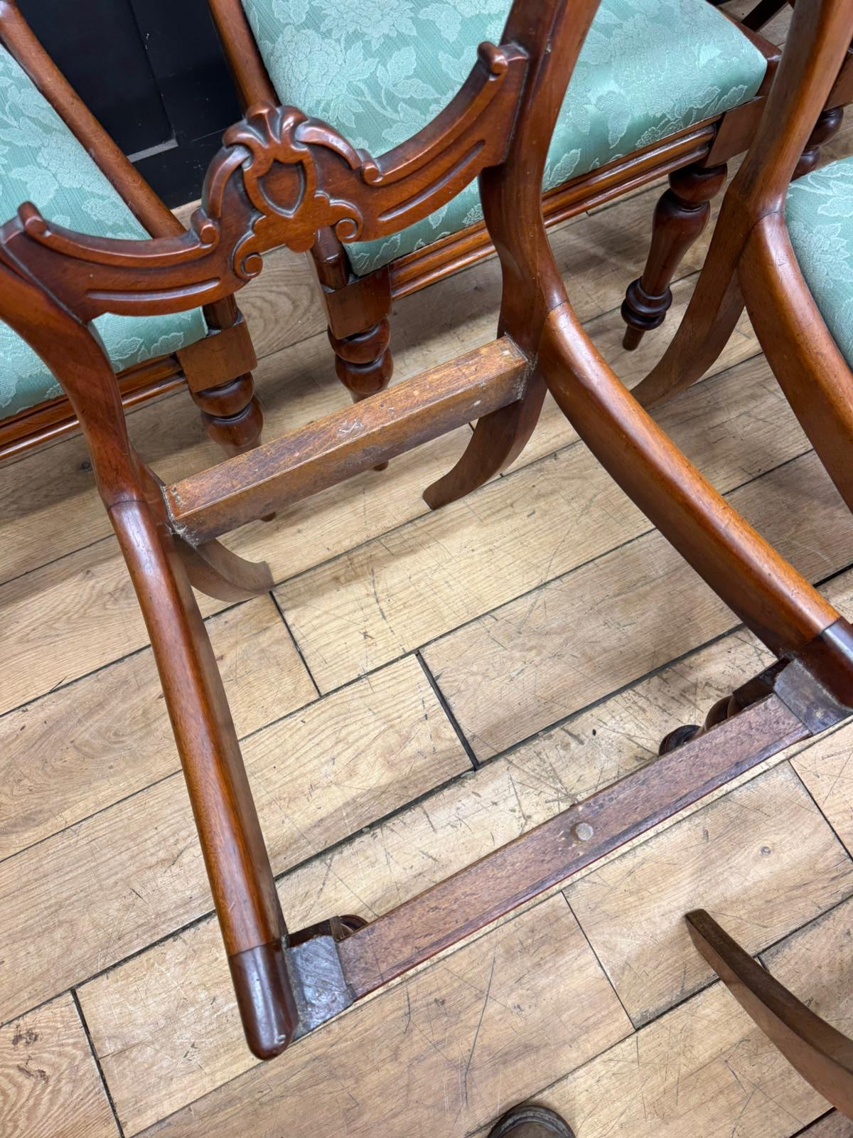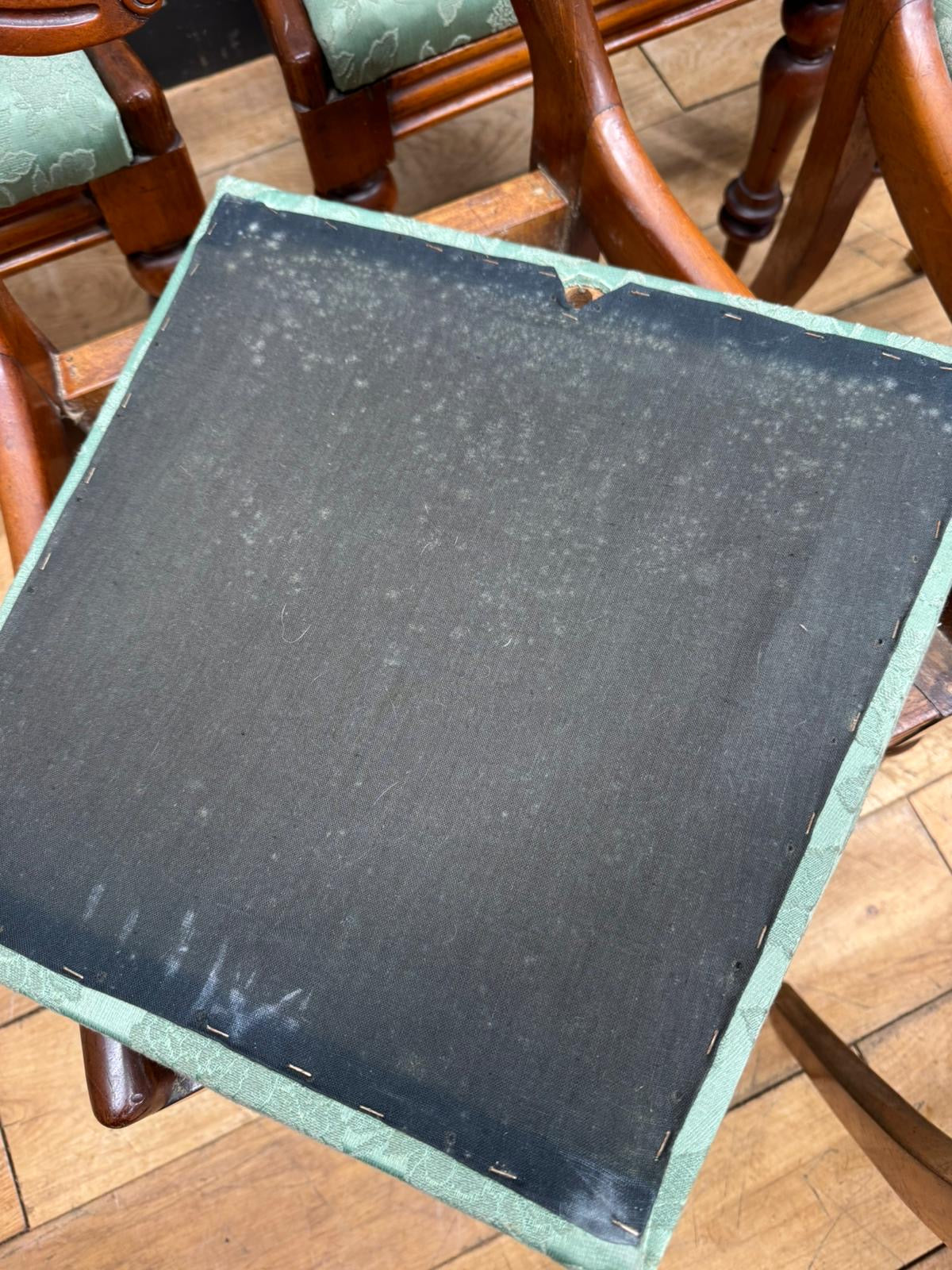 The seats are upholstered in a soft green floral damask. As shown in the photos, the pads simply lift out - these chairs are one of the easiest Victorian styles to re-cover yourself. Remove the seat, stretch on new fabric, staple, and drop it back in. A quick DIY refresh if you fancy changing the look.