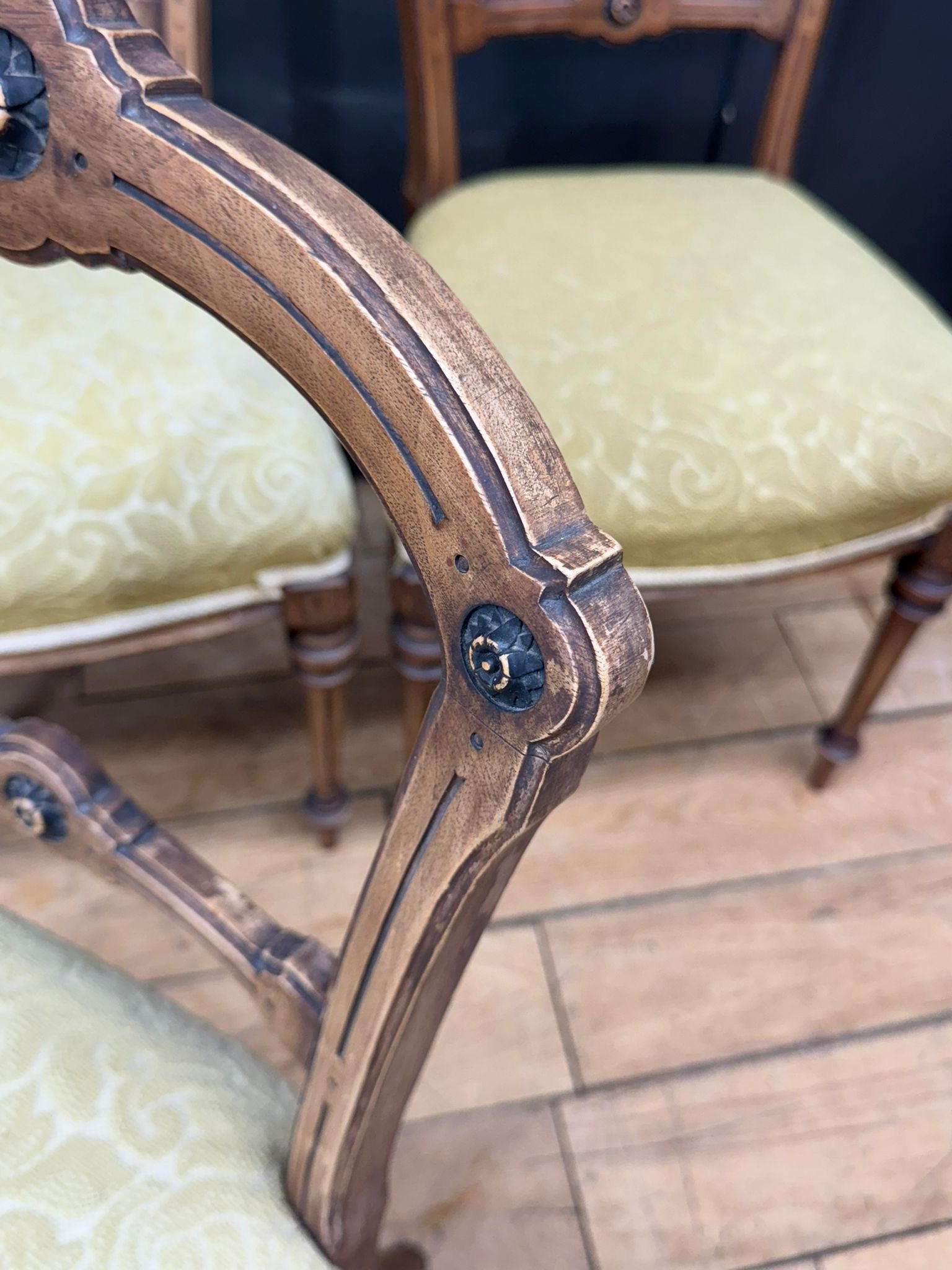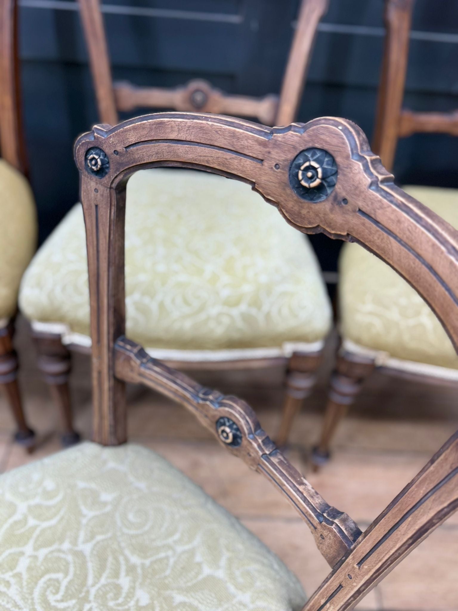 They are upholstered in a soft green patterned fabric which suits the chairs well and remains comfortable and usable. Colour variation across the frames is evident and entirely consistent with age, long-term use, and historic exposure to light — a common and accepted feature in genuine antique chair sets.
