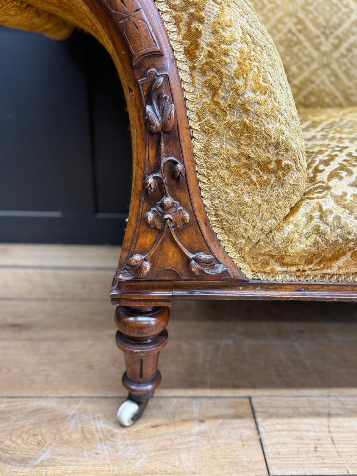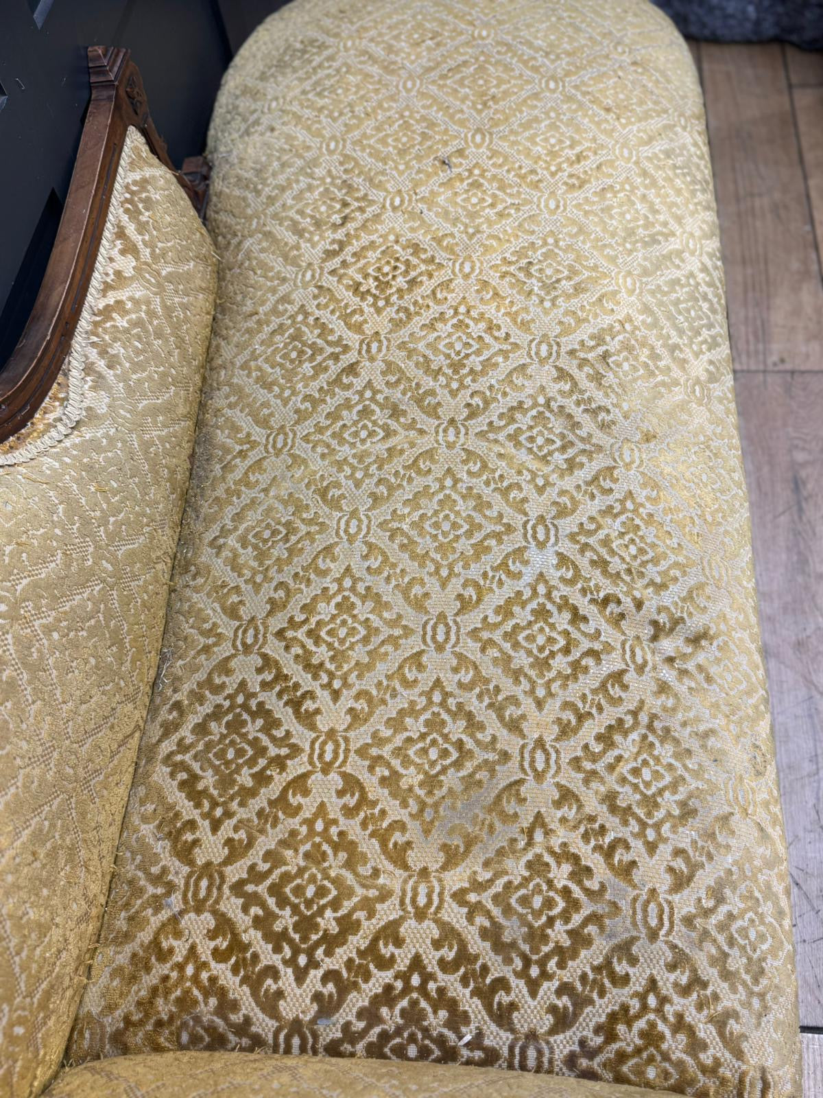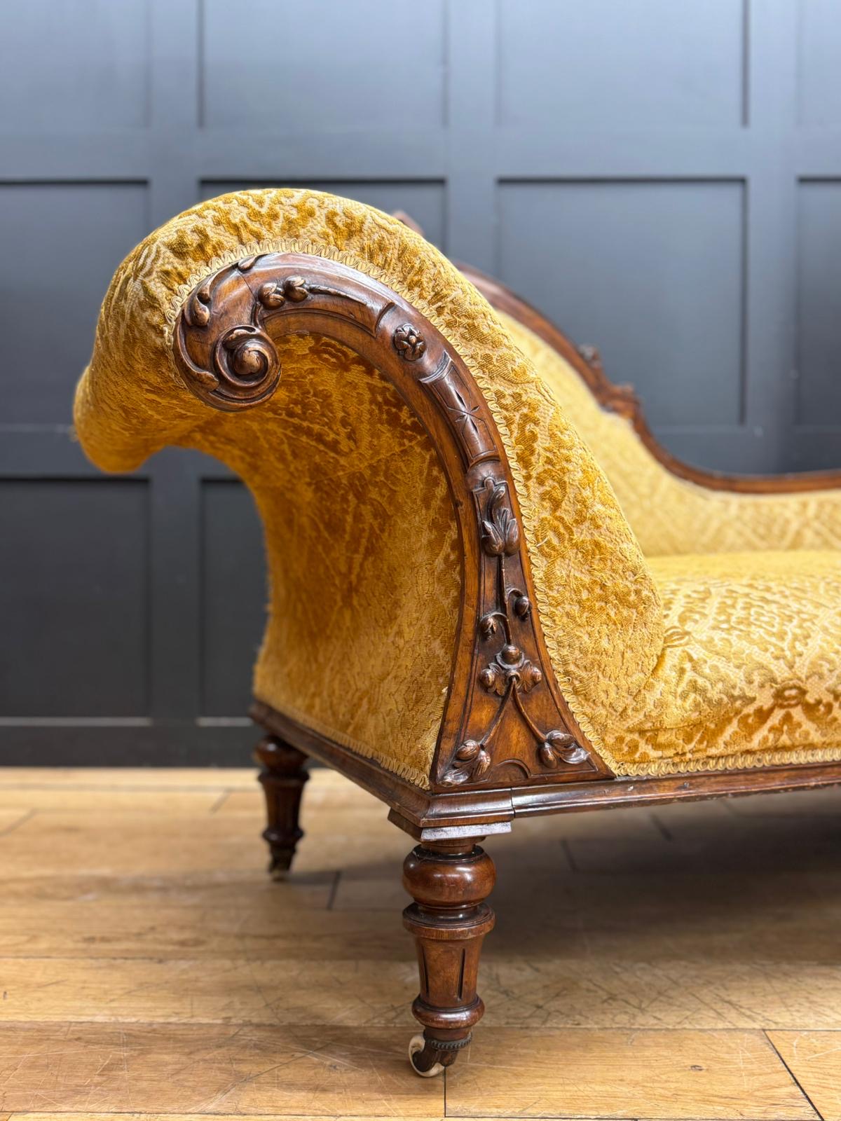 Victorian Carved Mahogany Chaise Longue in Gold Cut Velvet
