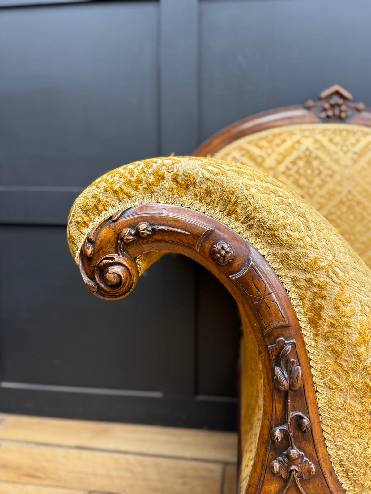 Upholstered in a vintage gold cut velvet that gives it a proper period feel. Ideal for a bay window, dressing room, landing, or anywhere you want a bit of drama and old-school charm.