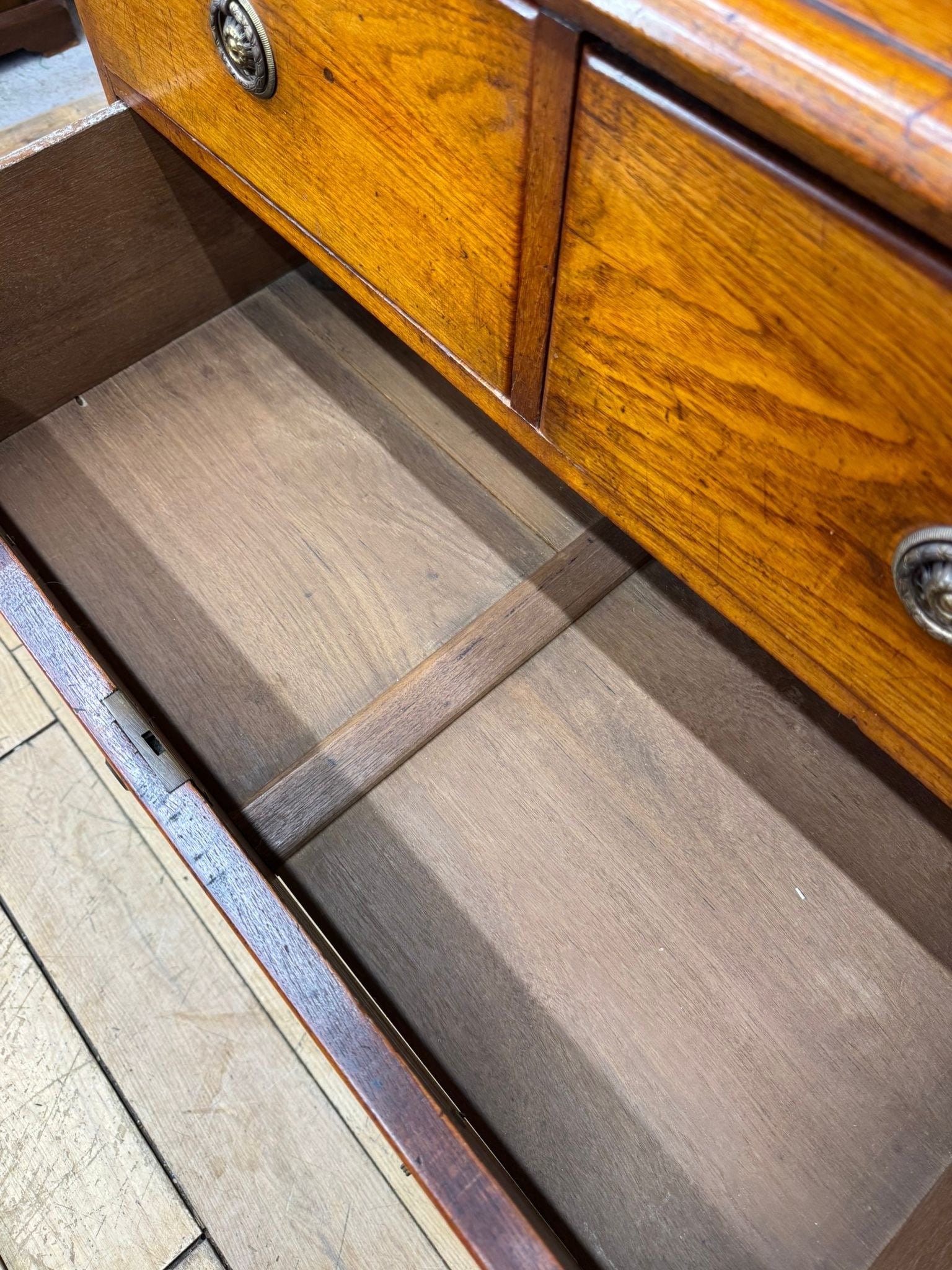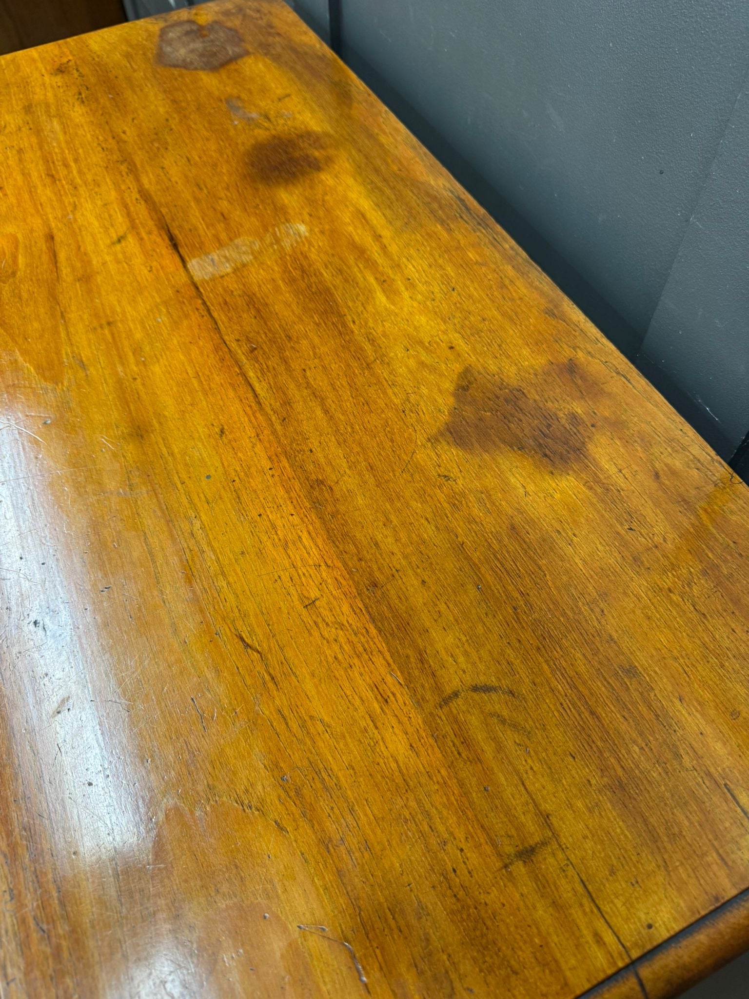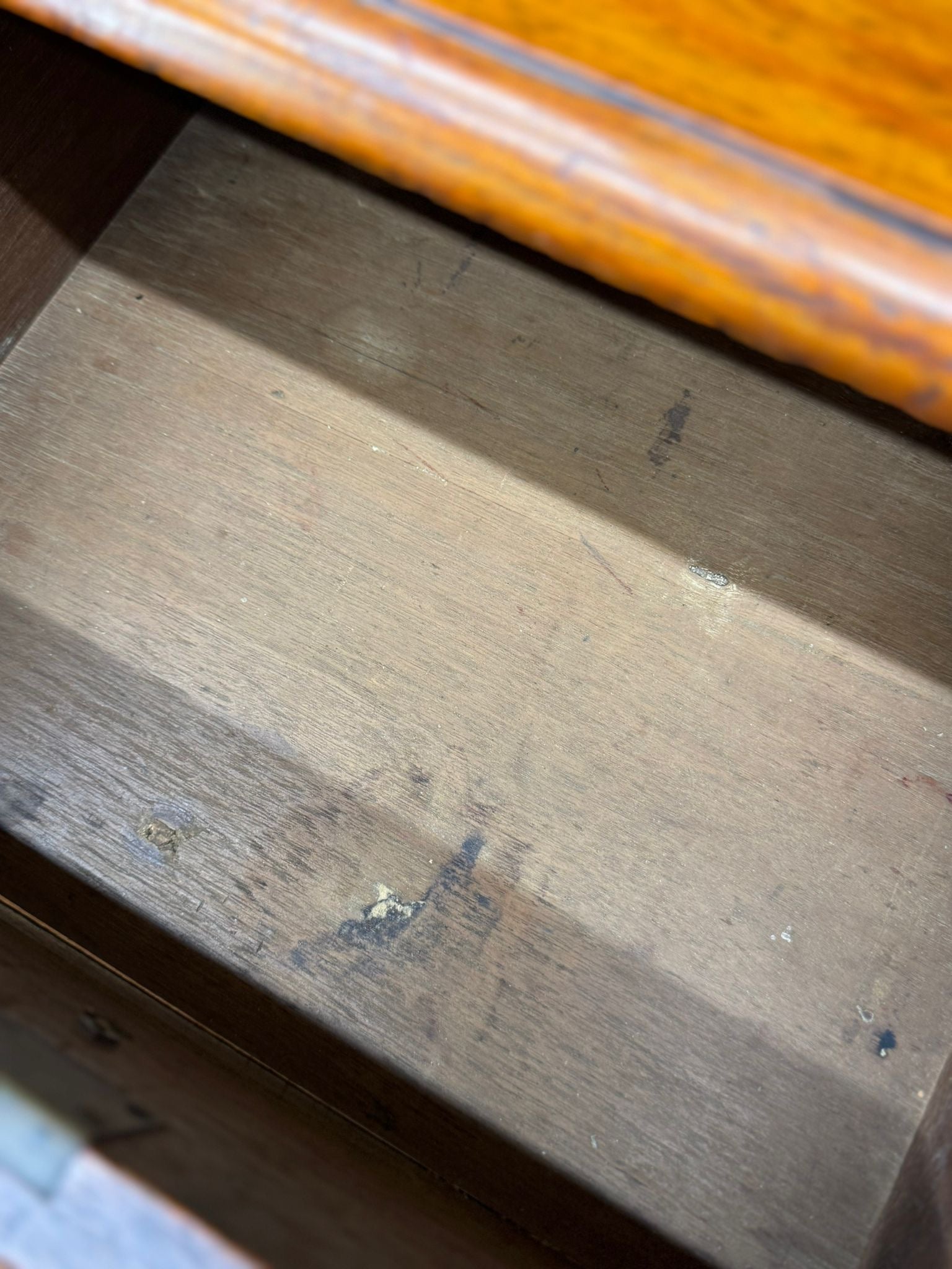 Loads of authentic wear throughout — surface marks, age-related scratches, scattered dark patches on the top, and the drawers show signs of past use (marks to interiors). Nothing that ruins the look; all exactly the kind of lived-in character you expect of a 19th-century chest.