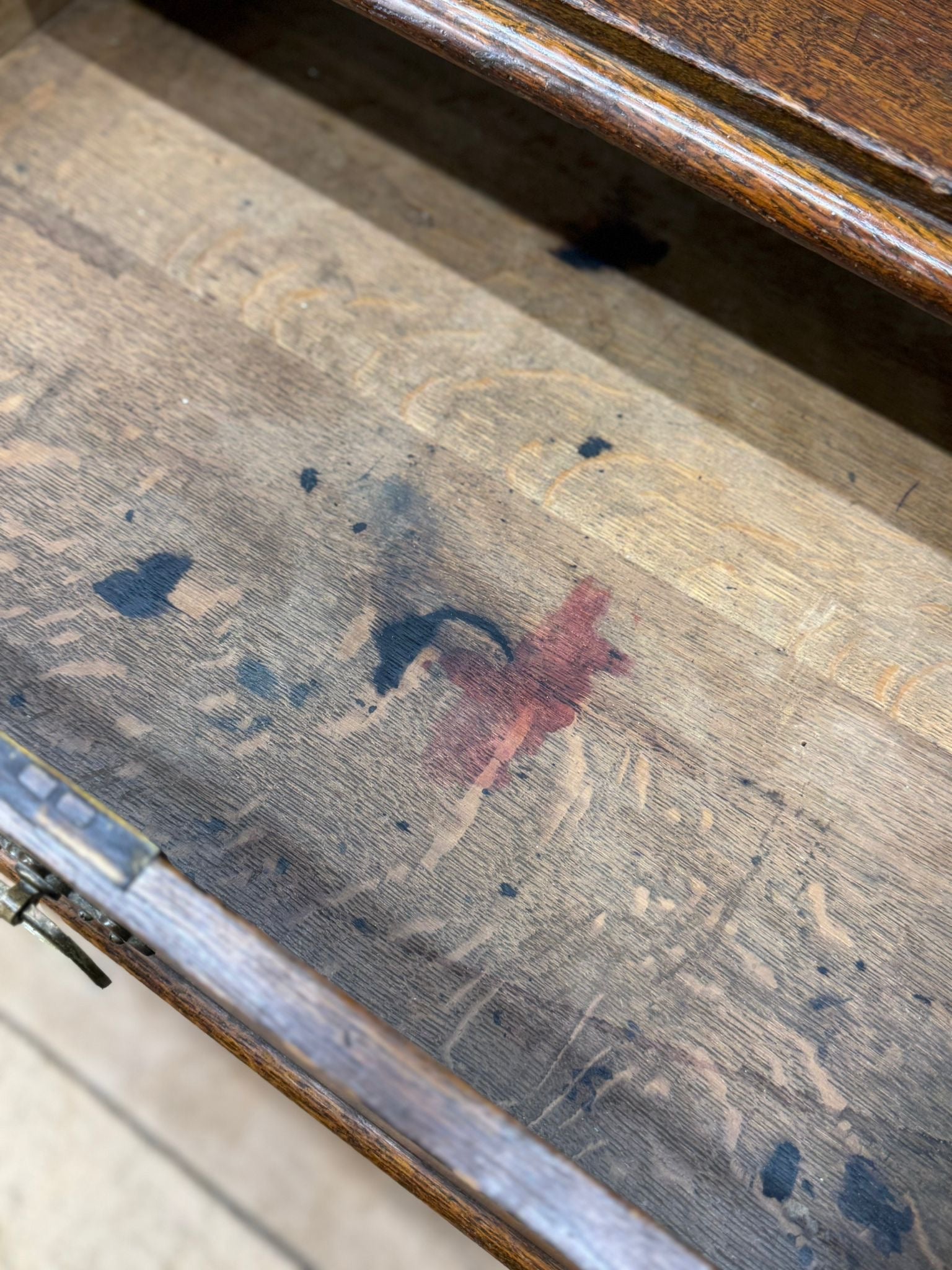 Age-related wear throughout. Ink/dye marks and rubbing to some internal trays. Green baize missing from one of the top drawers and worn on others. Central cupboard shelving no longer present. Small chip to the edge of one door. The top surface shows general Victorian wear but is solid and presentable. Sturdy overall and ready for use.