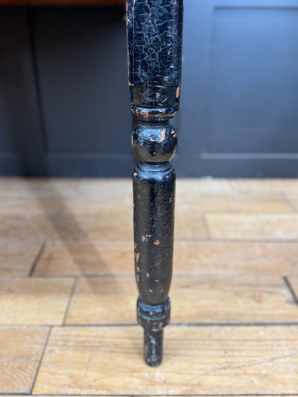 A characterful Victorian pine farmhouse table with a scrubbed top and original black painted base. The turned legs show wonderful age and texture, with layers of crackled paint giving it that authentic, lived-in charm. The top has a beautifully weathered surface - decades of honest wear from daily use and a pale tone that contrasts perfectly with the dark base.