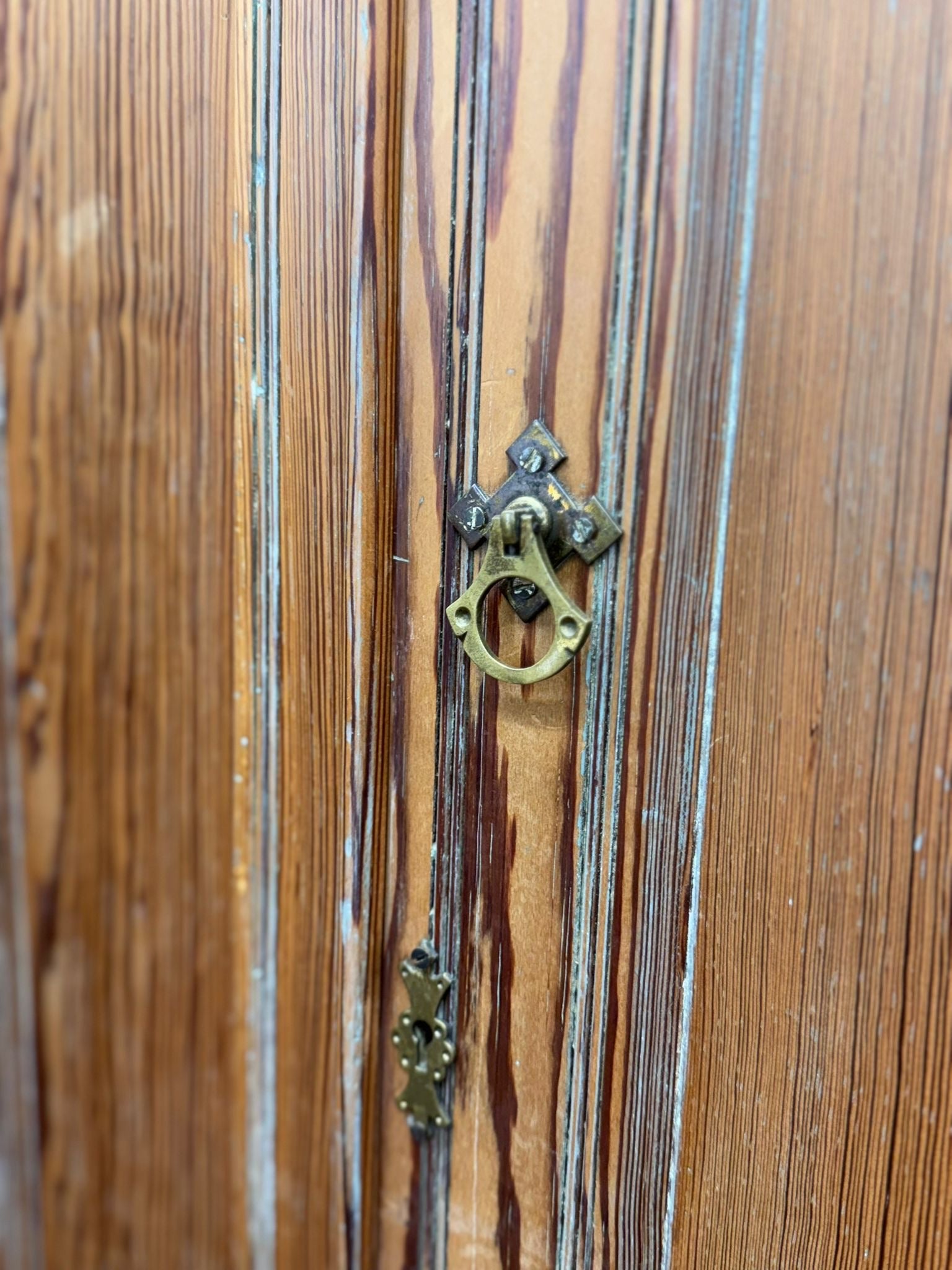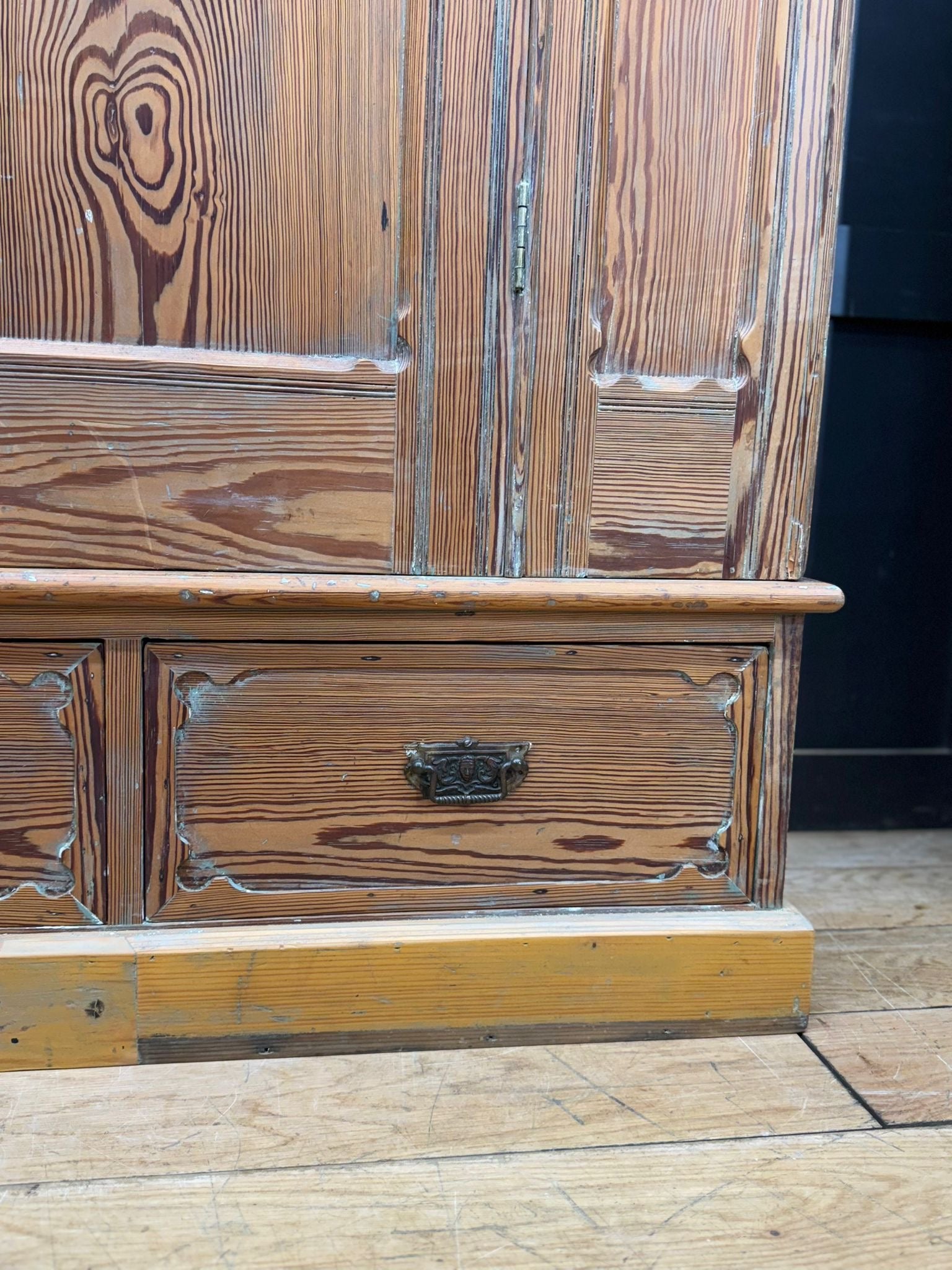 The wardrobe has been previously painted and later stripped; remnants of old paint remain in carvings, grain lines and mouldings.