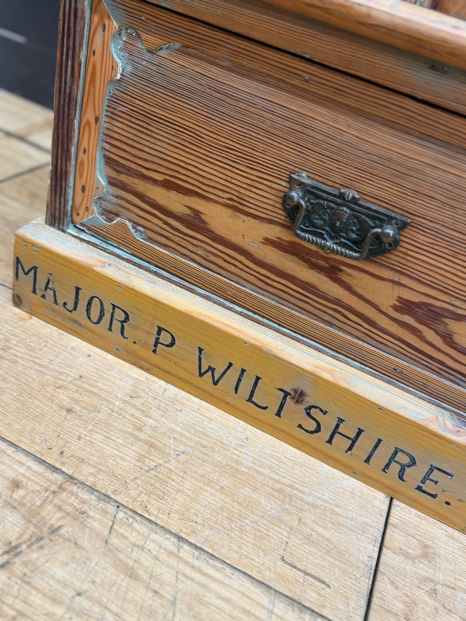 A late Victorian pitch pine single-door wardrobe with twin lower drawers, retaining its original carved details and panelled construction. The base is hand-inscribed “Major P. Wiltshire”, linking it directly to Major Percy Wiltshire of the Royal Field Artillery - born 1873 in Great Yarmouth, son of a local solicitor, commanding officer of the 251st Siege Battery in the First World War, and killed in action in France in April 1917.