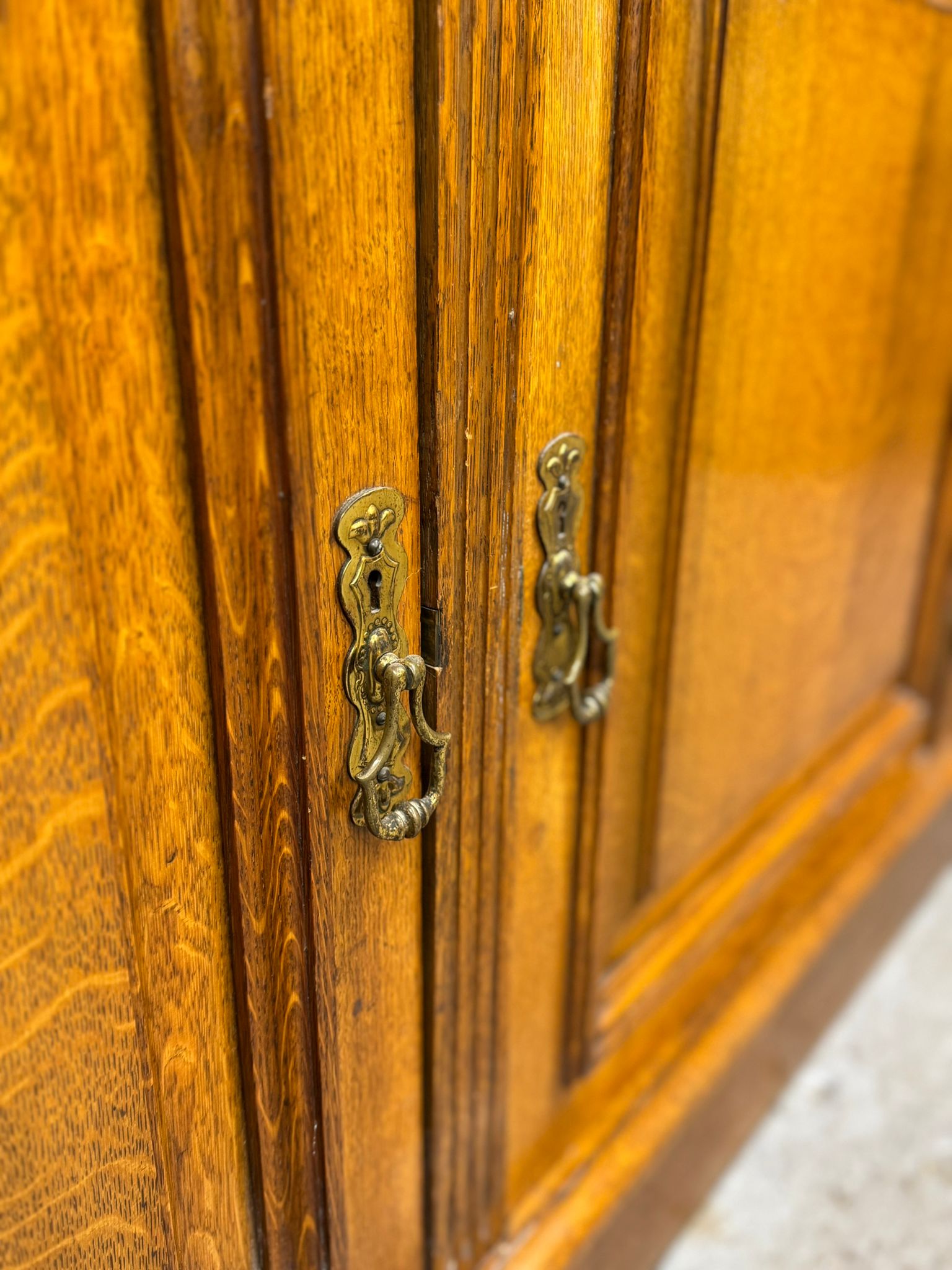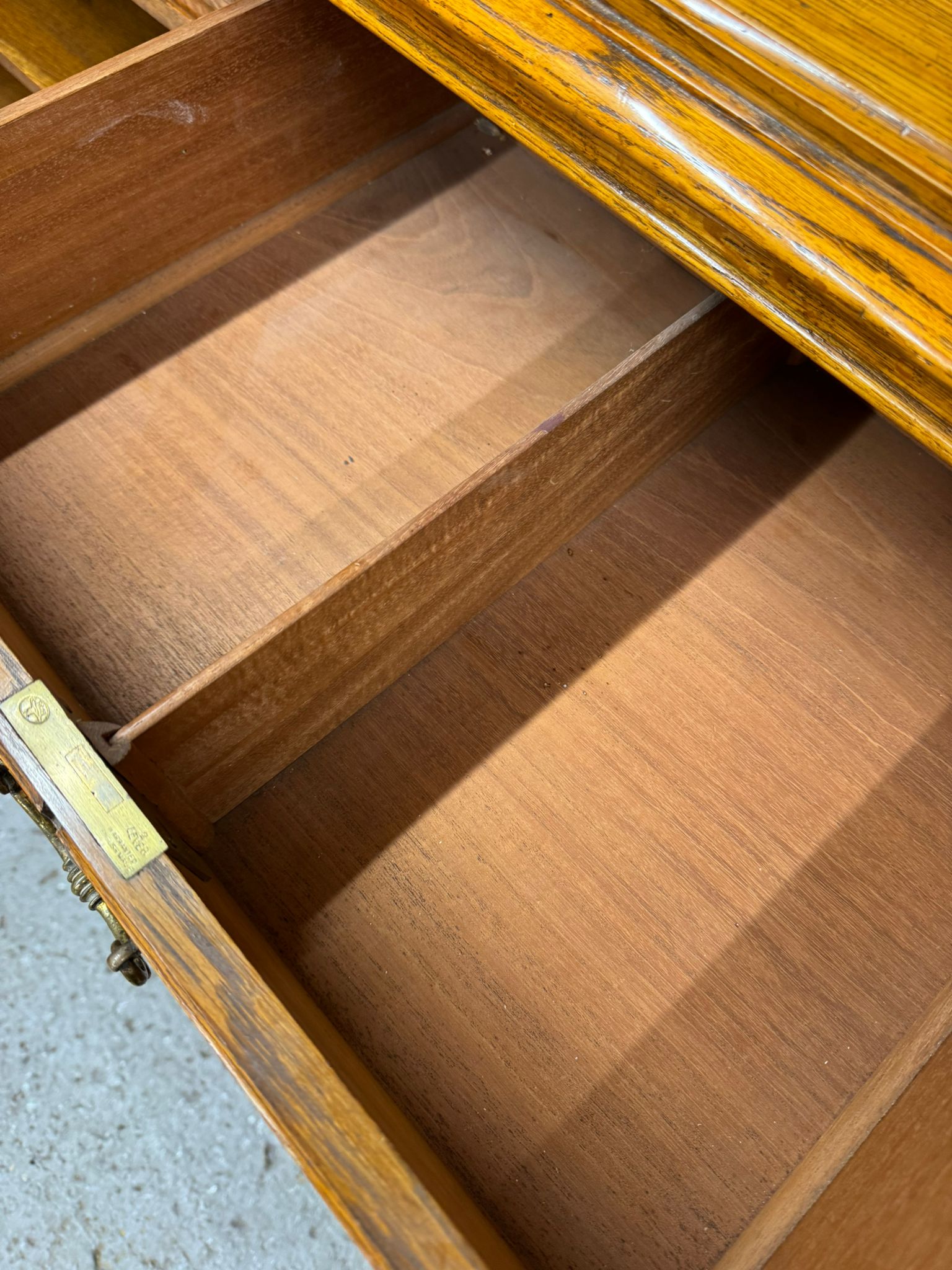 Very good overall condition with only minor surface marks in line with age and use. All drawers and doors operate smoothly, shelves are sturdy and adjustable, and the brass retains a warm aged patina.