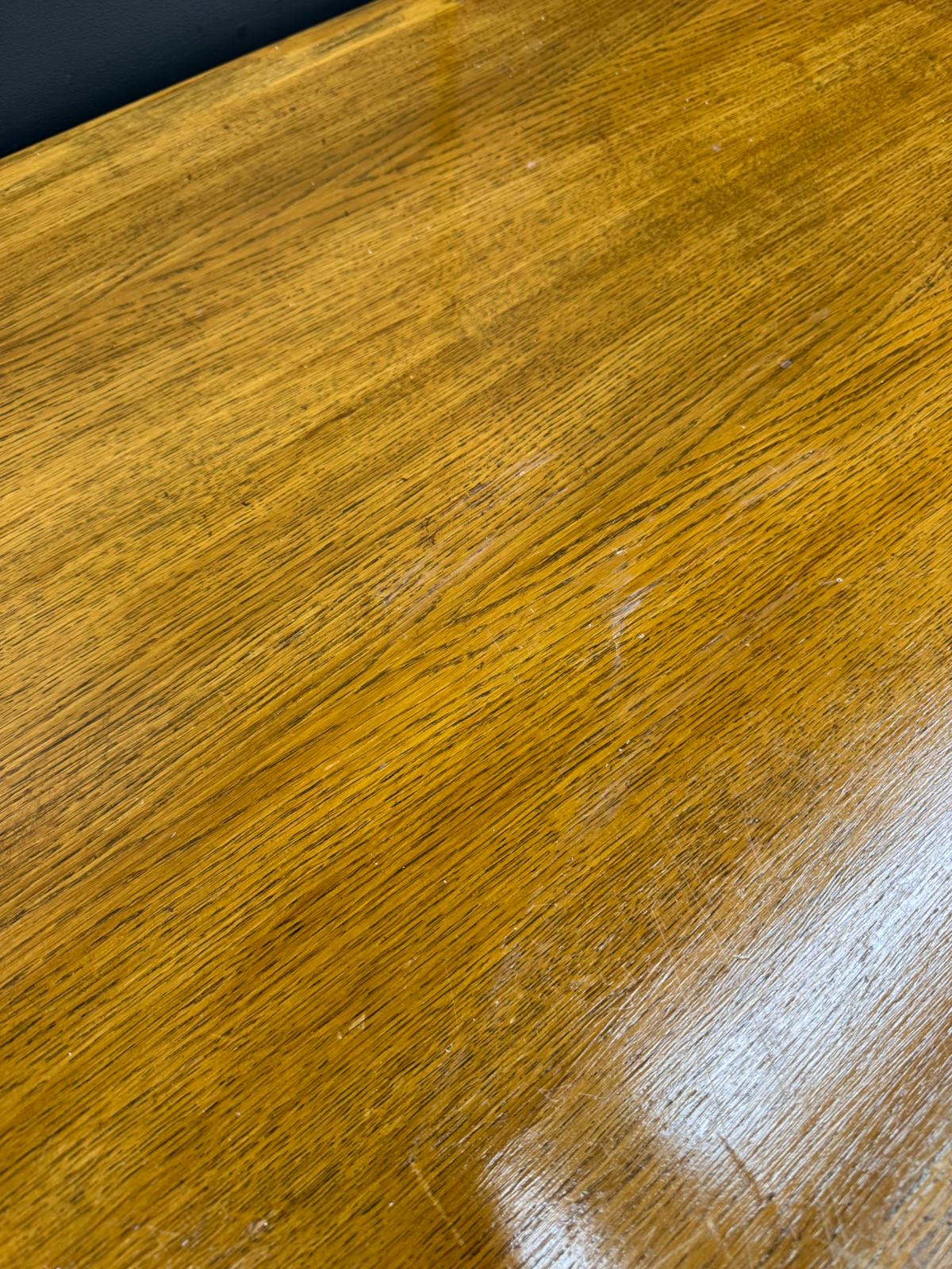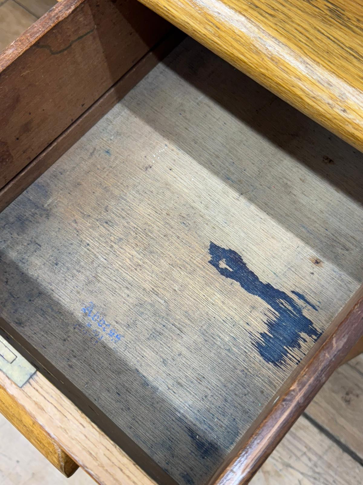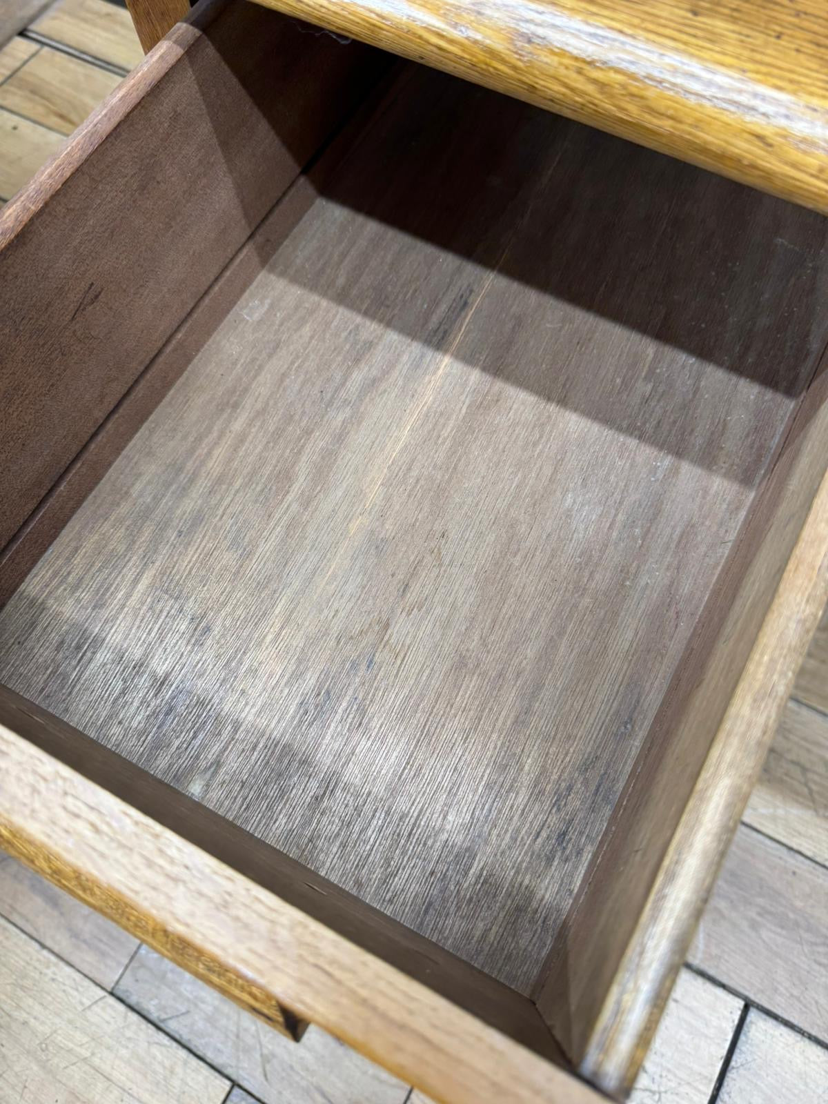 Solid and sturdy with good patina. The top shows light age-related wear and surface marks, and the drawers have some old ink stains inside — all part of its authentic, well-used vintage character. Drawers run smoothly and the oak grain has a lovely warm tone.