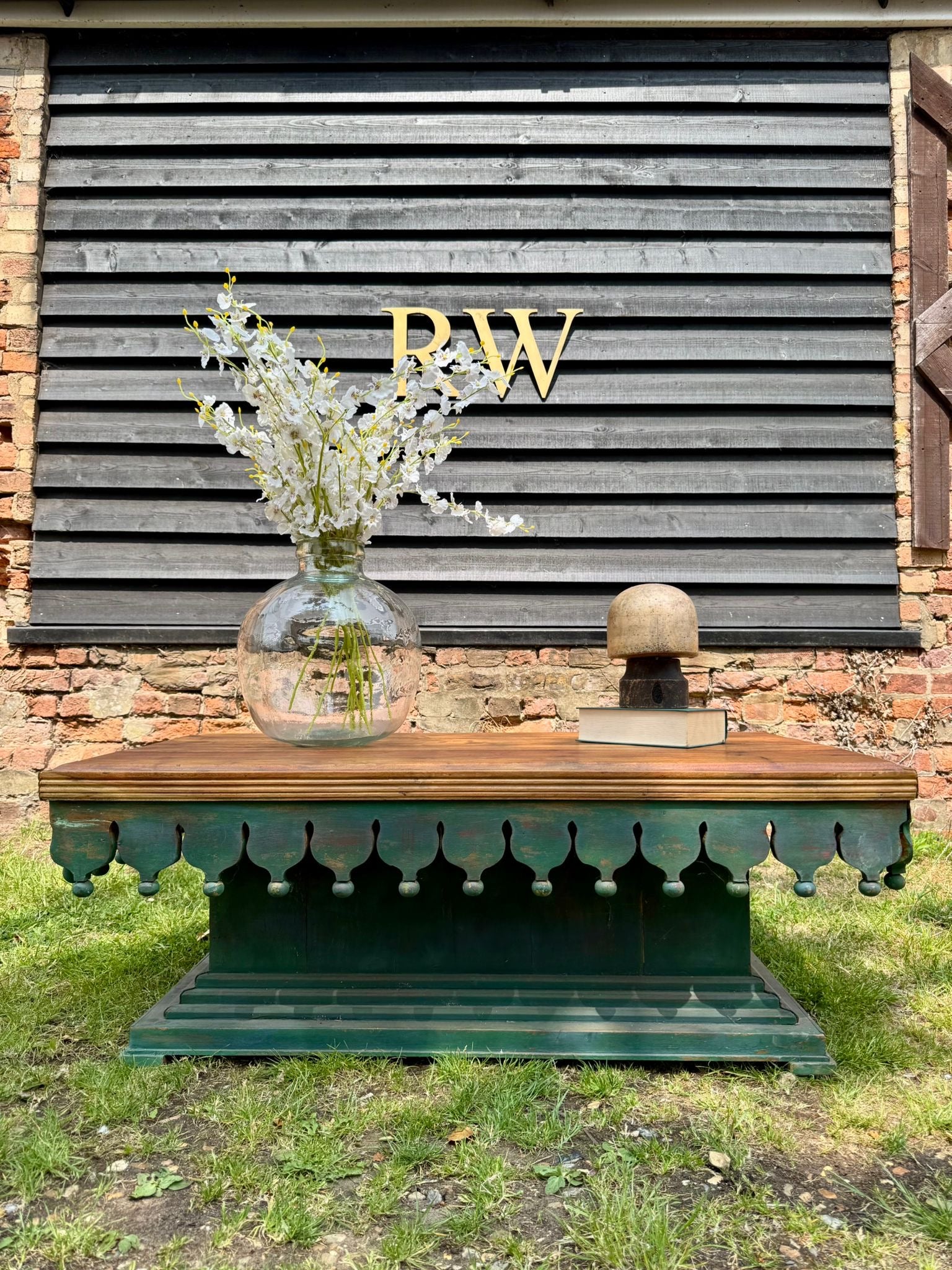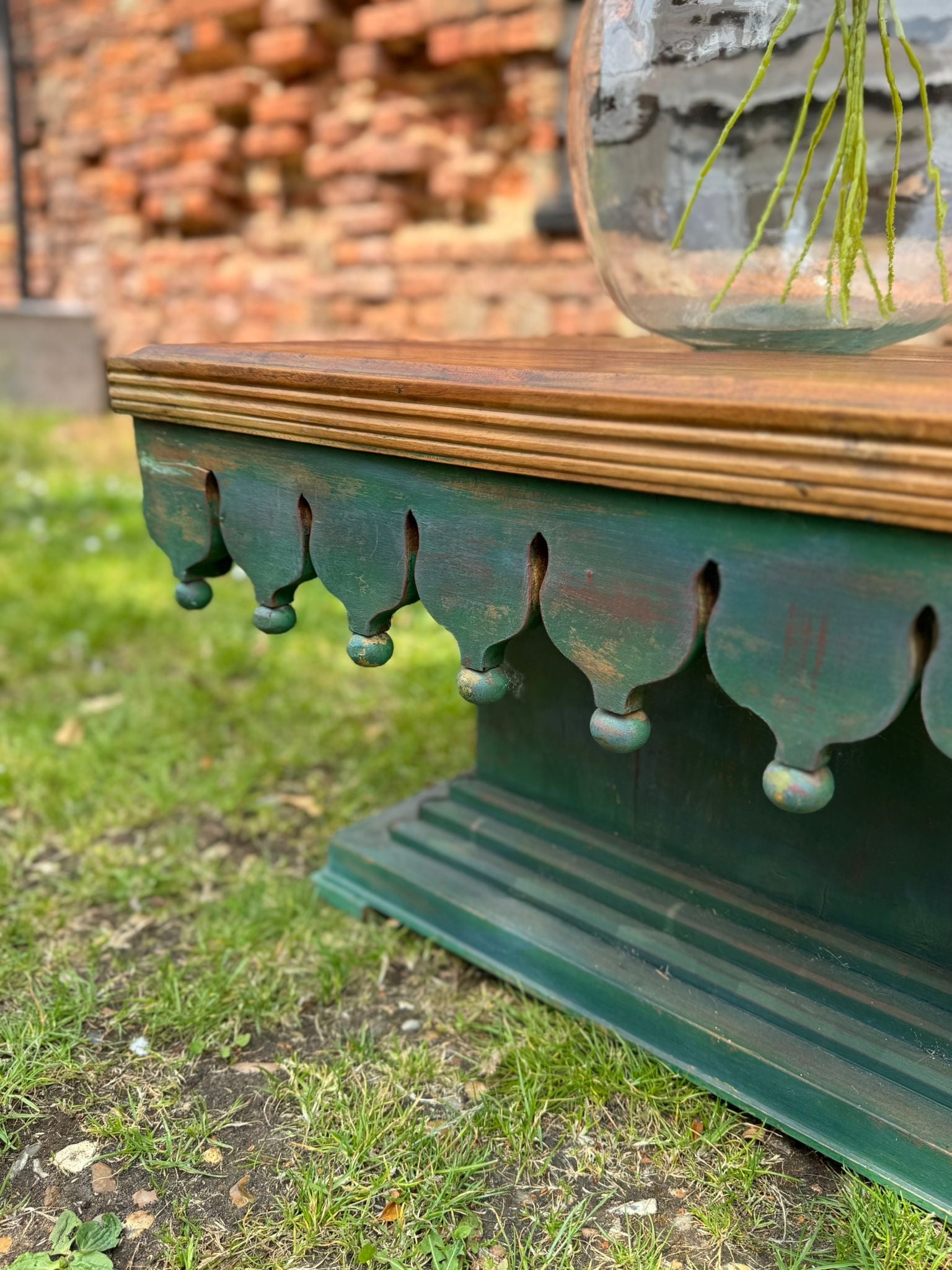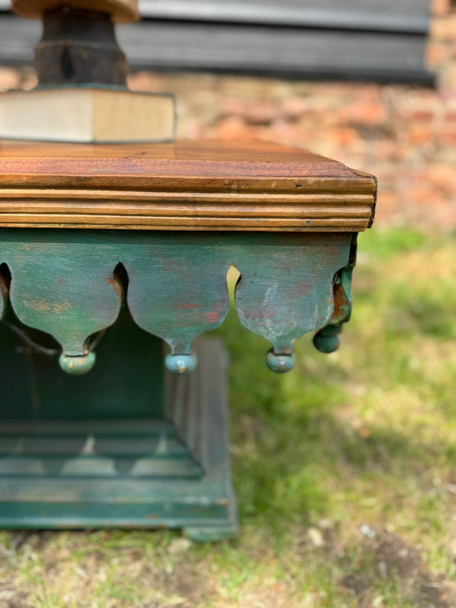 Statement vintage-style coffee table with hand-carved scalloped skirt detail and distressed green painted base. The top is solid hardwood with a deep, warm grain and satin finish – offering a striking contrast to the distressed boho base.