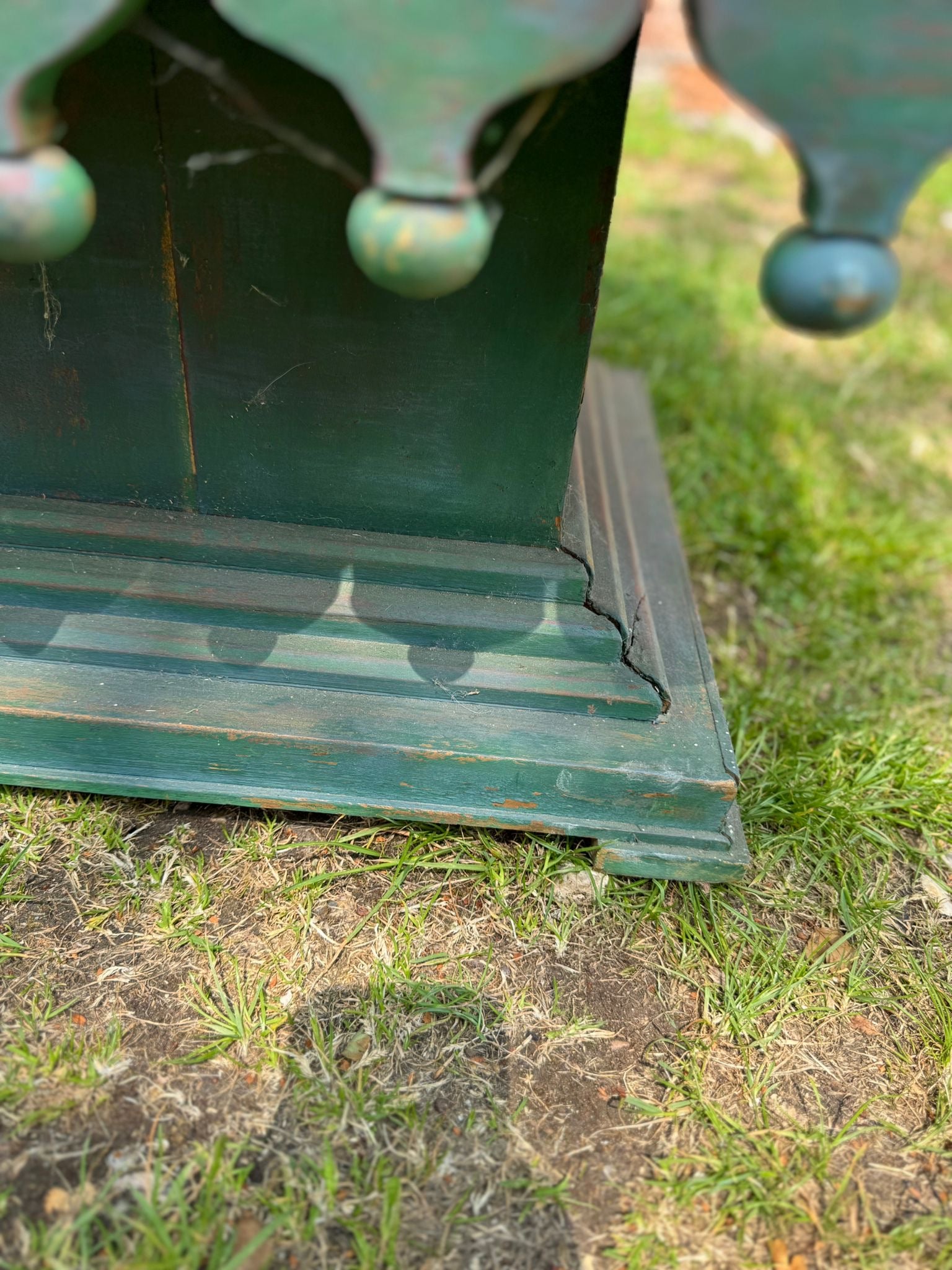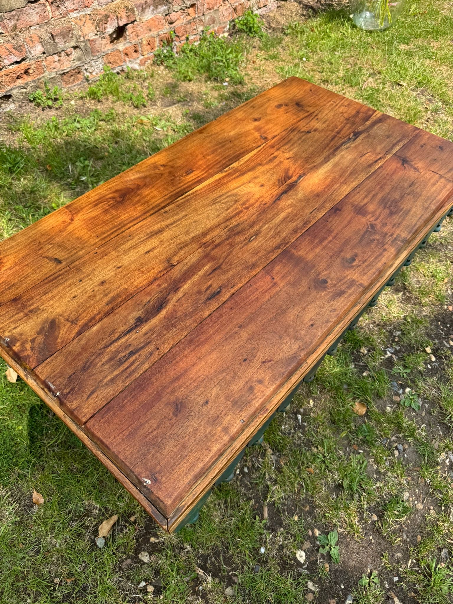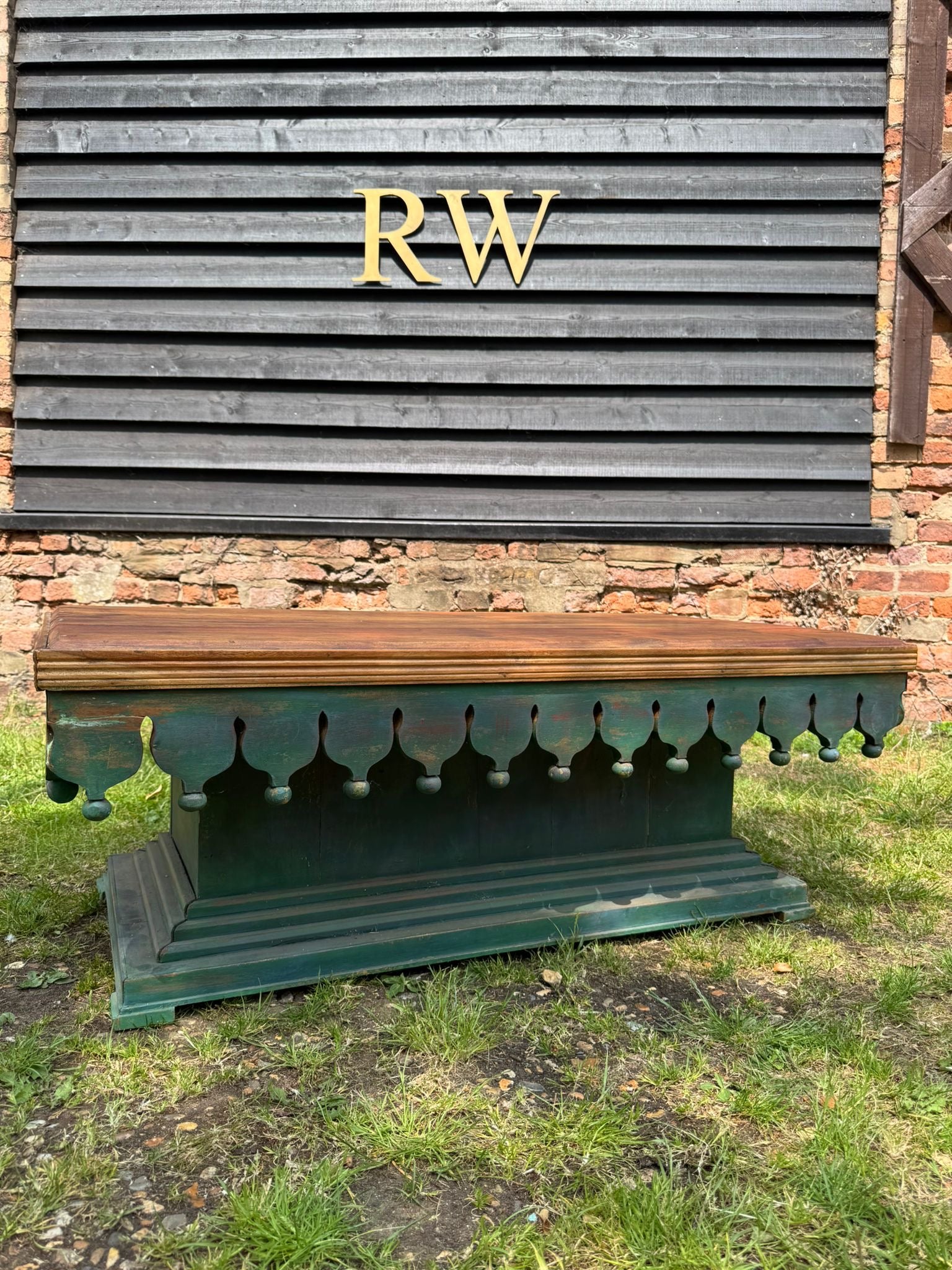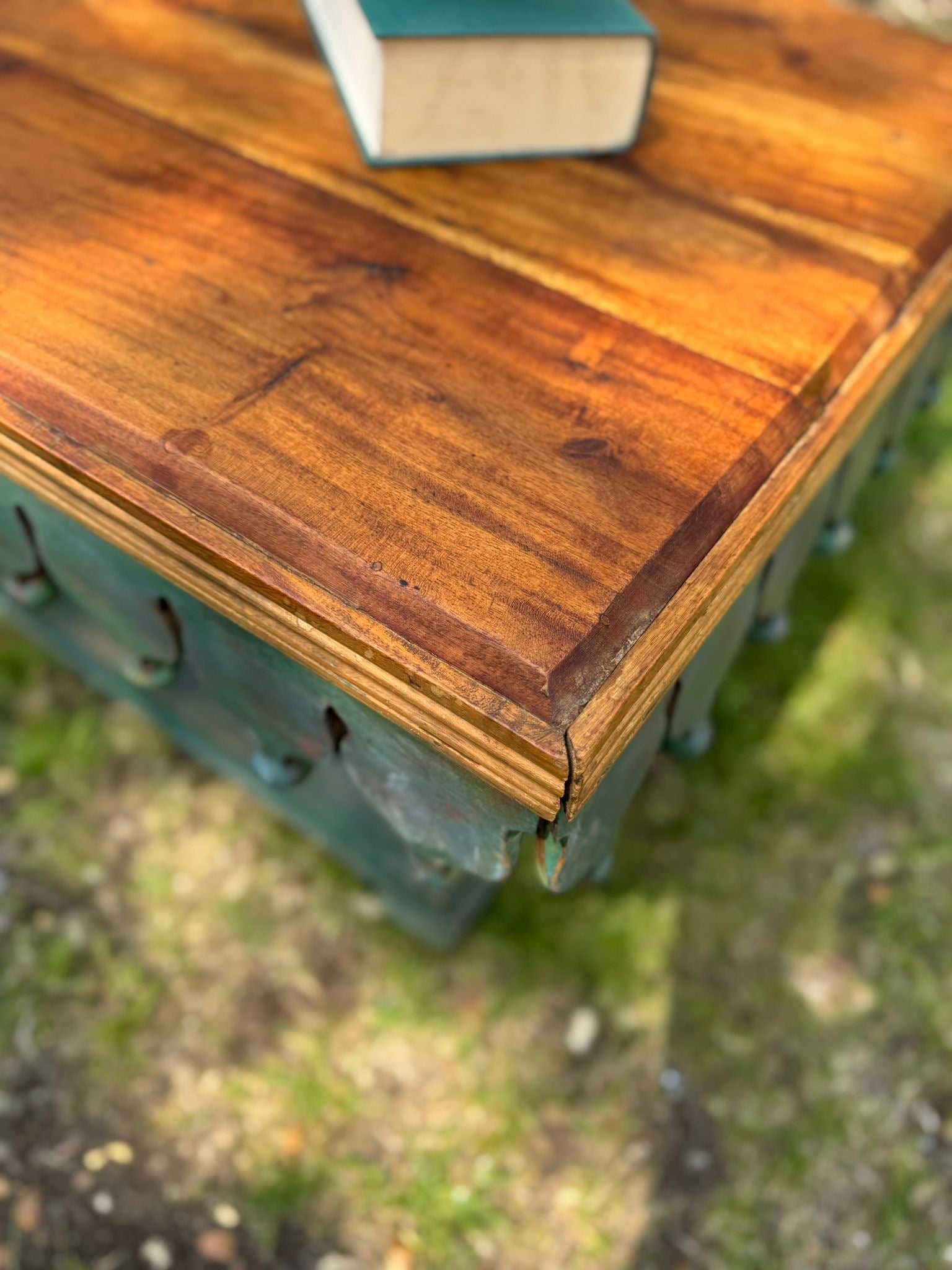 Statement vintage-style coffee table with hand-carved scalloped skirt detail and distressed green painted base. The top is solid hardwood with a deep, warm grain and satin finish – offering a striking contrast to the distressed boho base.