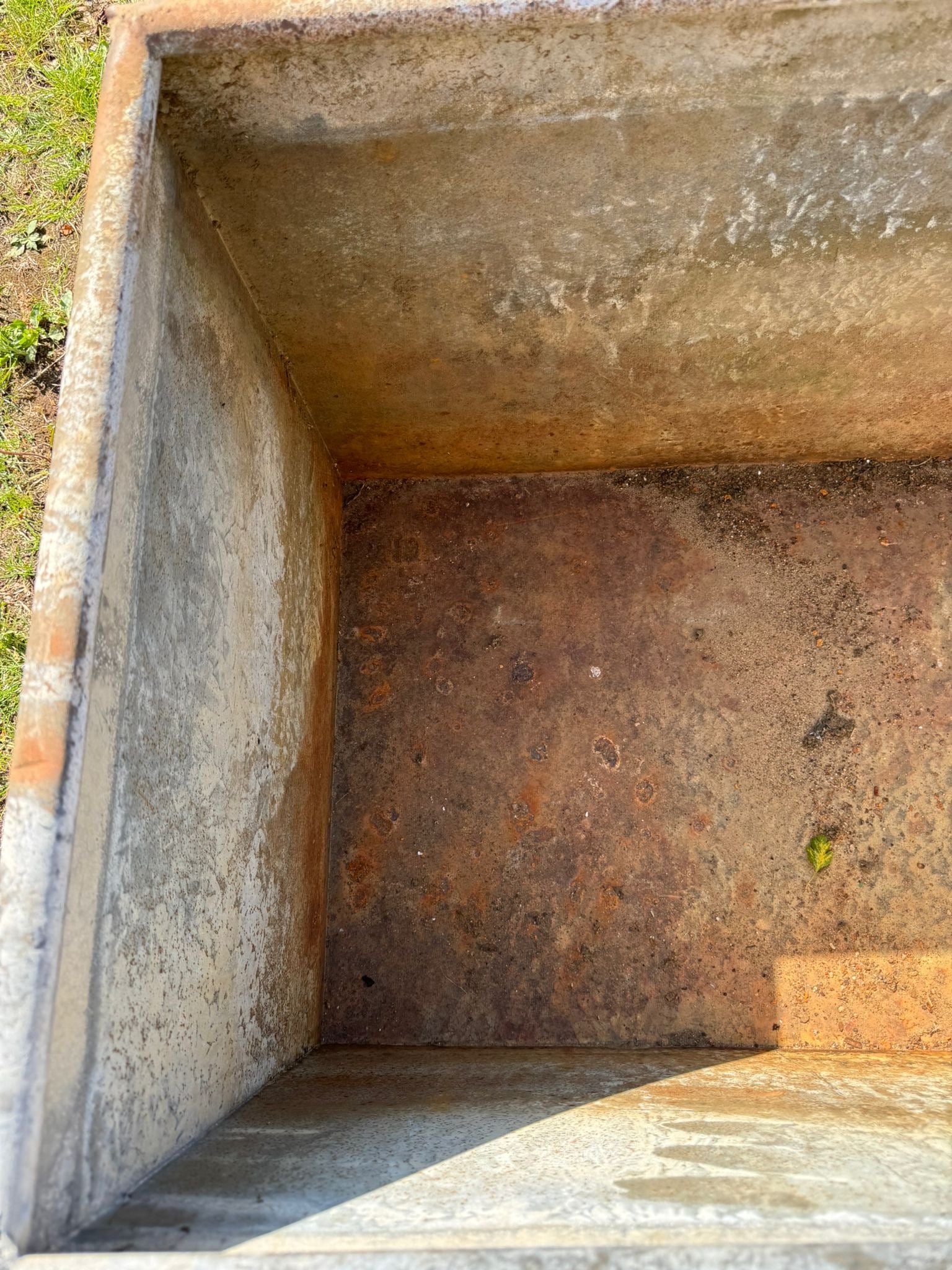 A well-made very long and very heavy galvanised metal trough/ planter. Its rustic grey finish and heavy construction make it perfect for showcasing your favorite trees, plants or even work as a fish pond. This trough adds a timeless, rustic appeal to any outdoor space. Durable and robust, it's designed to withstand the elements while enhancing your garden decor.