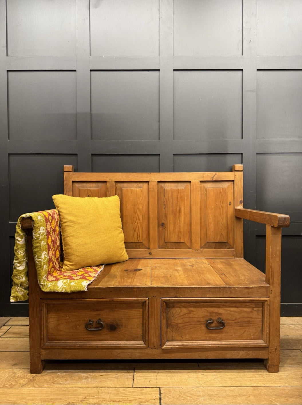 A solid pine settle in a traditional country style, offering a generous seating area and two deep storage drawers beneath. Nicely panelled back, simple square arms and warm honeyed colouring throughout. A practical, rustic piece that works well in hallways, kitchens or boot rooms.