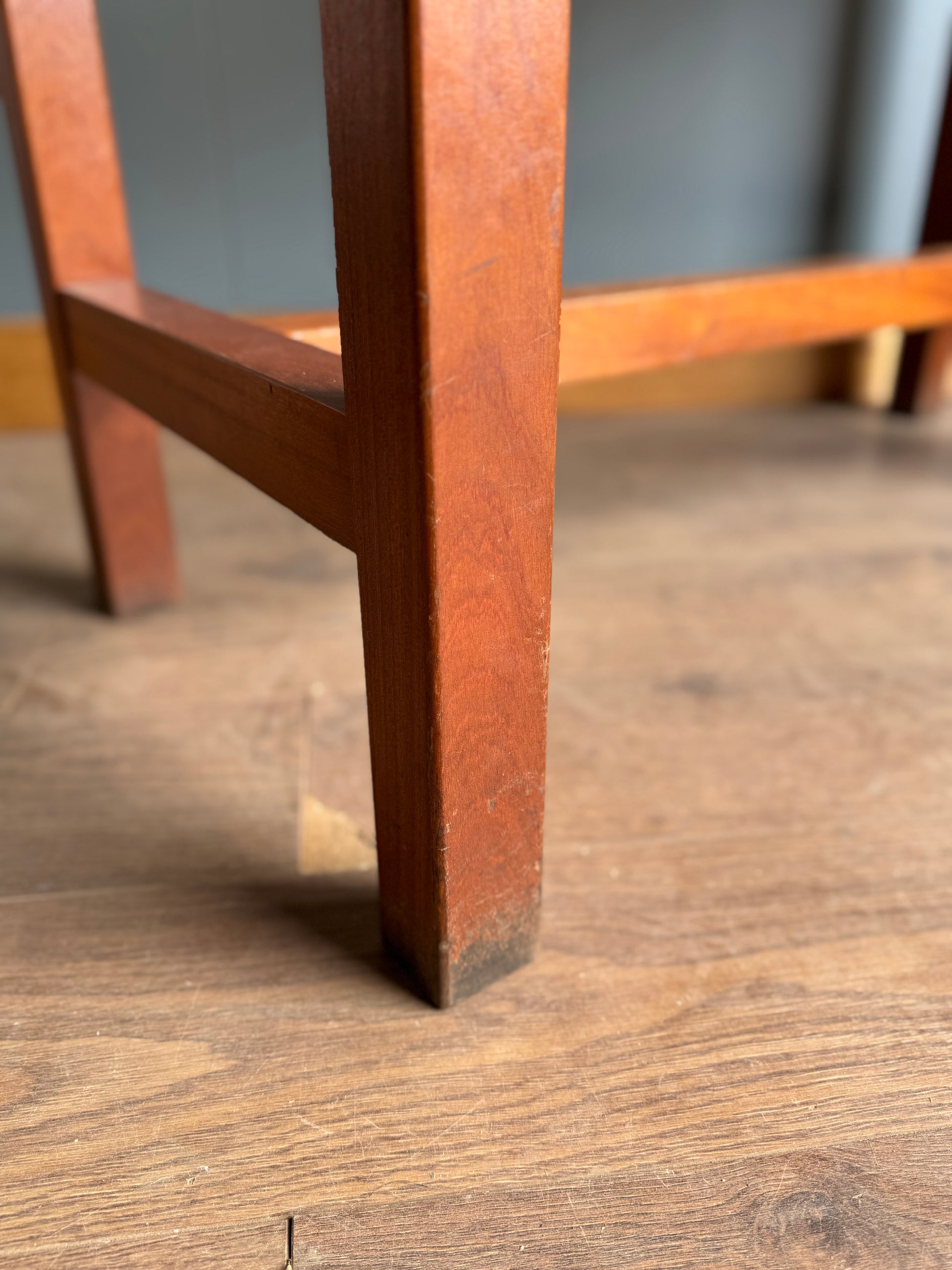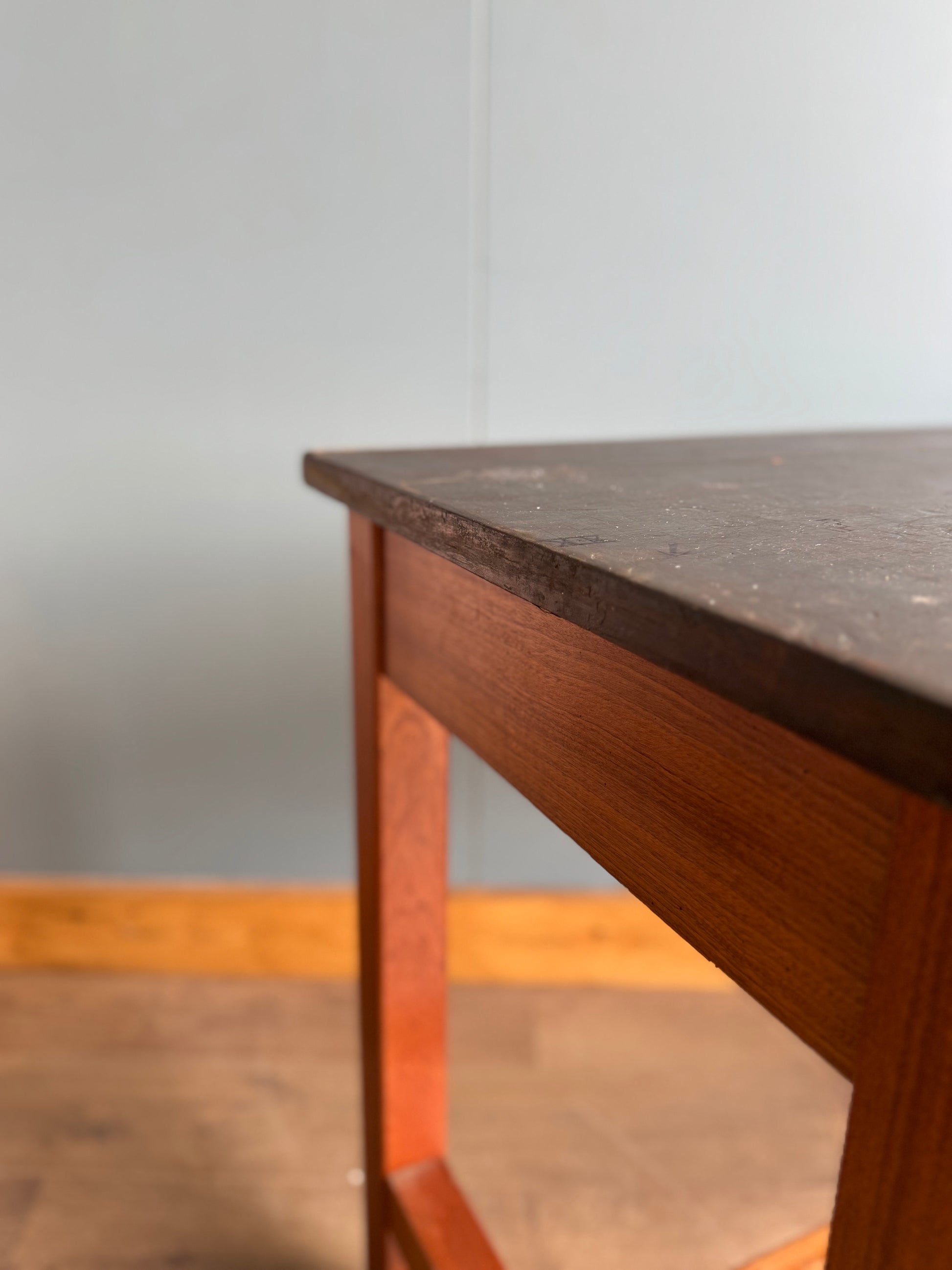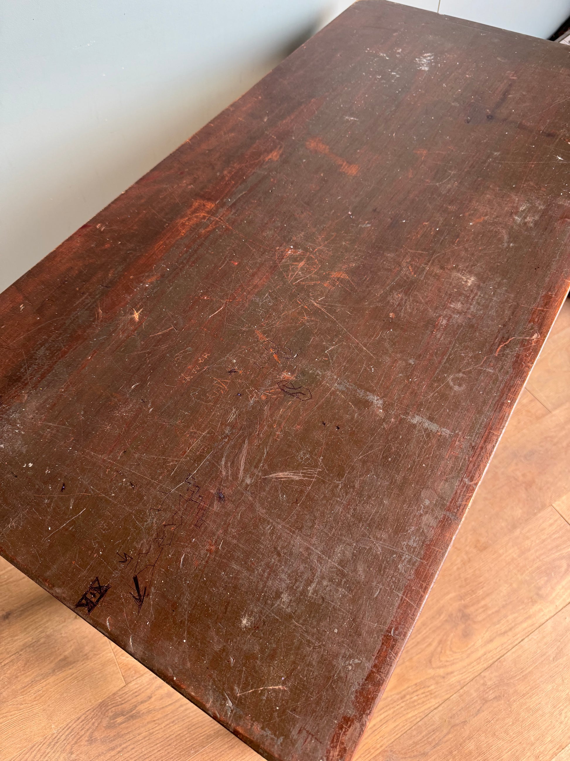 Vintage school science lab bench with solid Iroko hardwood top and beech frames — proper old-school build, heavy, sturdy, and full of character. Ideal as kitchen islands, prep tables, craft benches or workstations.