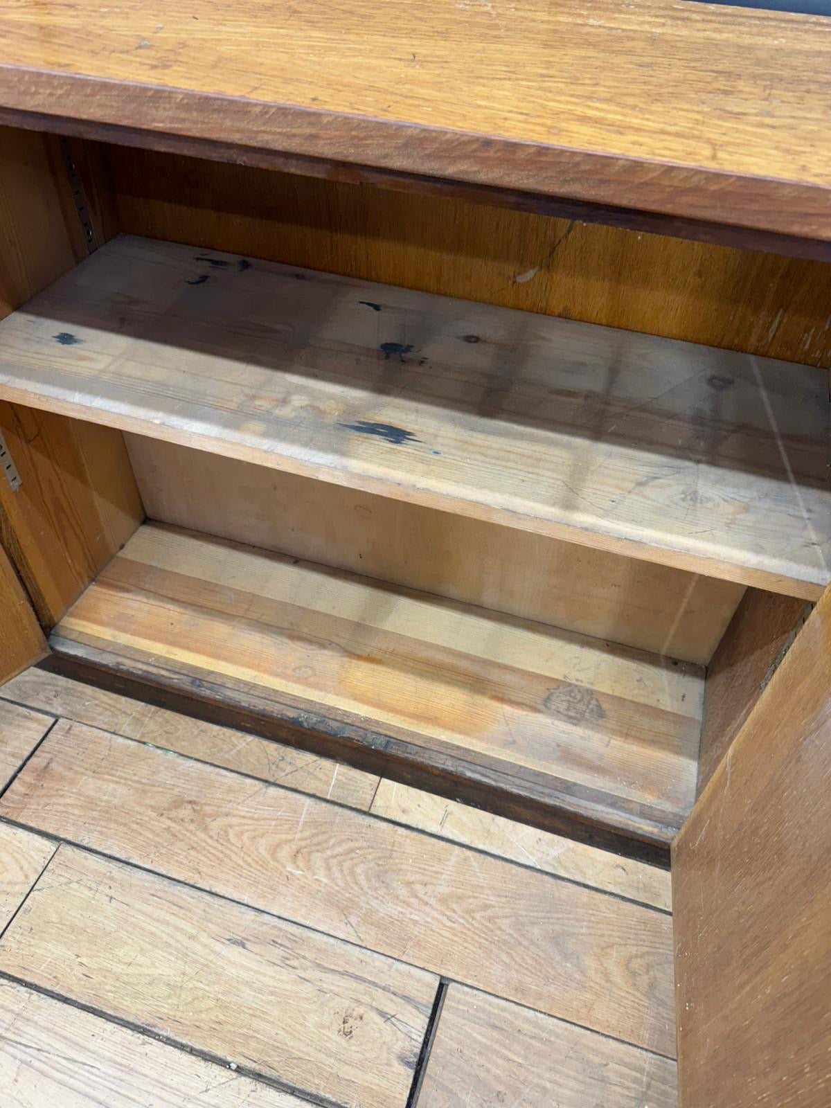 Solid and sturdy. Marks, scratches and age-related wear to the iroko top as shown. The back has been adapted and infilled with pine. Doors open well and internal shelves are strong and adjustable. Honest wear throughout adds to its authentic industrial charm.
