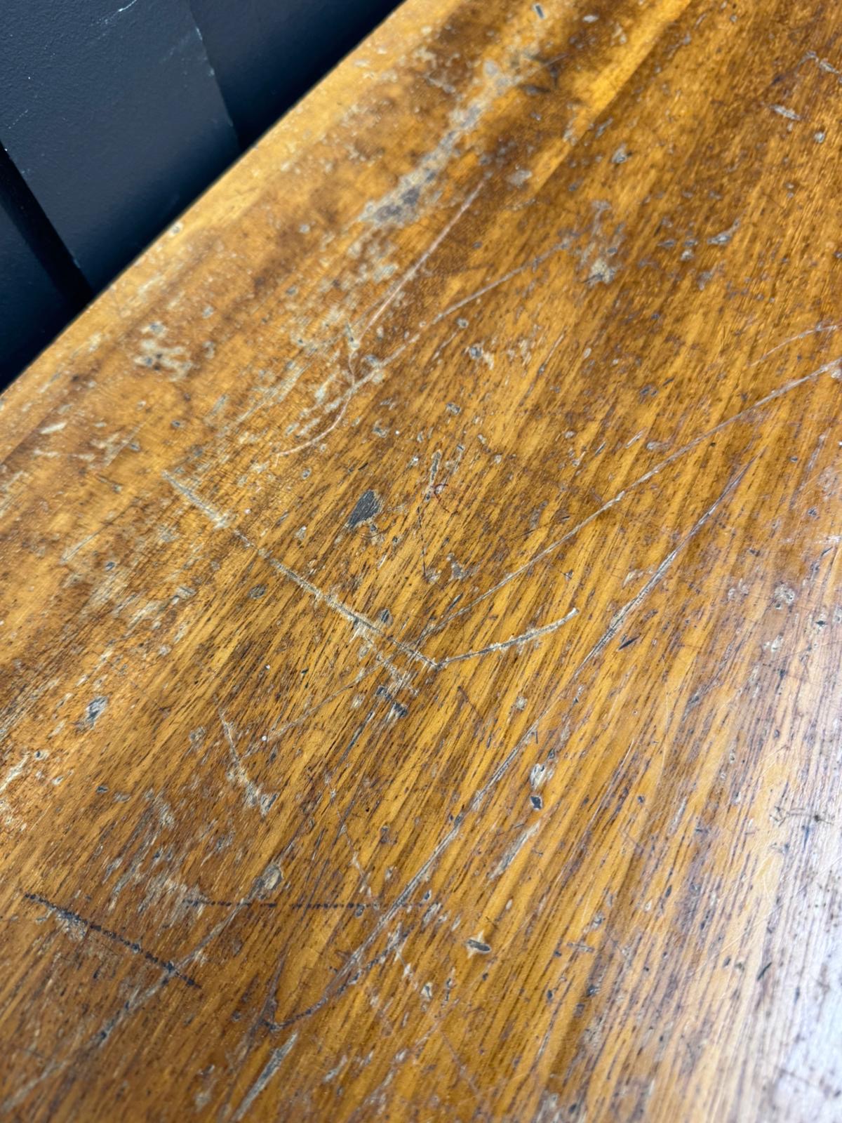 It features a solid iroko top — the same durable hardwood used in traditional lab benches — with lovely wear, patina and scratch marks from decades of school use.