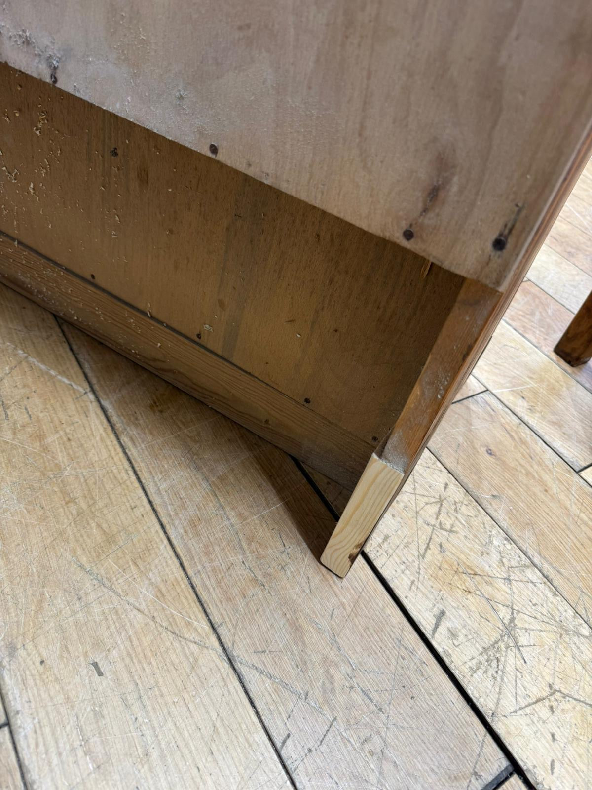 The back is stepped, originally designed to fit neatly over pipework in a laboratory. Later, some pine offcuts have been added to create a full, flat base, making it perfectly usable in any interior today.
