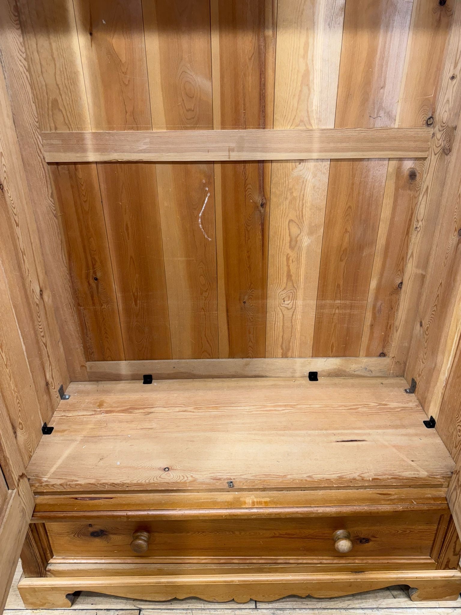 Constructed in solid pine throughout, the interior is fitted with a hanging rail, offering practical storage for everyday use. The natural pine finish shows attractive grain and colour, making this a versatile and easy-to-place piece.